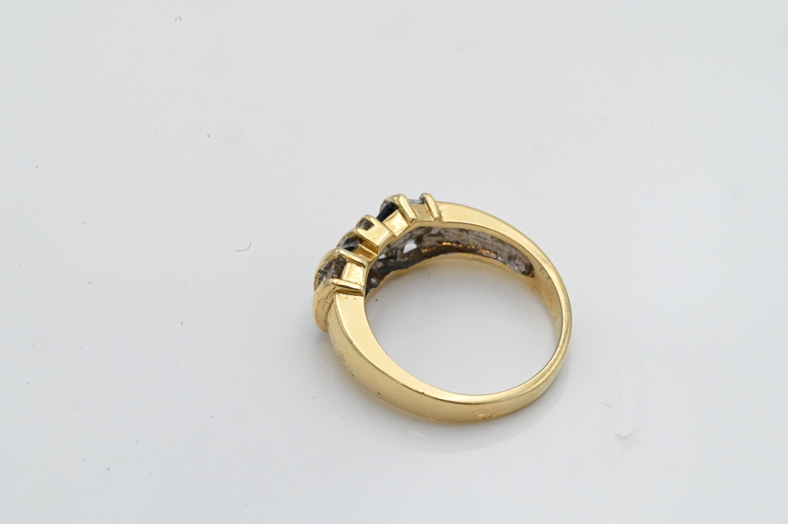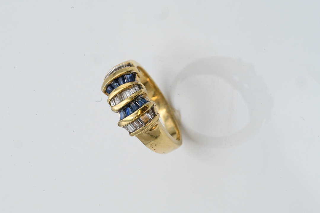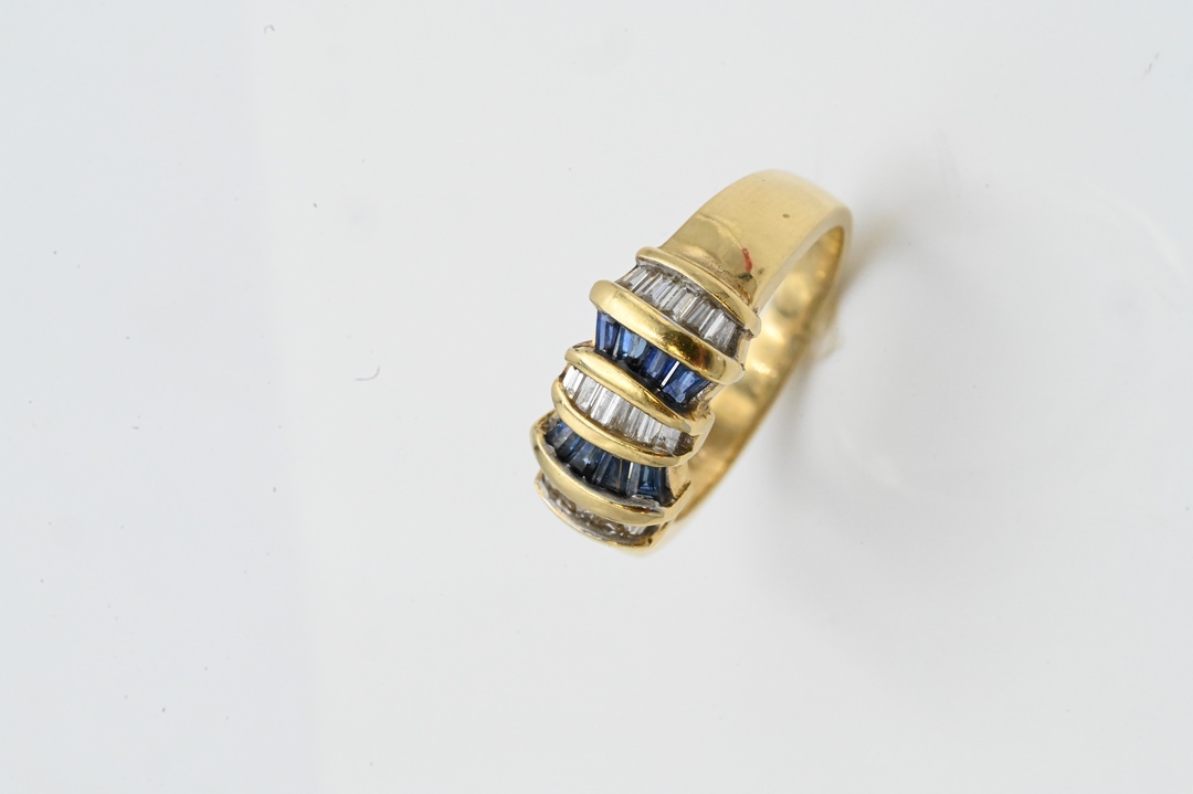 14 Karat Yellow Gold Ring set with two rows of baguette sapphires along with three rows of baguette diamonds size 7, 5.8 grams Condition: marked 14K, good condition
