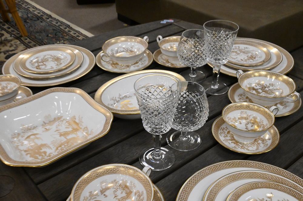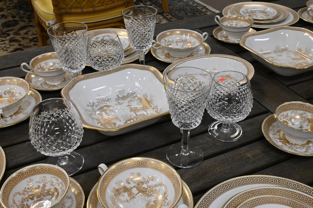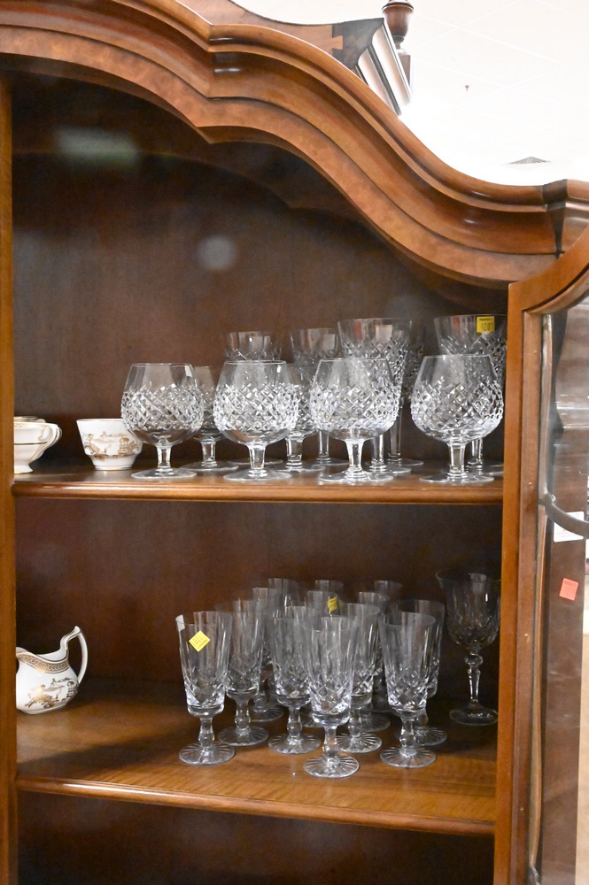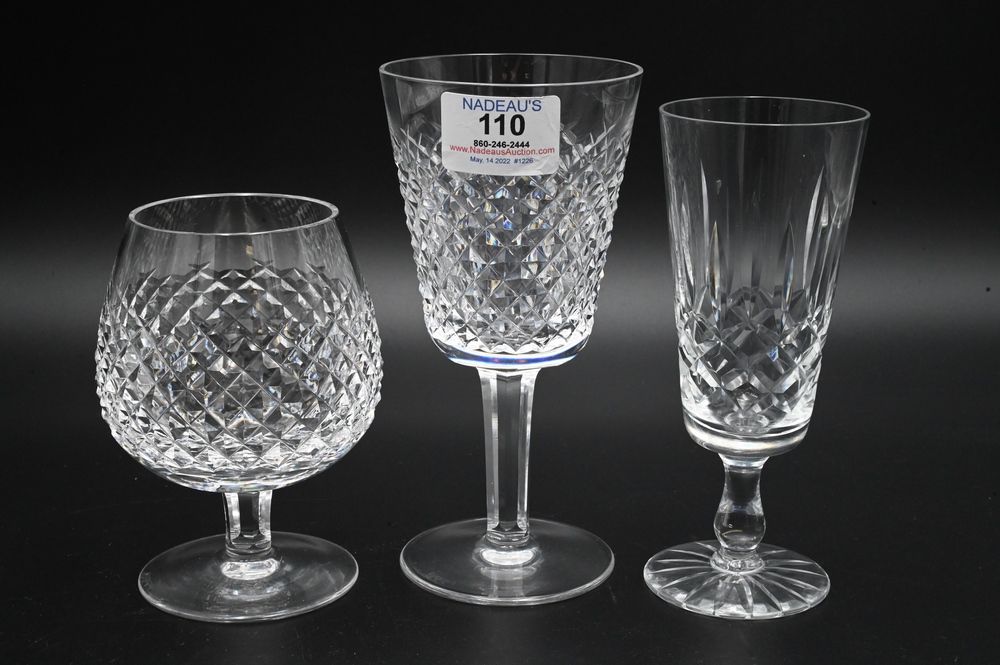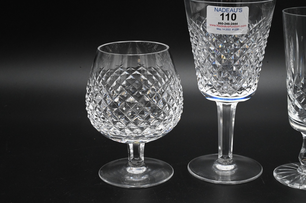 Lot 110: 39 Piece Waterford Crystal Set, Alana pattern, to include 12 goblets, 12 snifter glasses, 14 champagne flutes, along with one cup.
