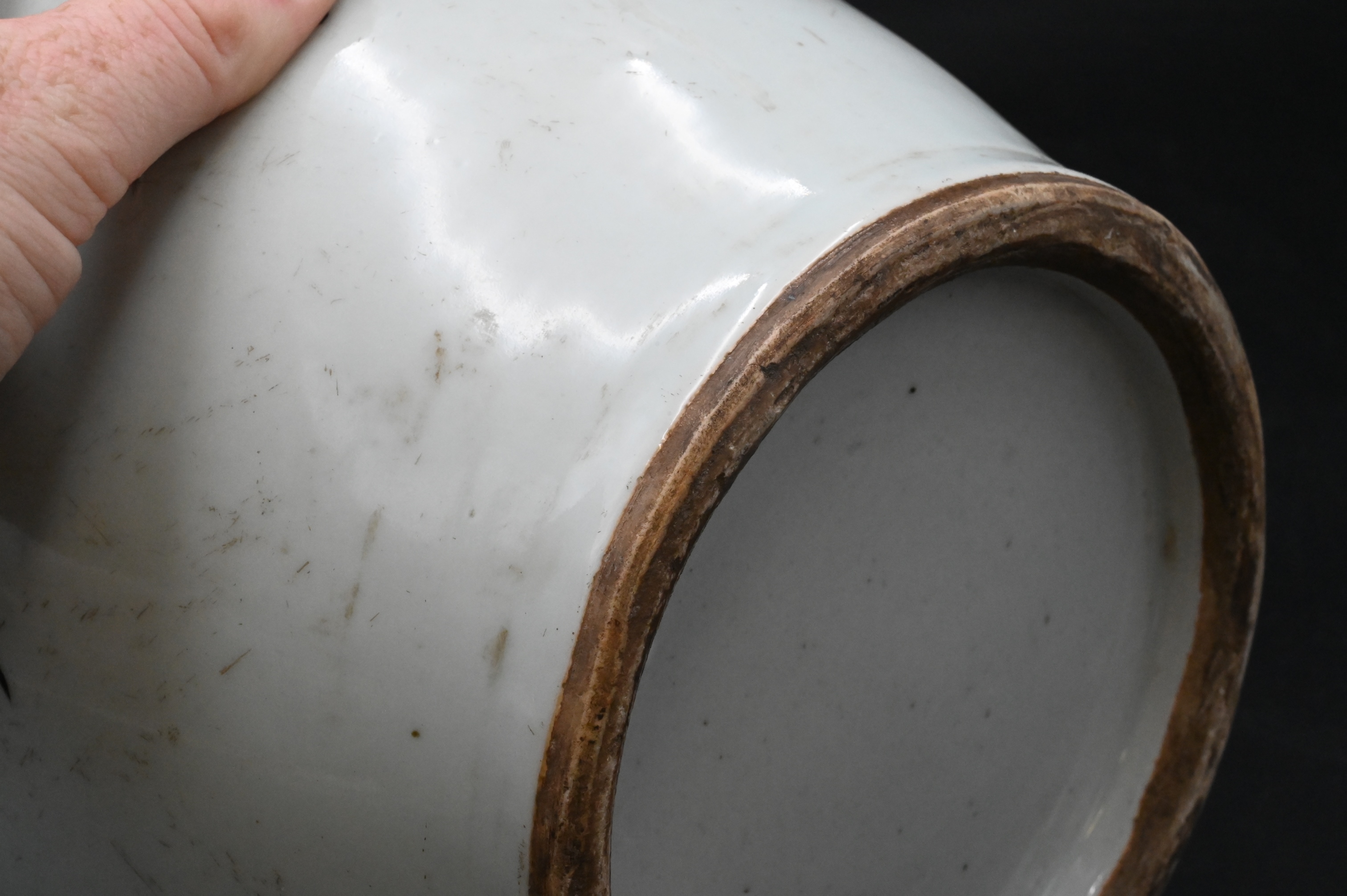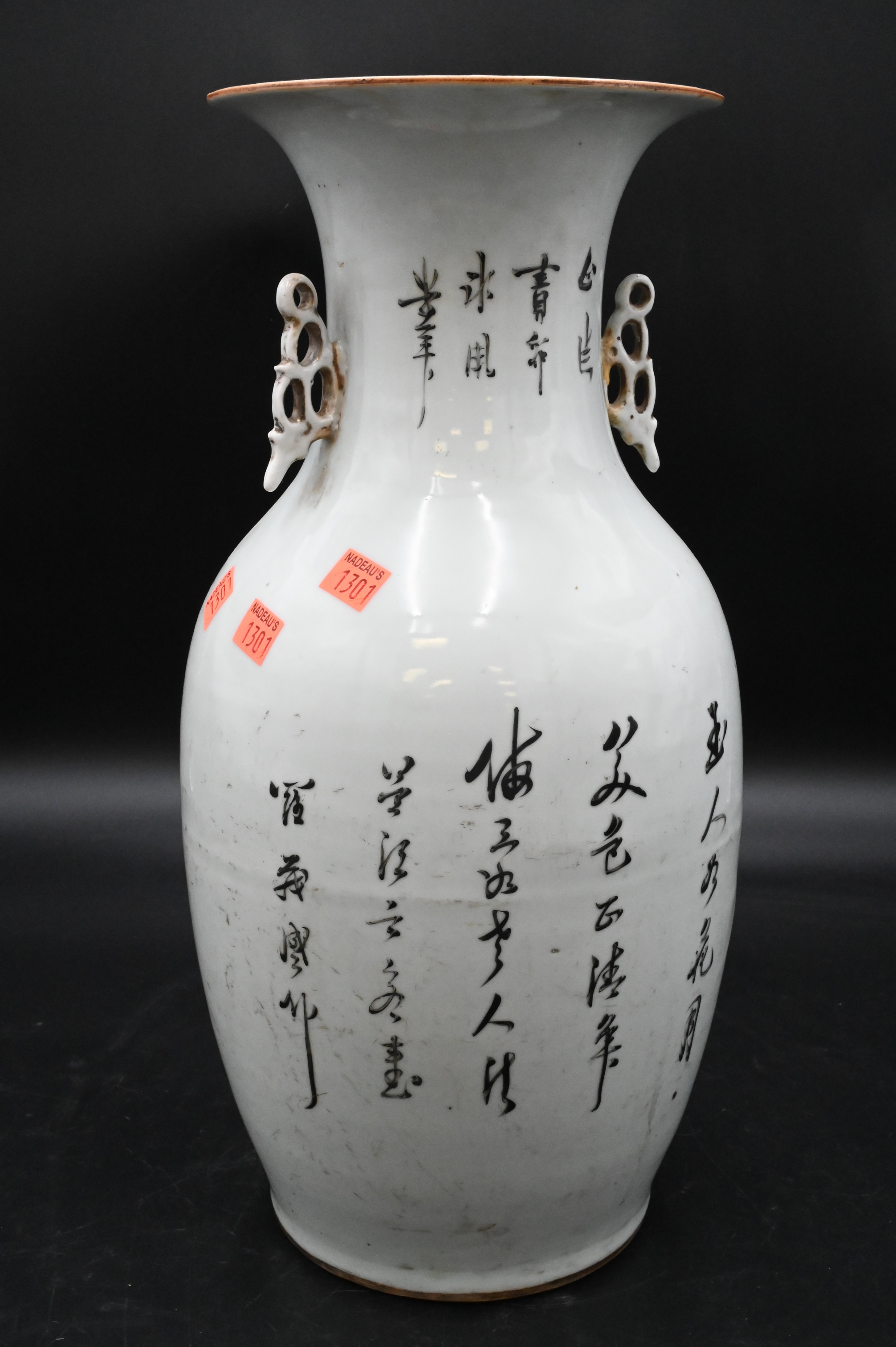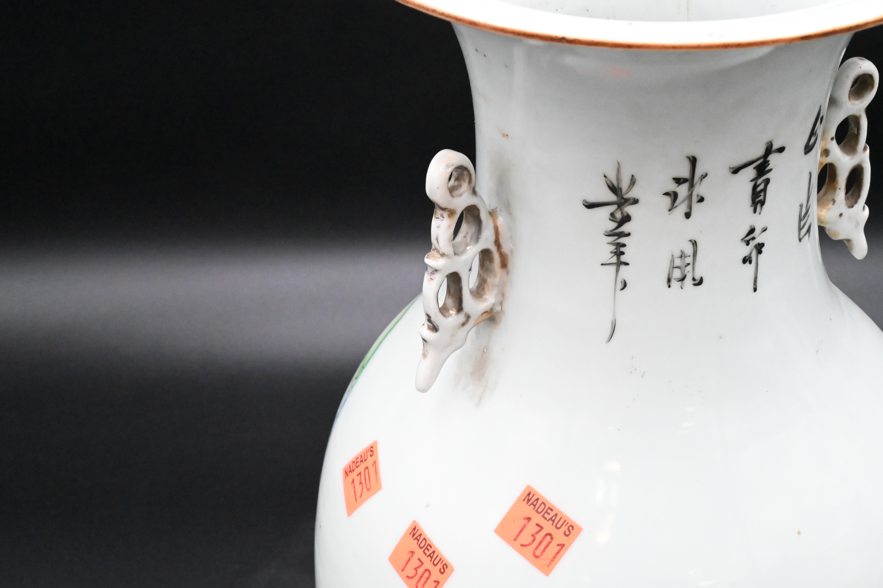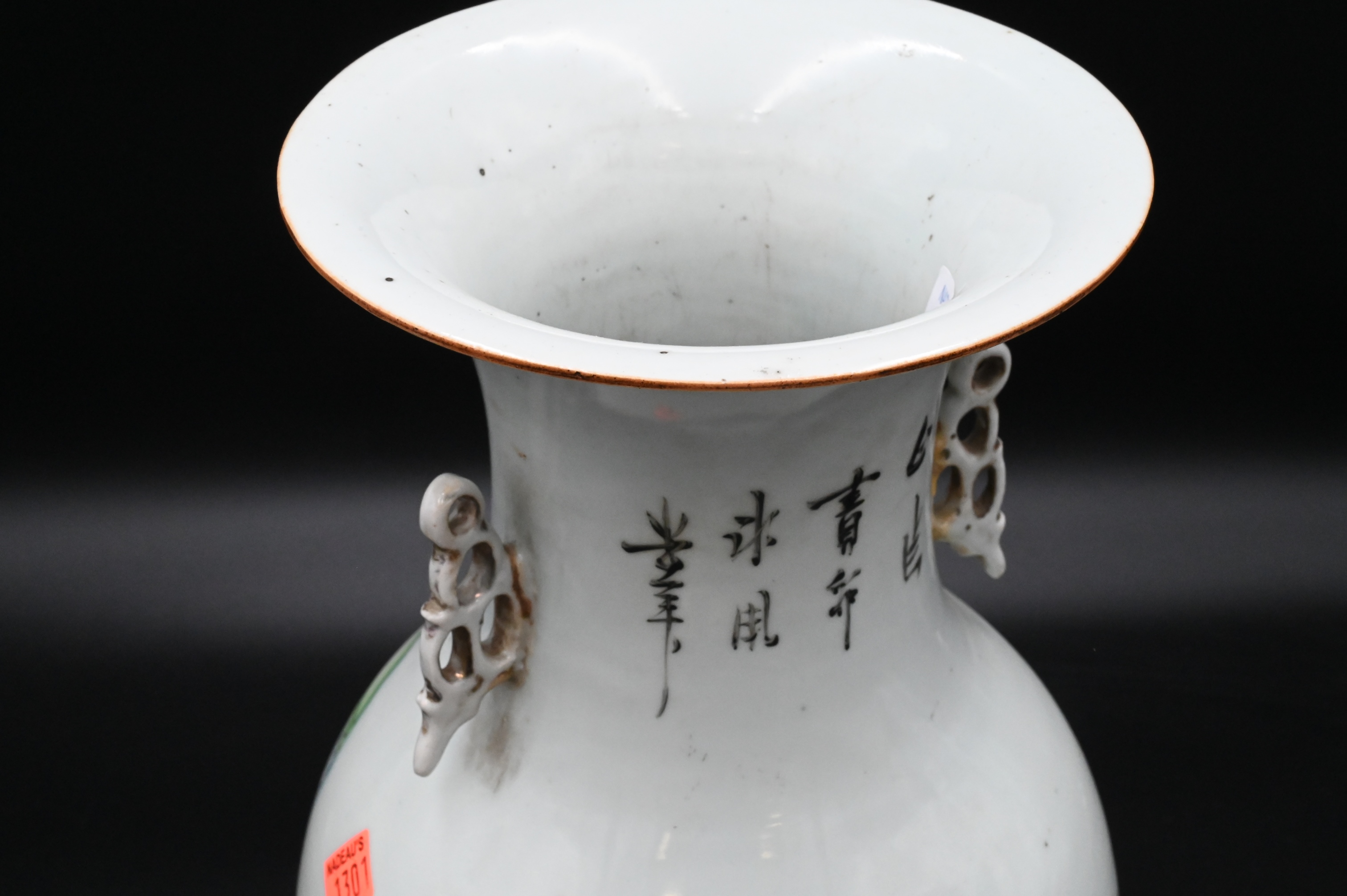 Chinese Porcelain Rose Famille Vase, having painted figures and courtyard scene, height 16 inches, diameter 6 3/4 inches.
