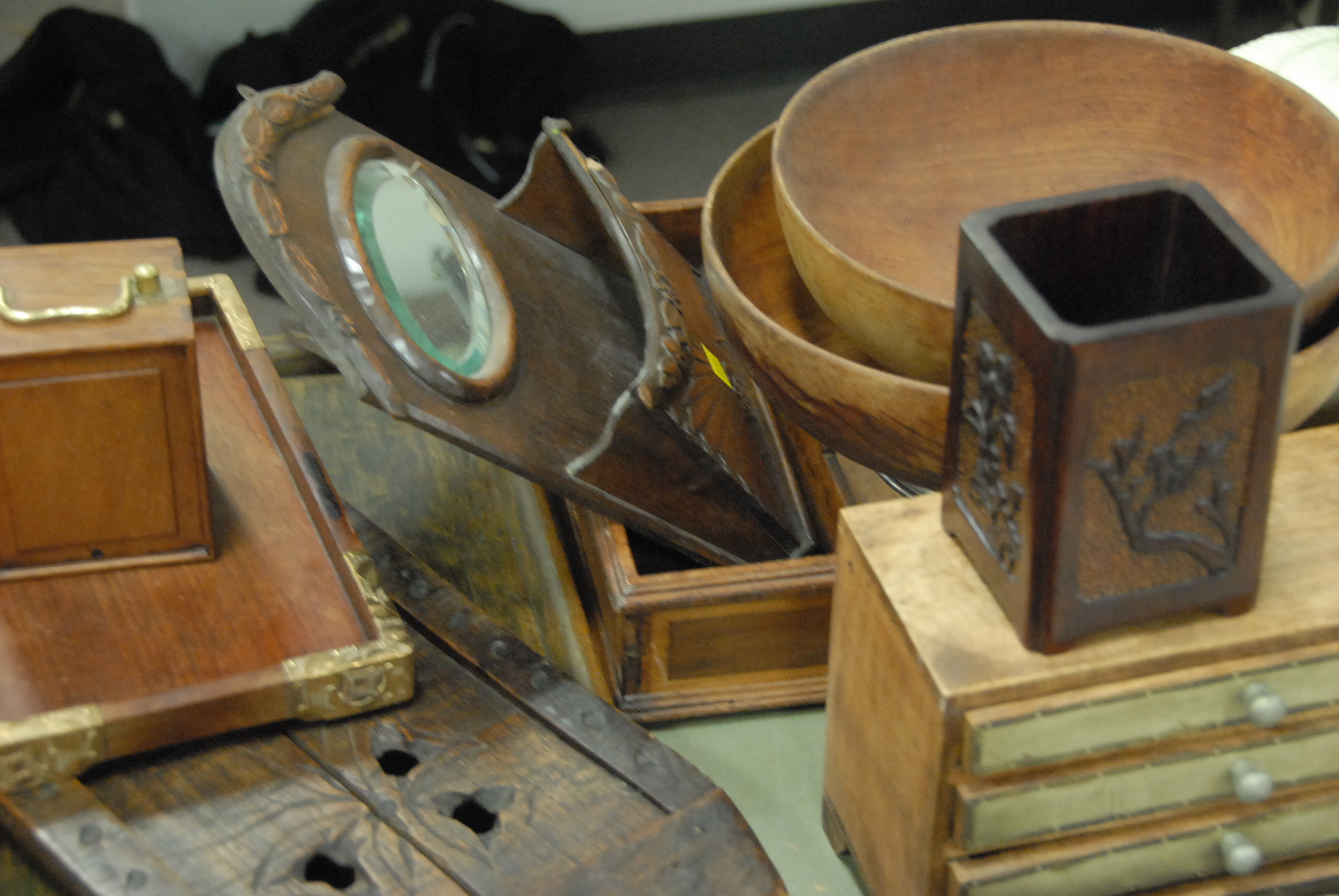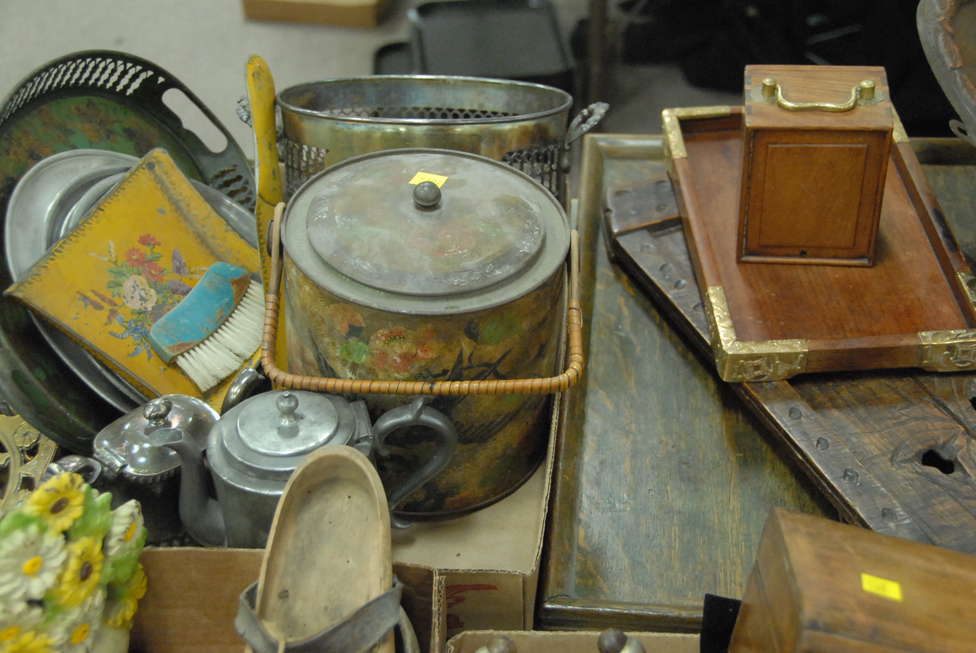 Lot 110: Four box lots to include wood boxes, bowls, and trays, pair of iron door stops, tole box and tray, silverplate, pair of carved wreat…