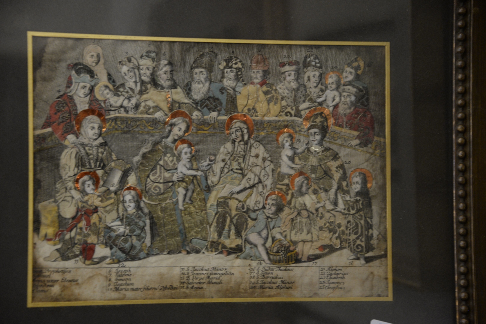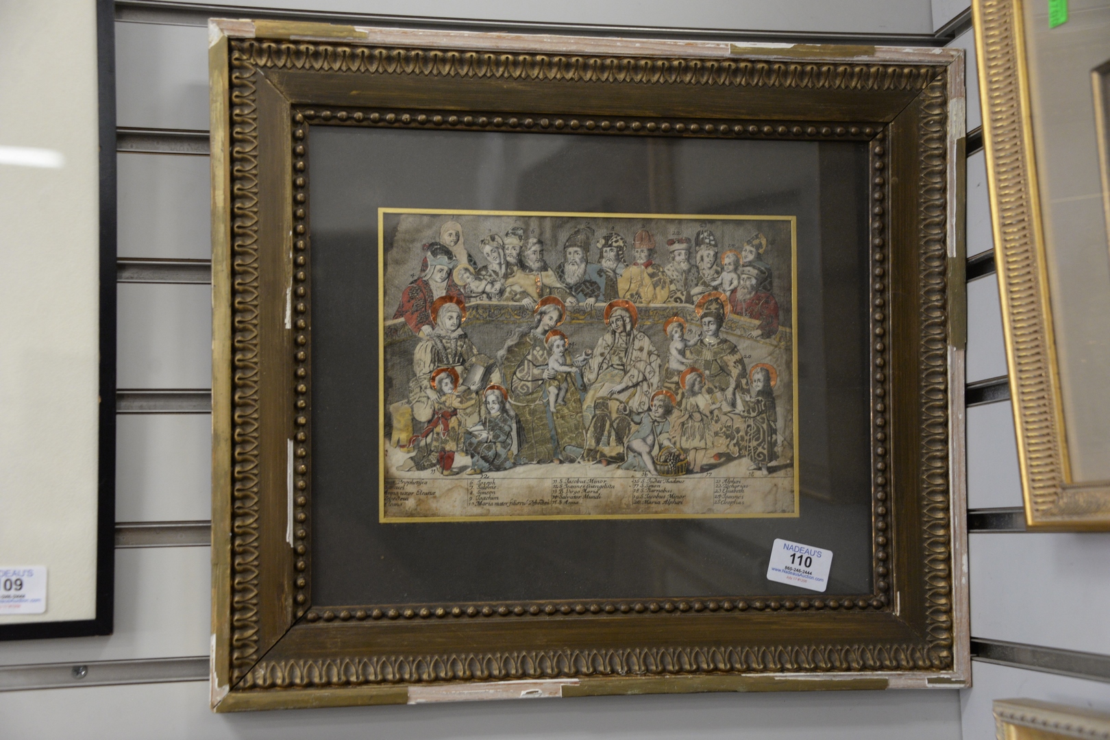Lot 110: Framed Embroidered Etching of a Religious Scene, with identification of who each figure represents, having silver thread and copper halo detailing, sight size 7 1/8″ x 9 3/4″.