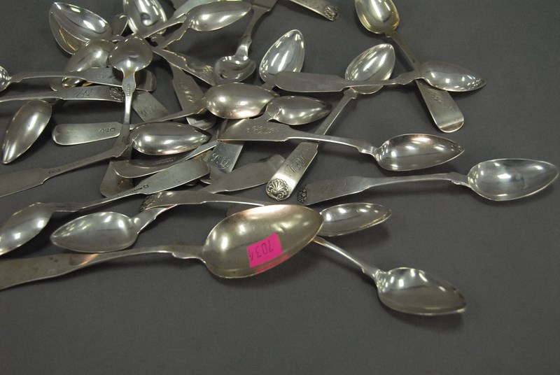 Lot 110: Group of coin silver spoons, S. E. Young, Hoyt, Goodwin, Brewer, etc., 15.5 t oz.