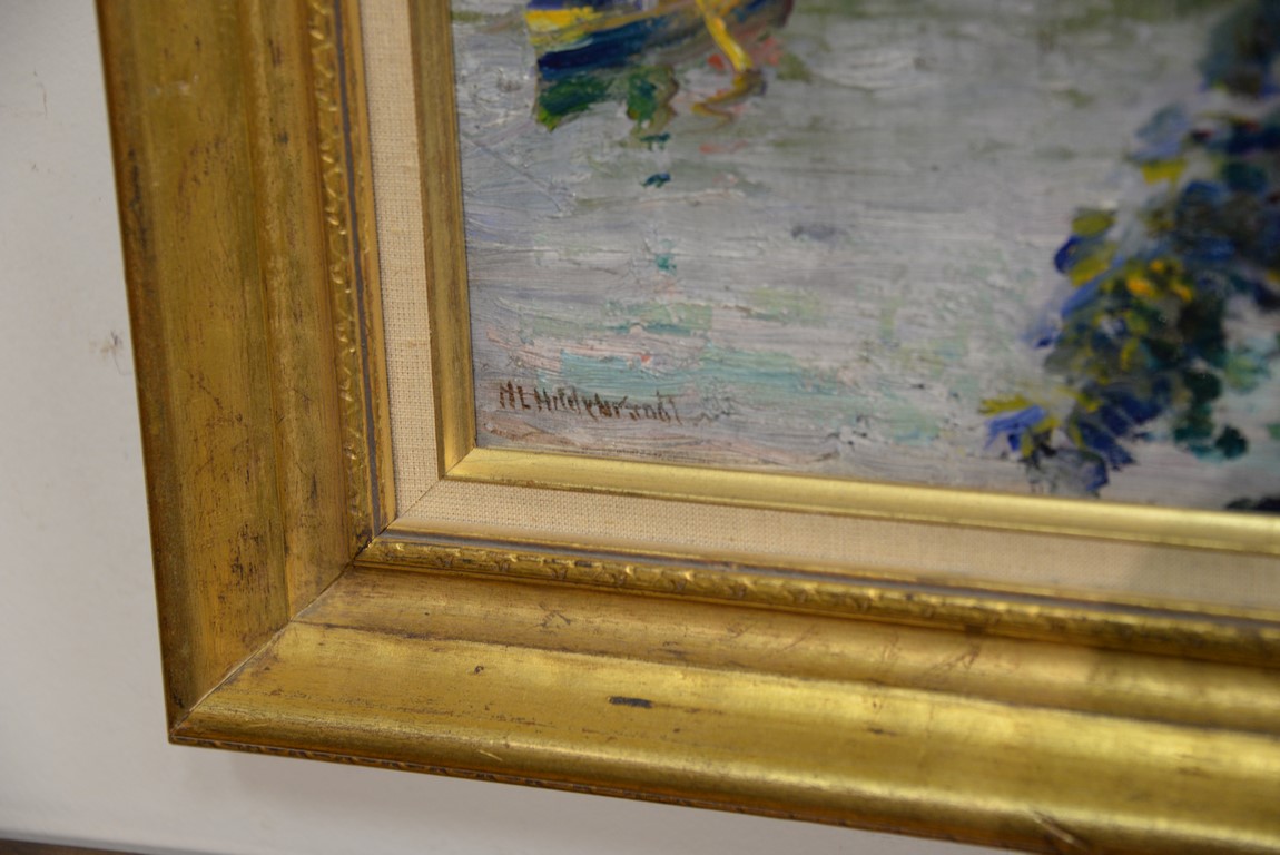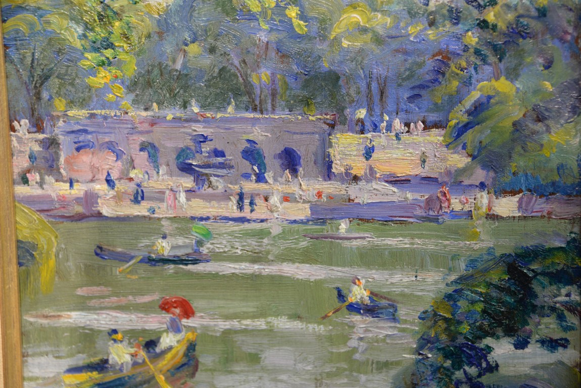 Lot 110: Howard Logan Hildebrandt 1872-1958 Summer Row in Central Park Pond oil on panel signed lower left: H. L. Hildebrandt 1…