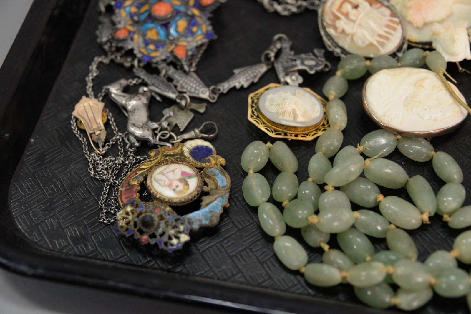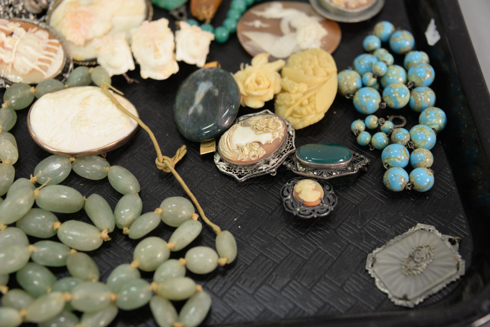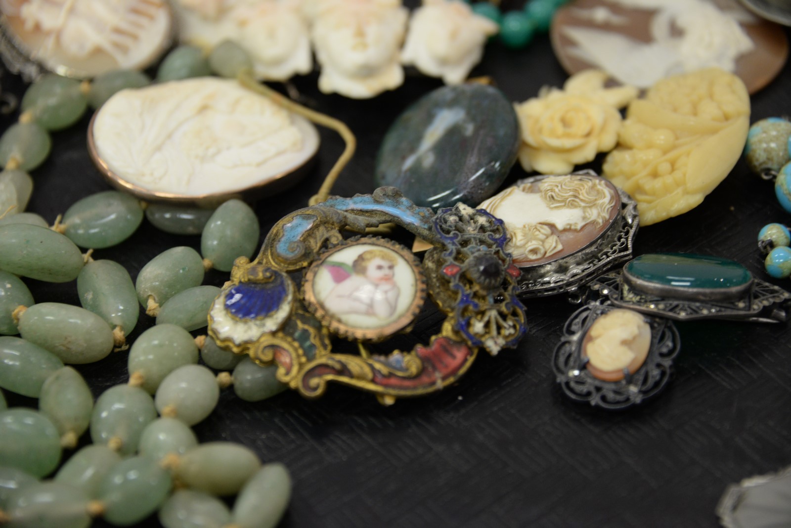 Jewelry lot including cameos, turquoise necklace, silver, enameled pendant hardstone.