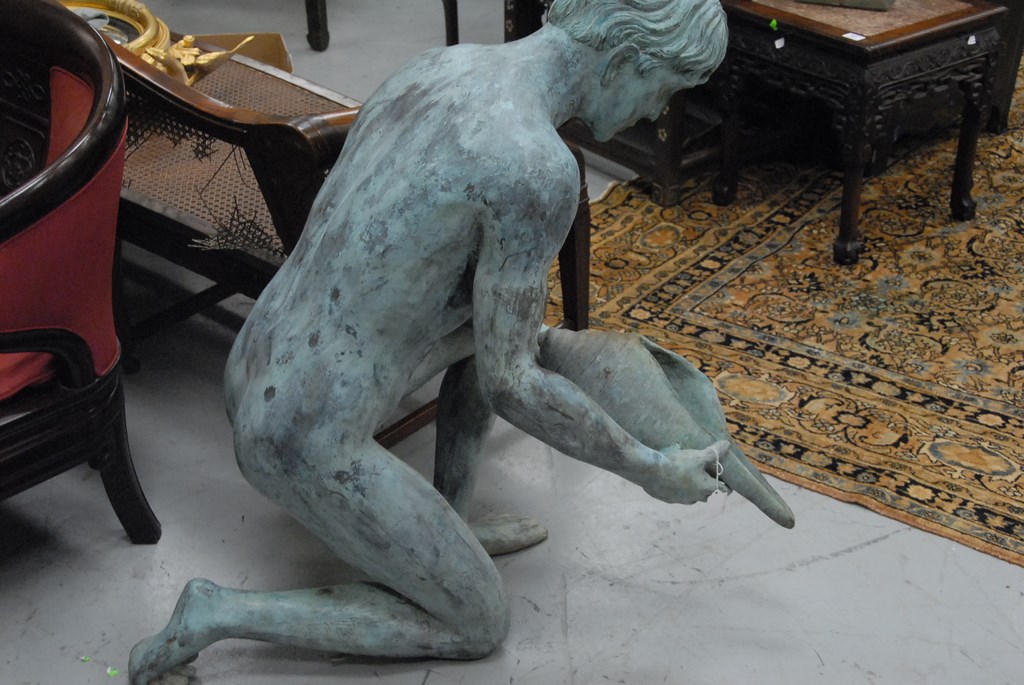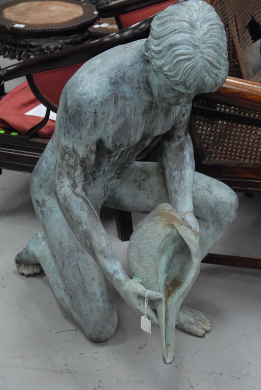 Lot 110: Life size bronze fountain sculpture of a young man kneeling with large seashell, unsigned. ht. 39in. lg. 36in.