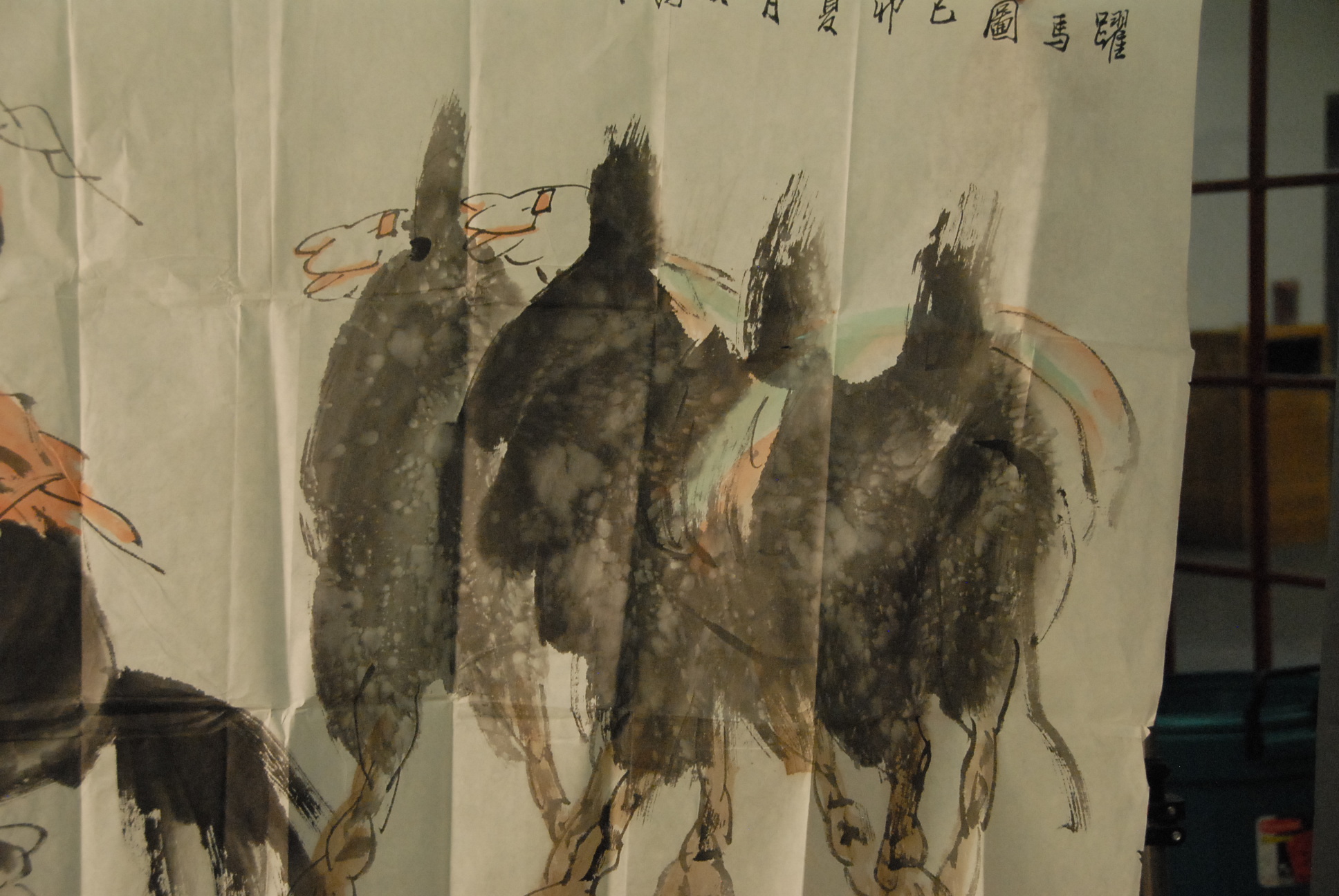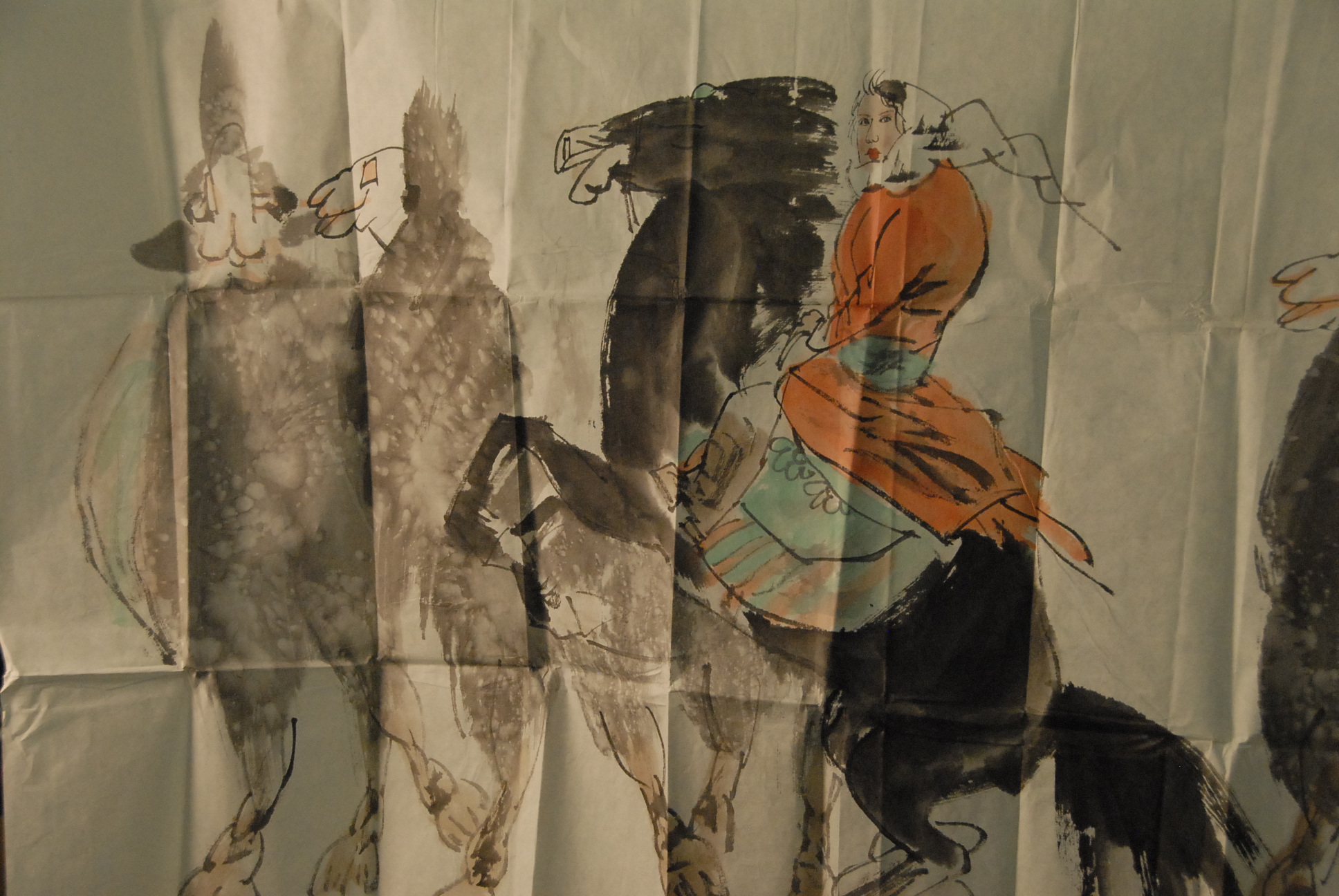 Liu Dawei watercolor on tissue paper of figure on black horse and four camels.