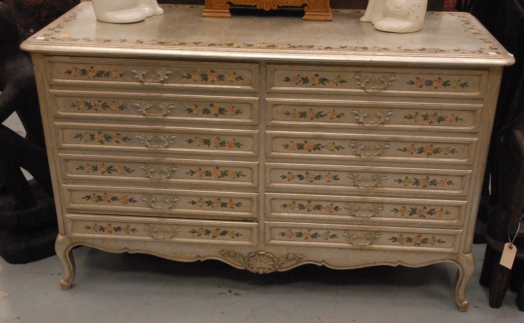 Lot 110: Louis XV Silver gilt twelve drawer double dresser with floral decoration, ht. 31, top: 20 x 50.