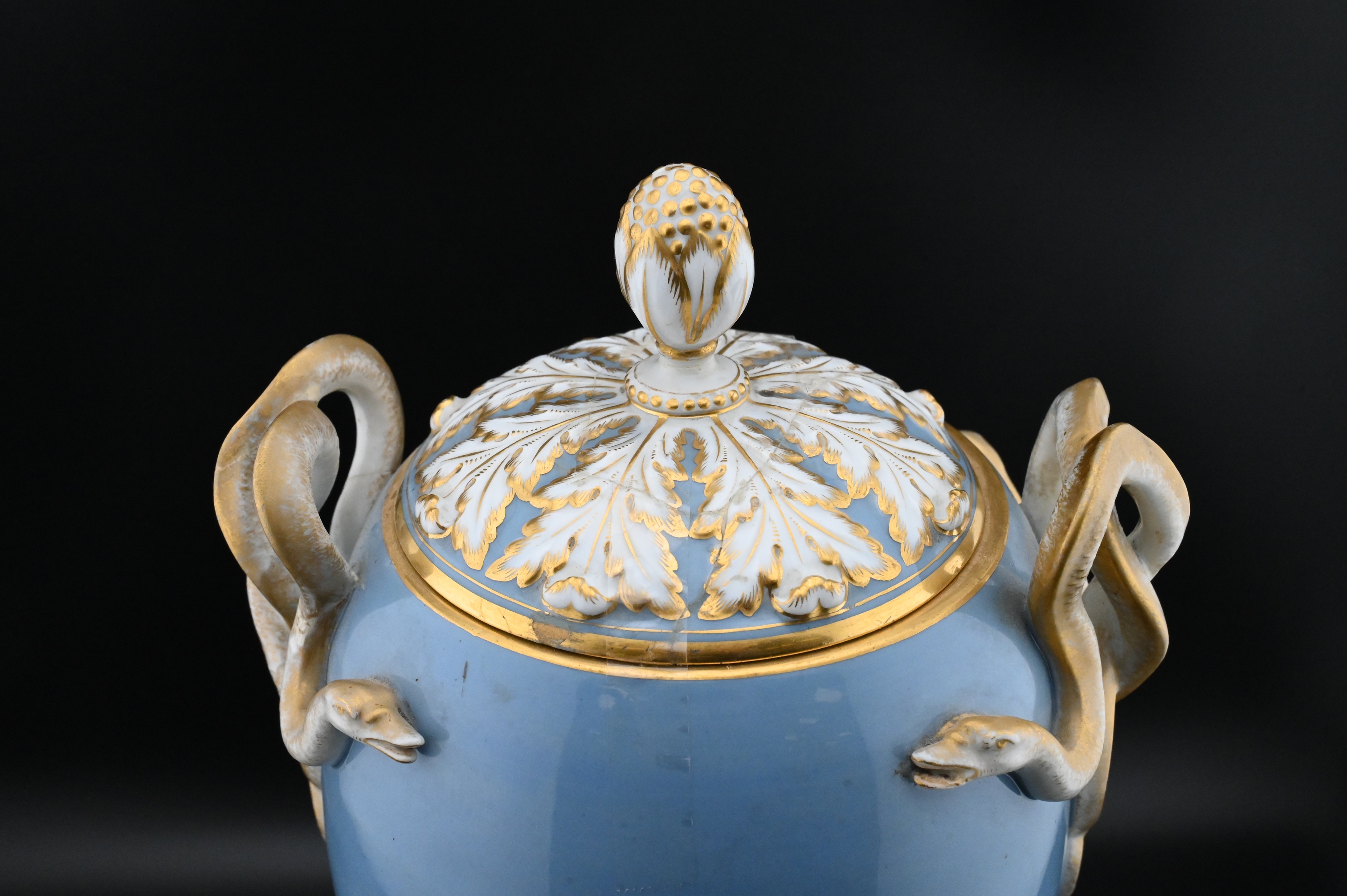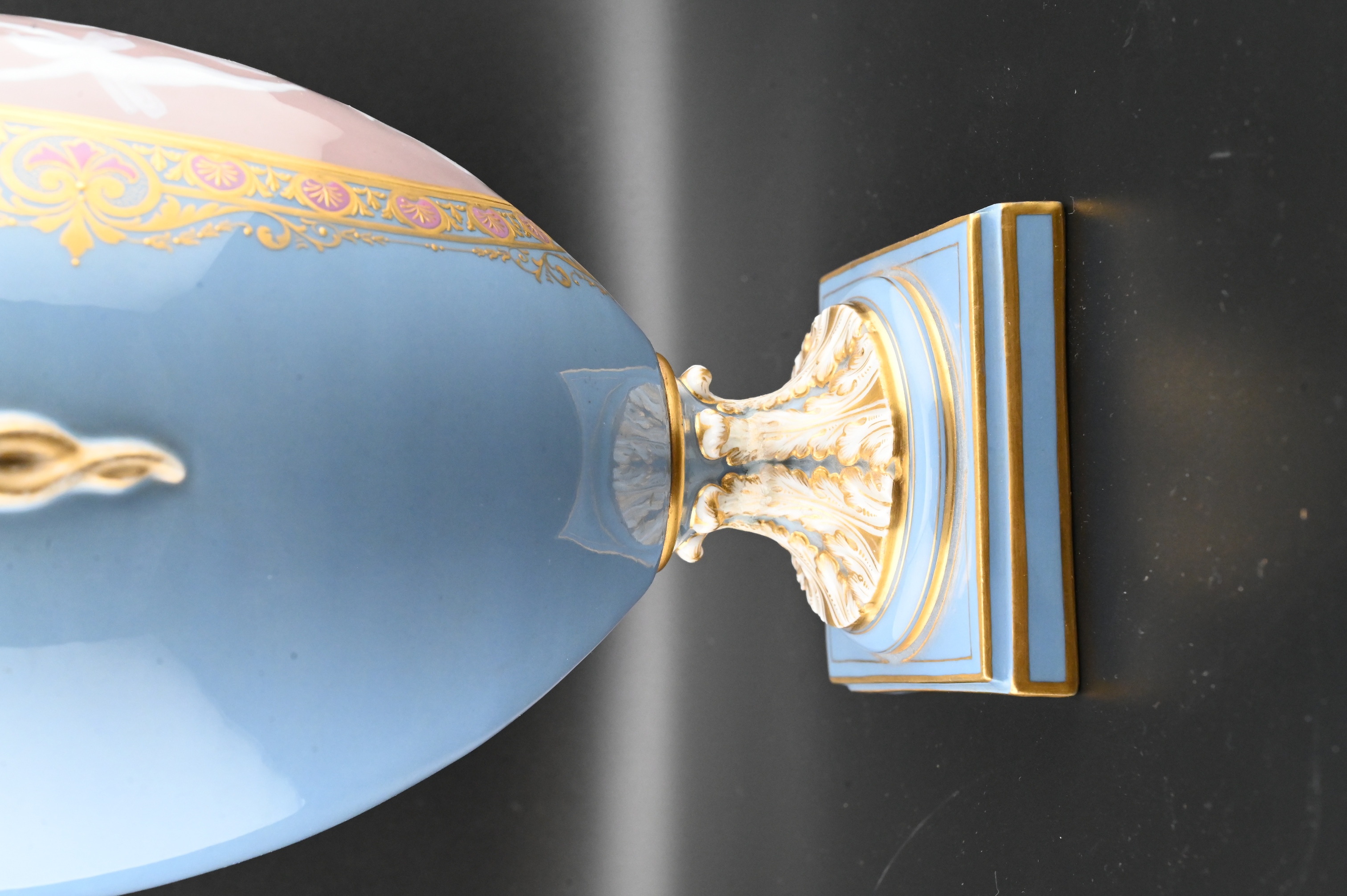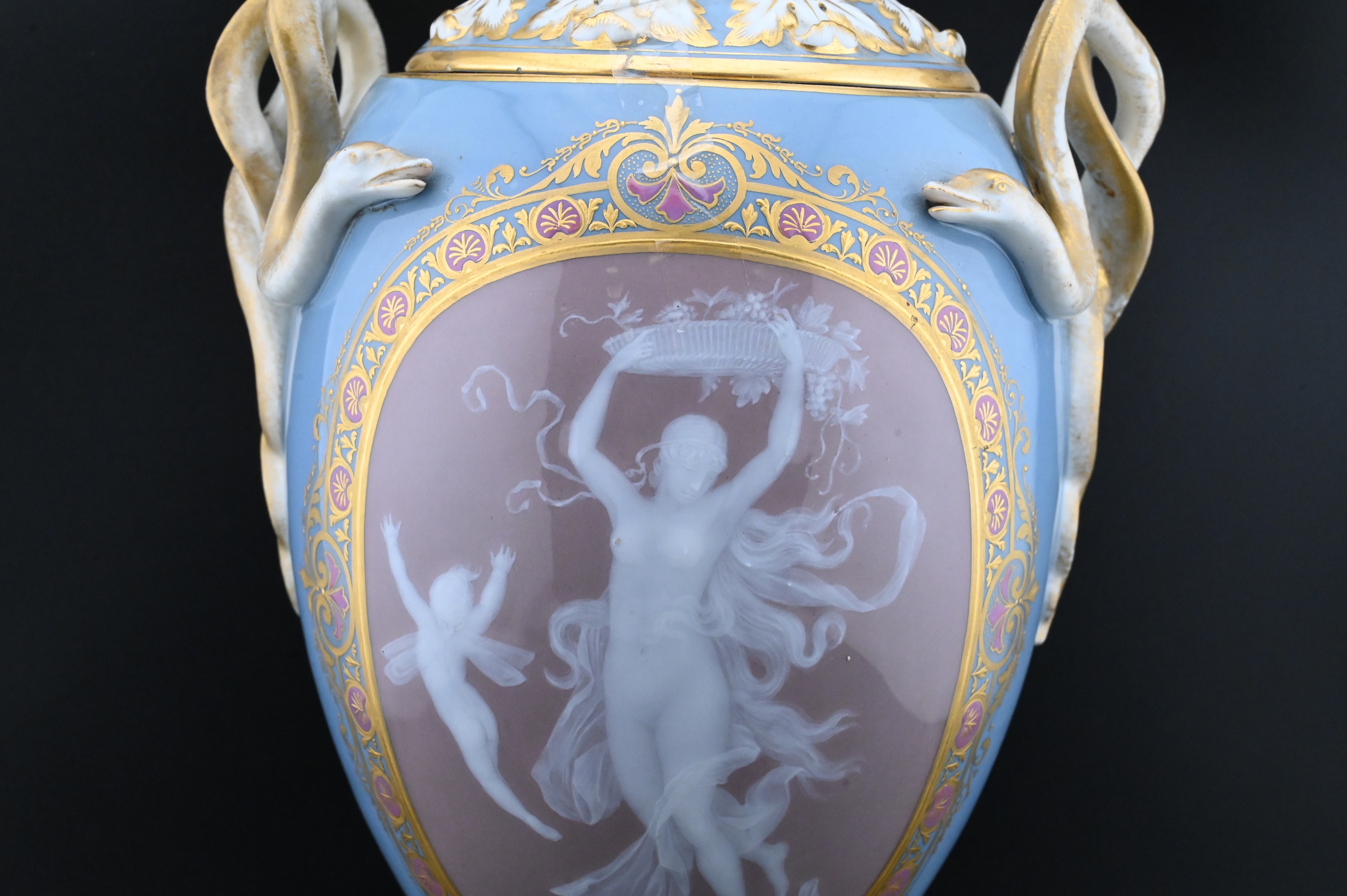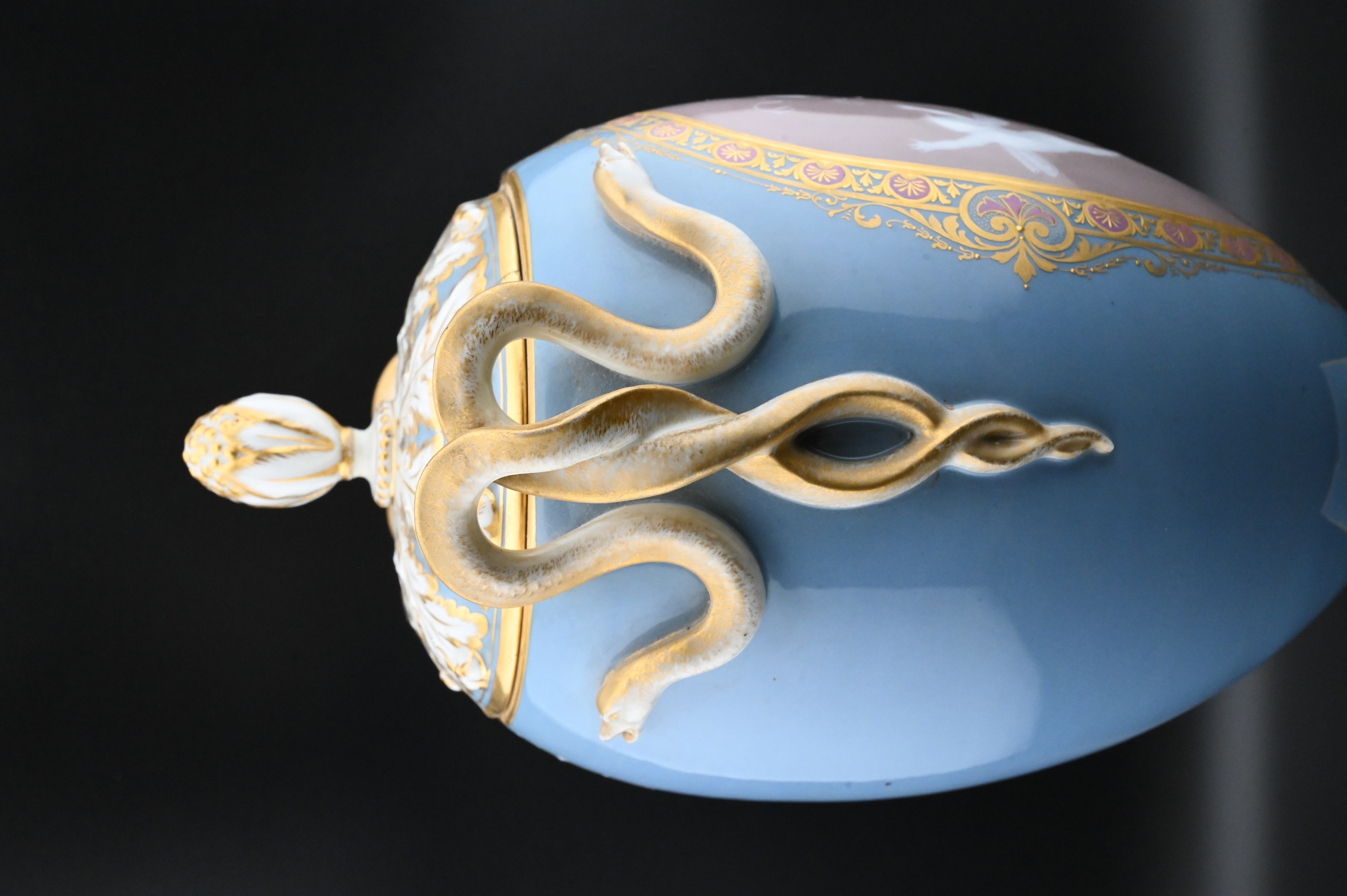 ovoid urn exquisitely decorated with pâte-sur-pâte neoclassical reserves depicting a dancing maiden and attendant fairy in white slip on a mauve ground, the translucent layered relief showcasing fine modeling and delicate detailing, the surrounding pale blue body is enriched with gilt and polychrome foliate borders and fitted with raised gilt serpent-form handles, the domed cover is adorned with gilt acanthus and a bud finial, all raised on a square stepped base with gilt accents, Meissen blue crossed swords mark to underside