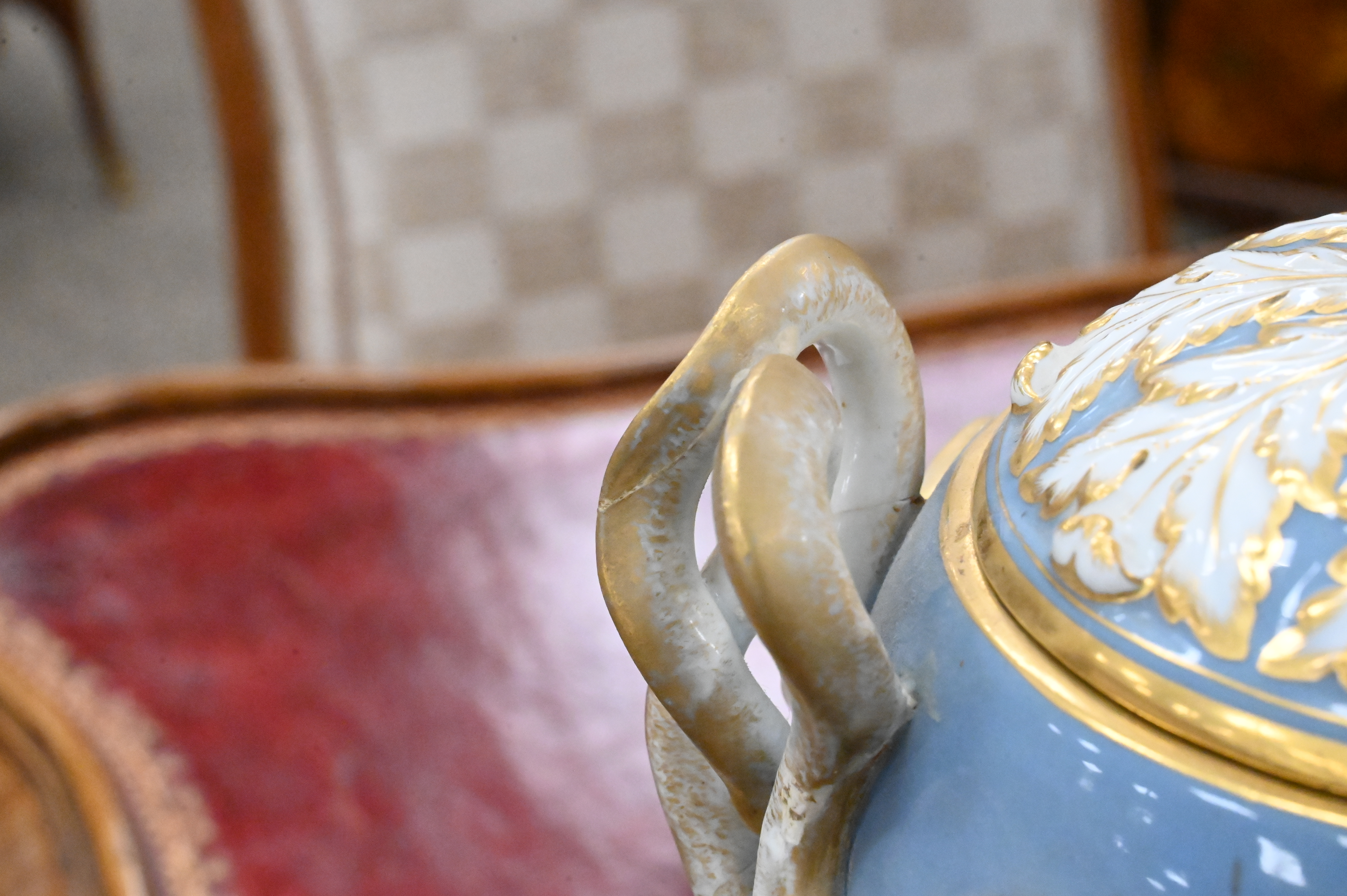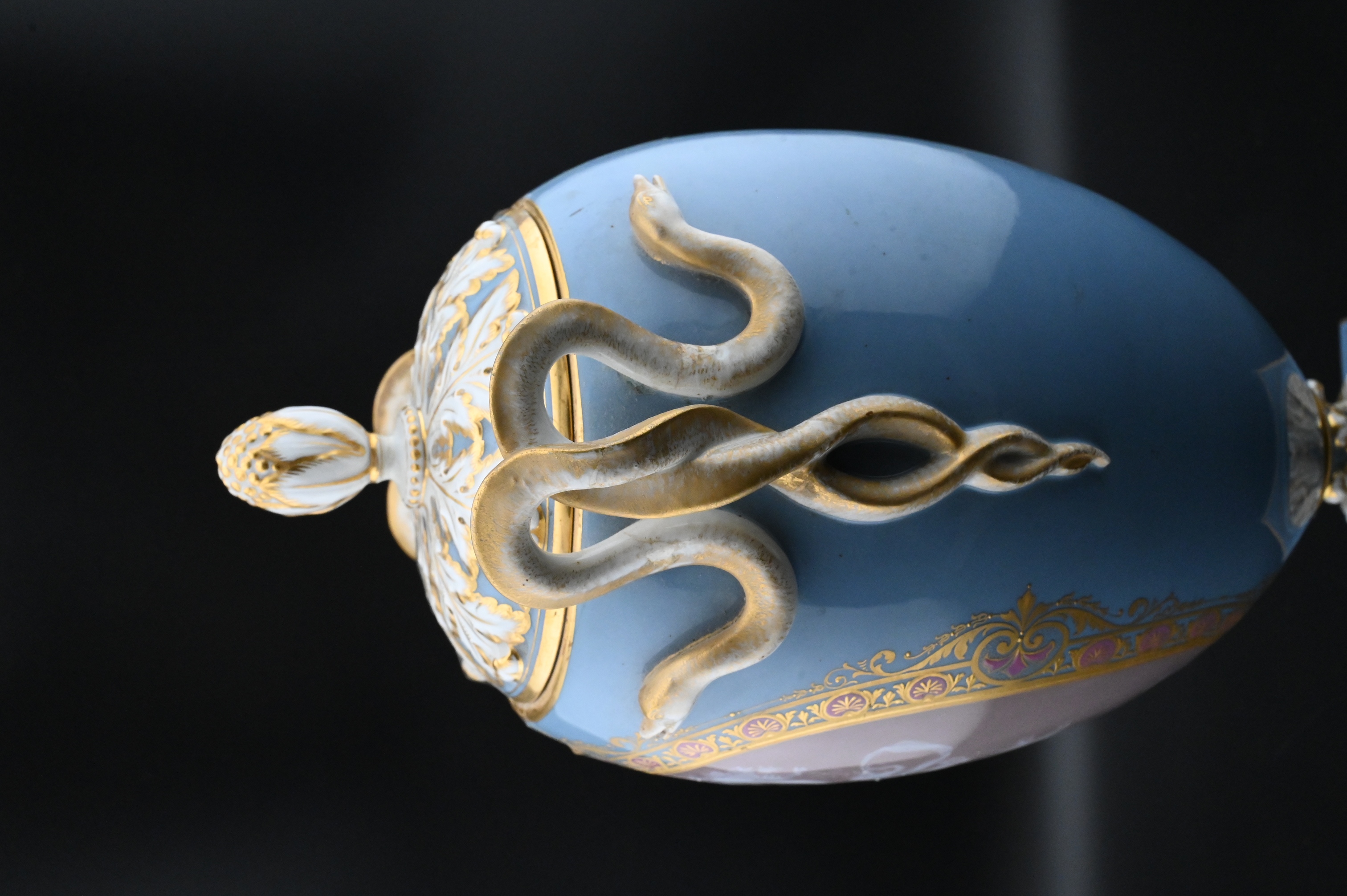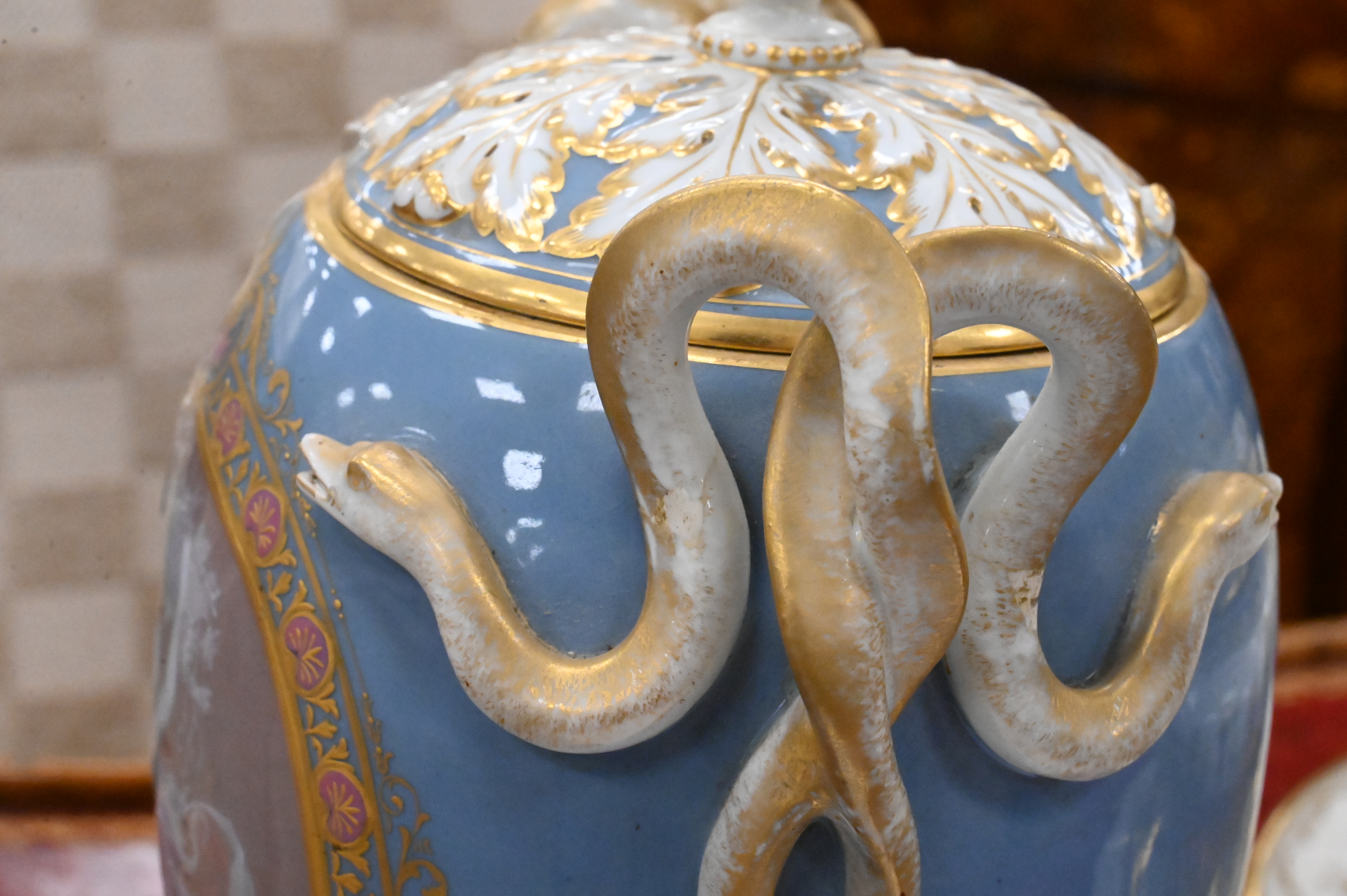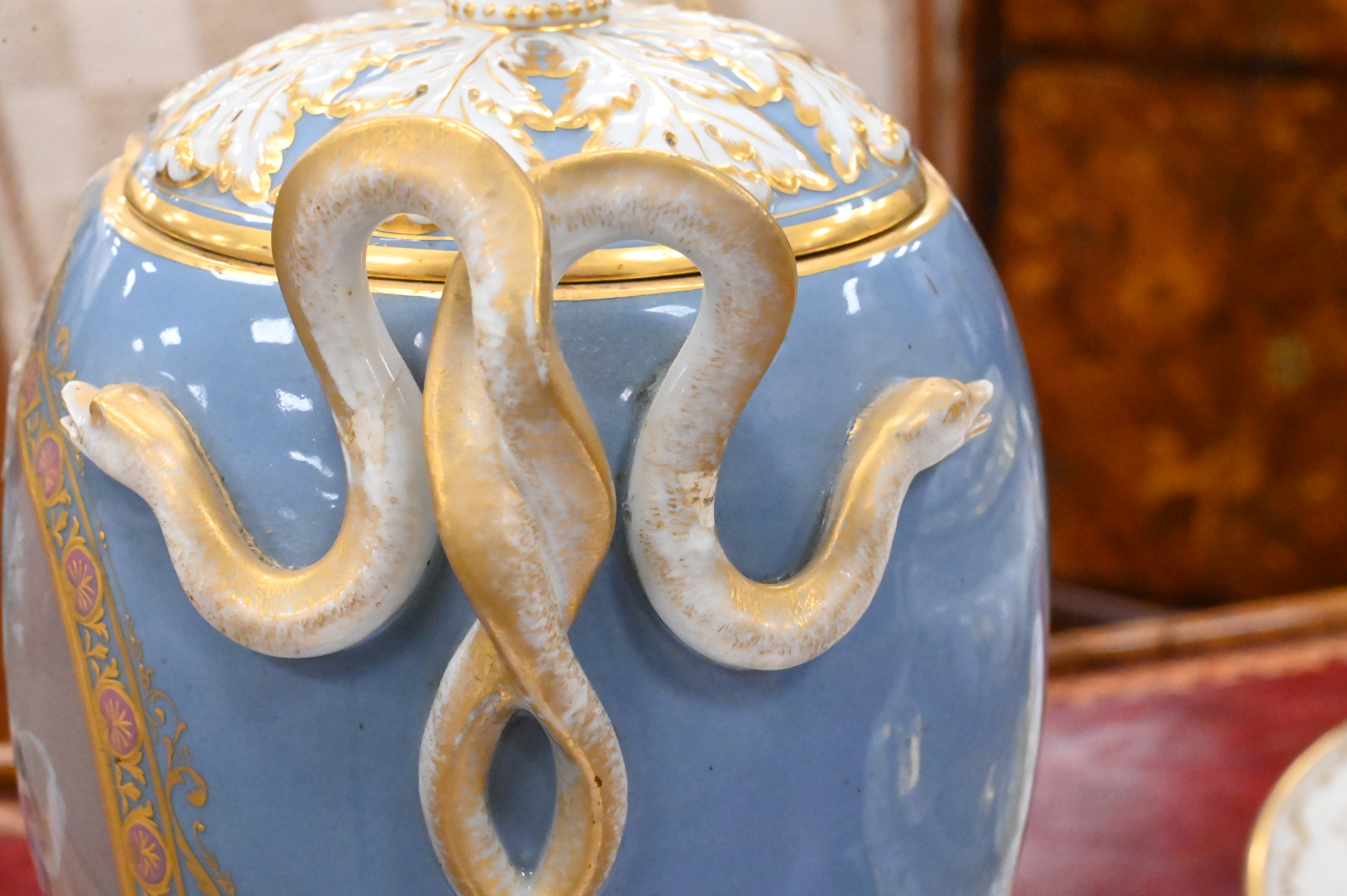 ovoid urn exquisitely decorated with pâte-sur-pâte neoclassical reserves depicting a dancing maiden and attendant fairy in white slip on a mauve ground, the translucent layered relief showcasing fine modeling and delicate detailing, the surrounding pale blue body is enriched with gilt and polychrome foliate borders and fitted with raised gilt serpent-form handles, the domed cover is adorned with gilt acanthus and a bud finial, all raised on a square stepped base with gilt accents, Meissen blue crossed swords mark to underside