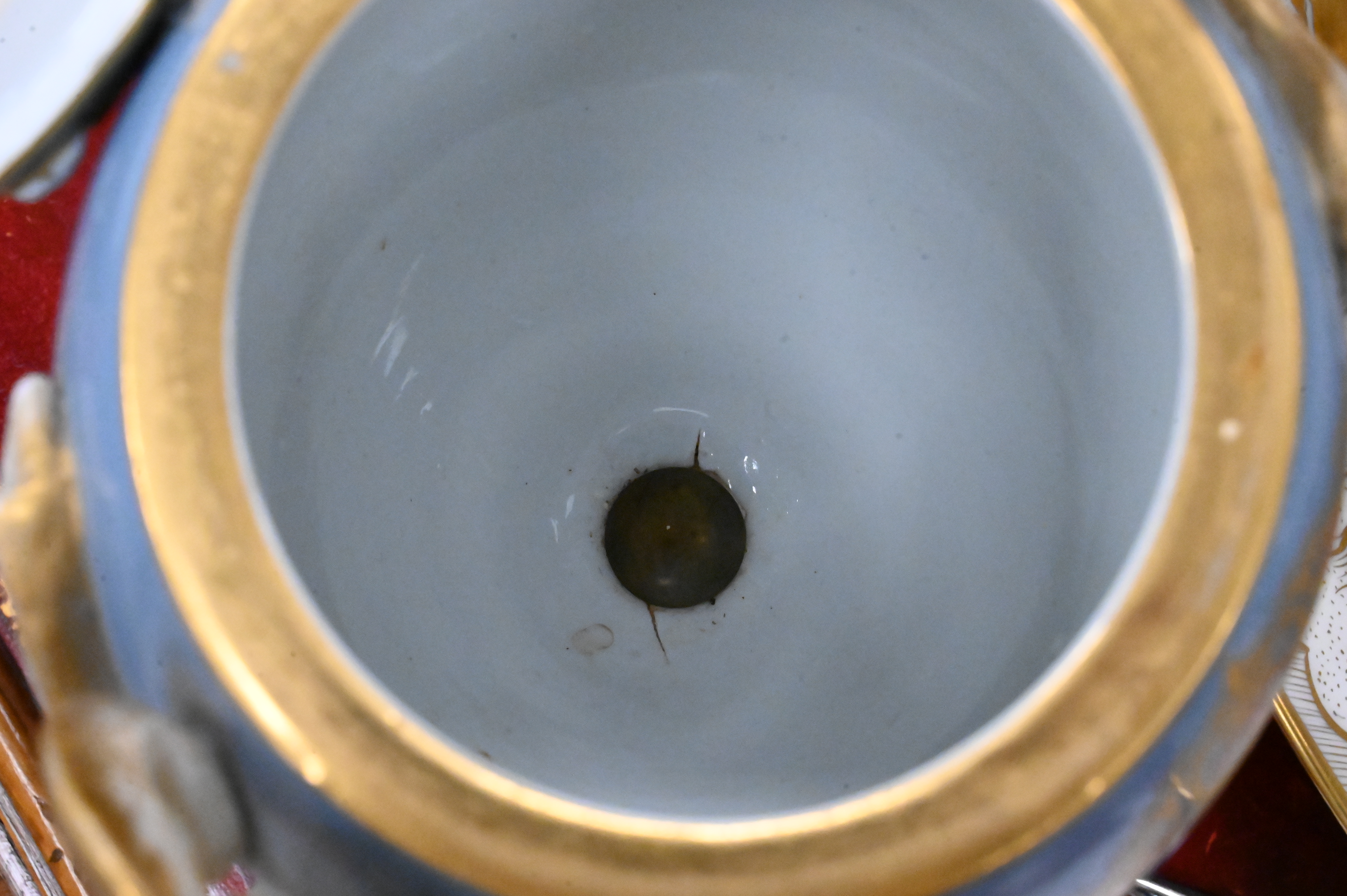 Presents well, lid with repairs to top and finial, one snake handle with repair, repair to base