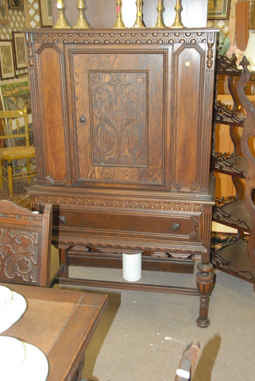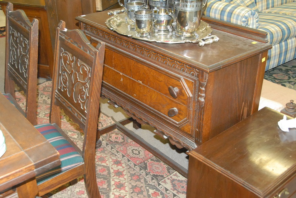 Lot 110: Oak Jacobean ten piece dining set hutch, sideboard, server, six chairs and table with extensions.