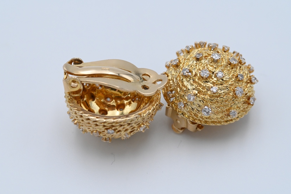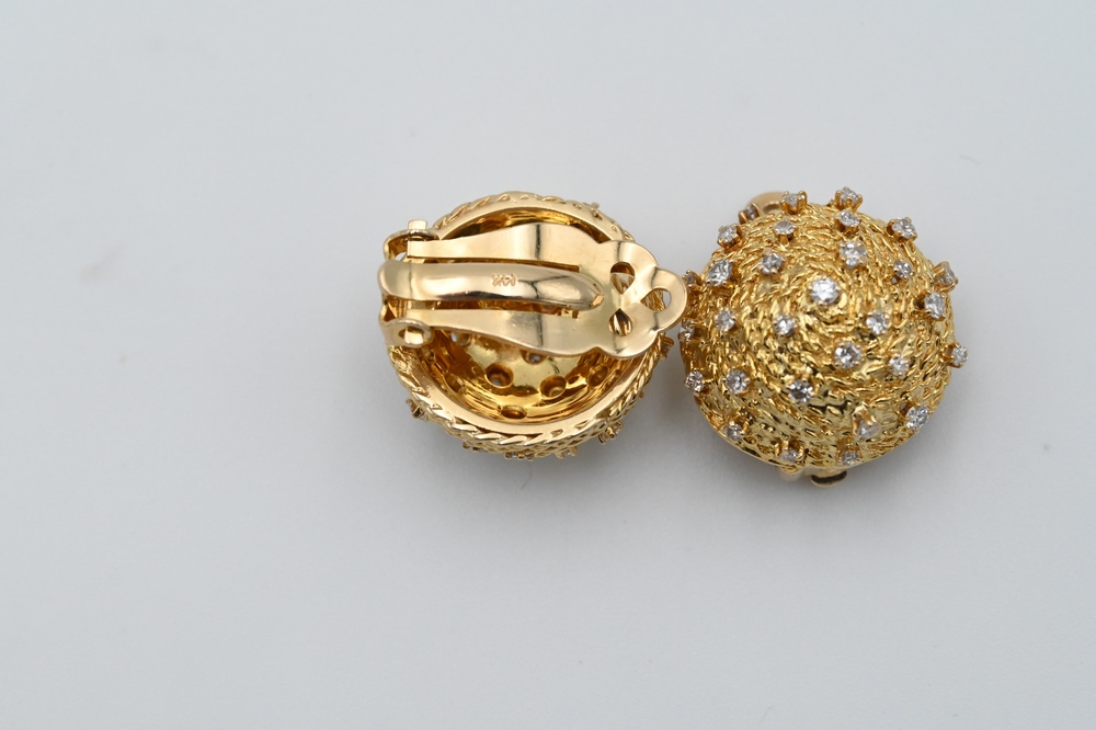Lot 110: Pair of 14 Karat Gold Dome Style Ear Clips, set with round cut diamonds, 17 grams.