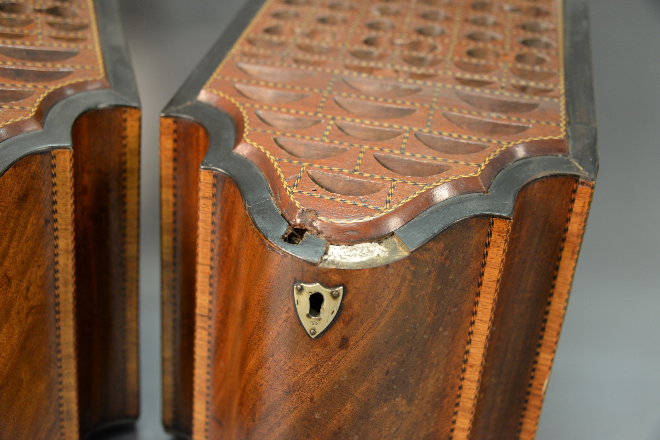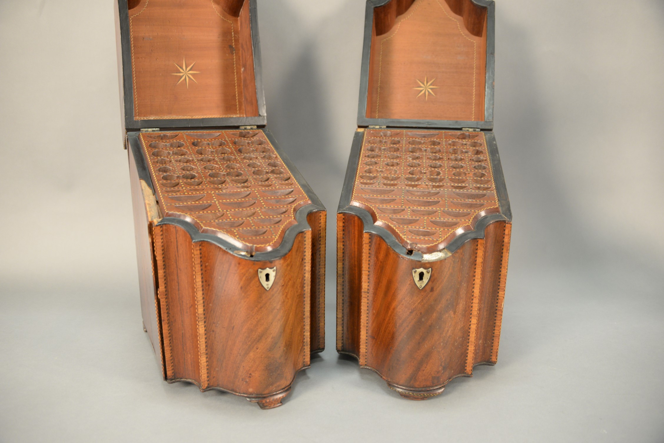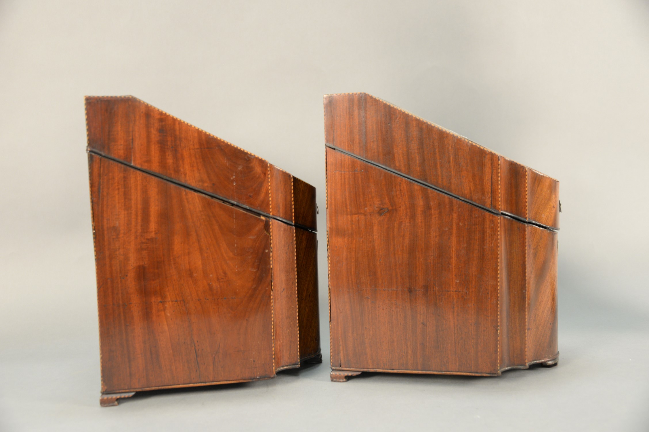 Pair of mahogany knife boxes having slanted lid with conch shell inlay and bowed front, England 19th century. ht. 15 1/2 in. wd. 9 in. dp. 11 1/2 in.