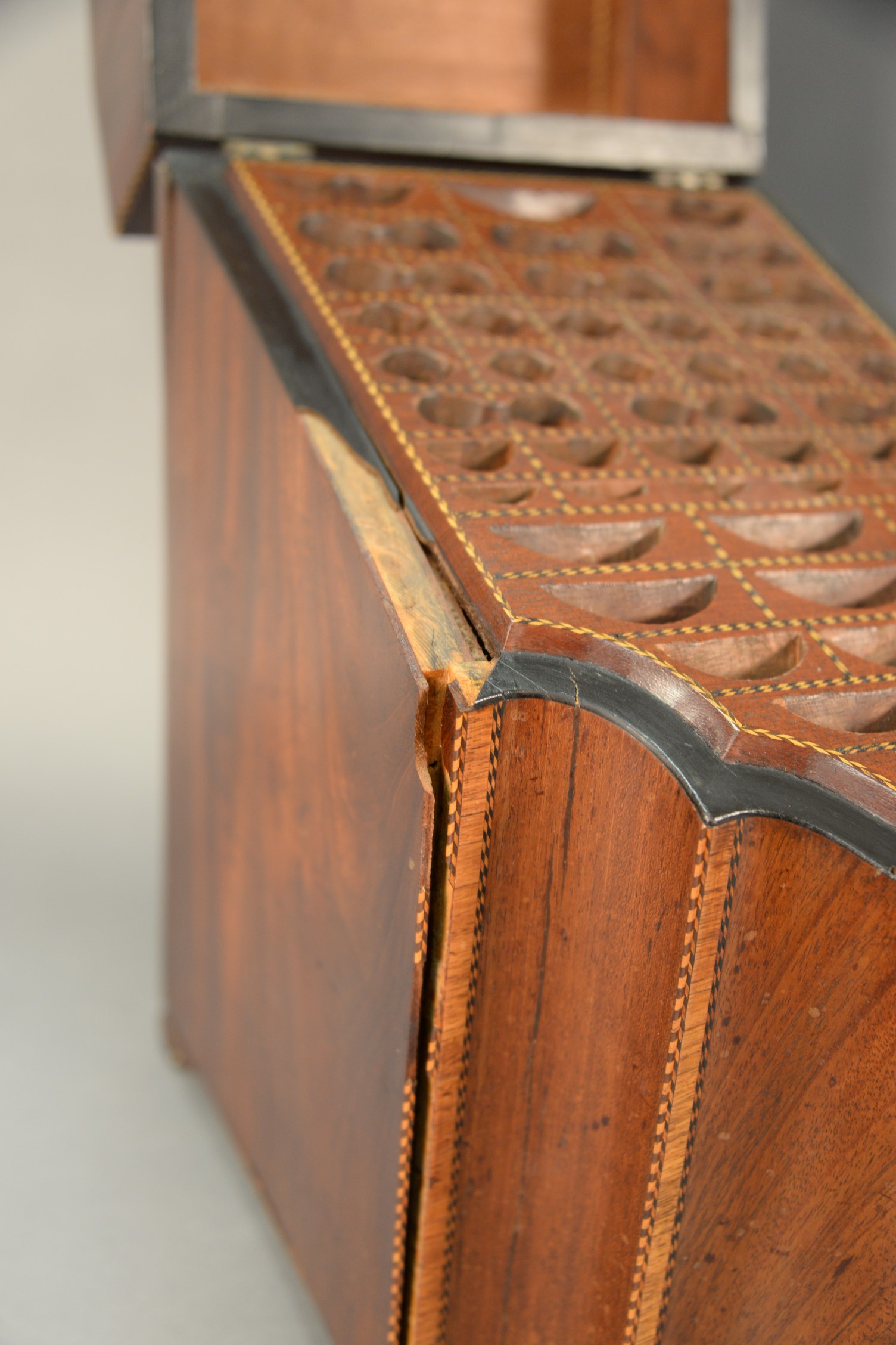 Lot 110: Pair of mahogany knife boxes having slanted lid with conch shell inlay and bowed front, England 19th century. ht. 15 1/2 in. wd….