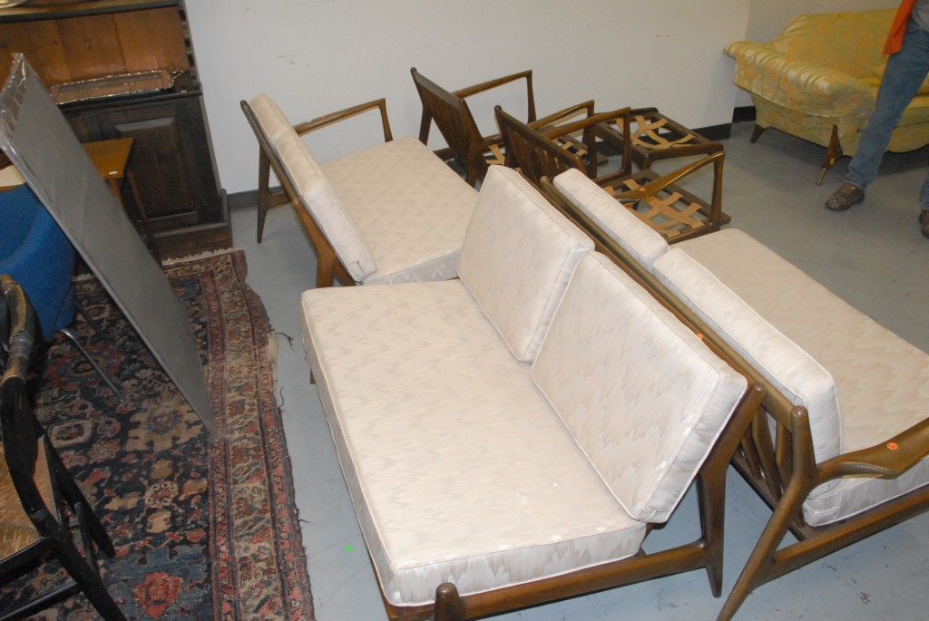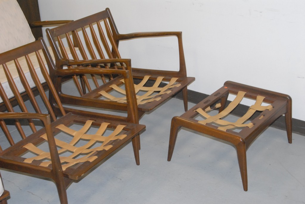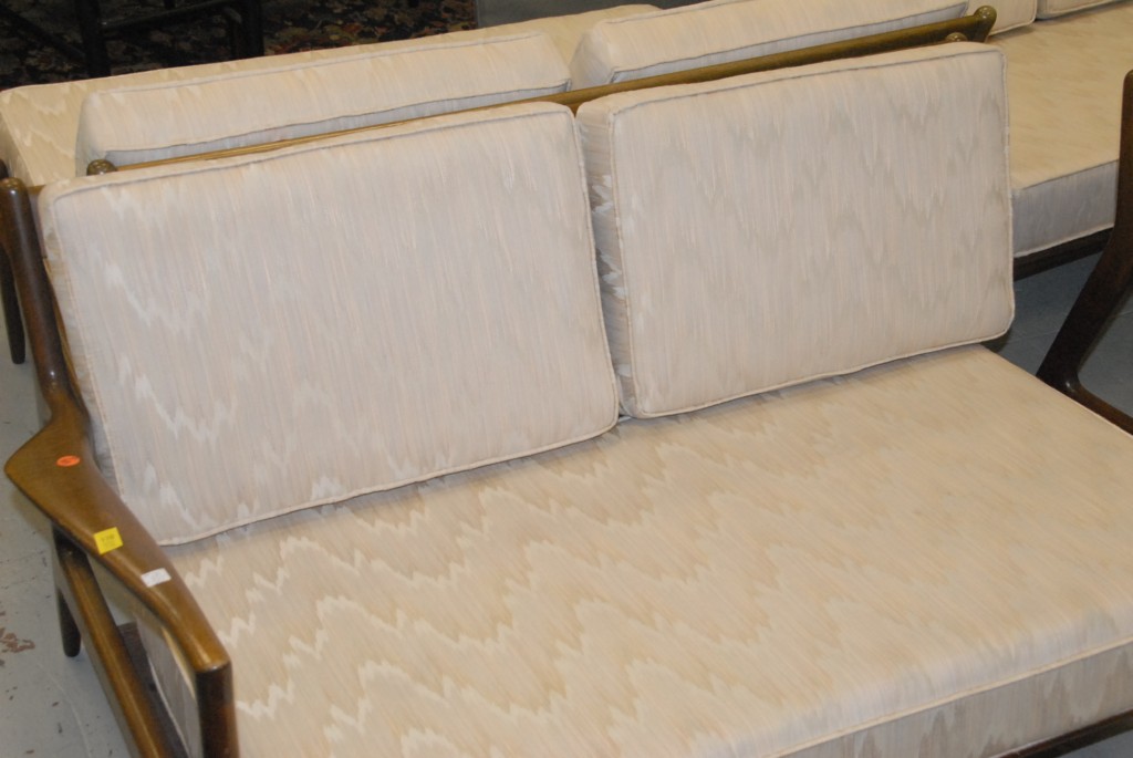 Lot 110: Six piece Danish modern parlor set with three part sofa, two armchairs, and footstool no cushions for armchairs or footstool marke…