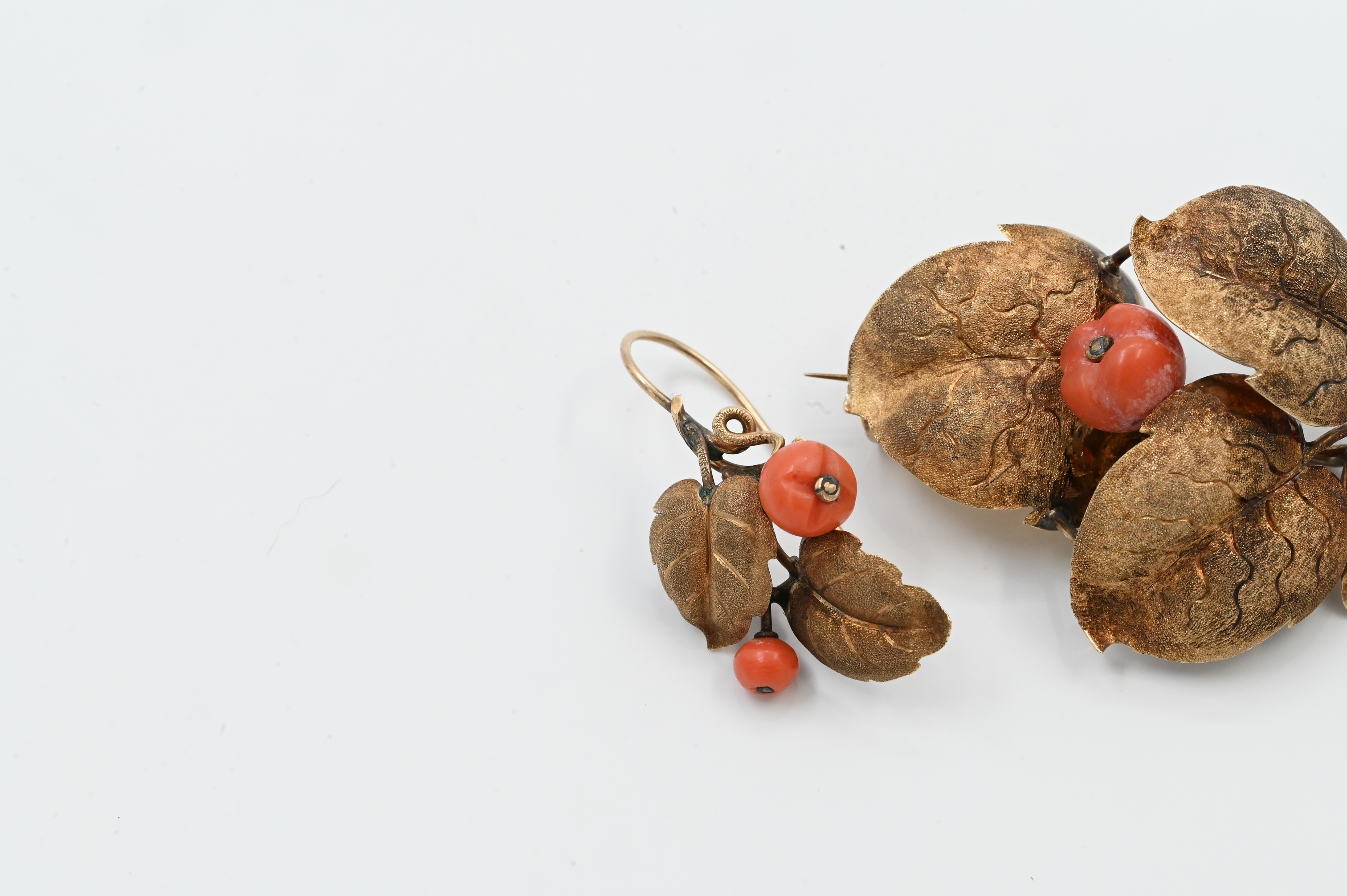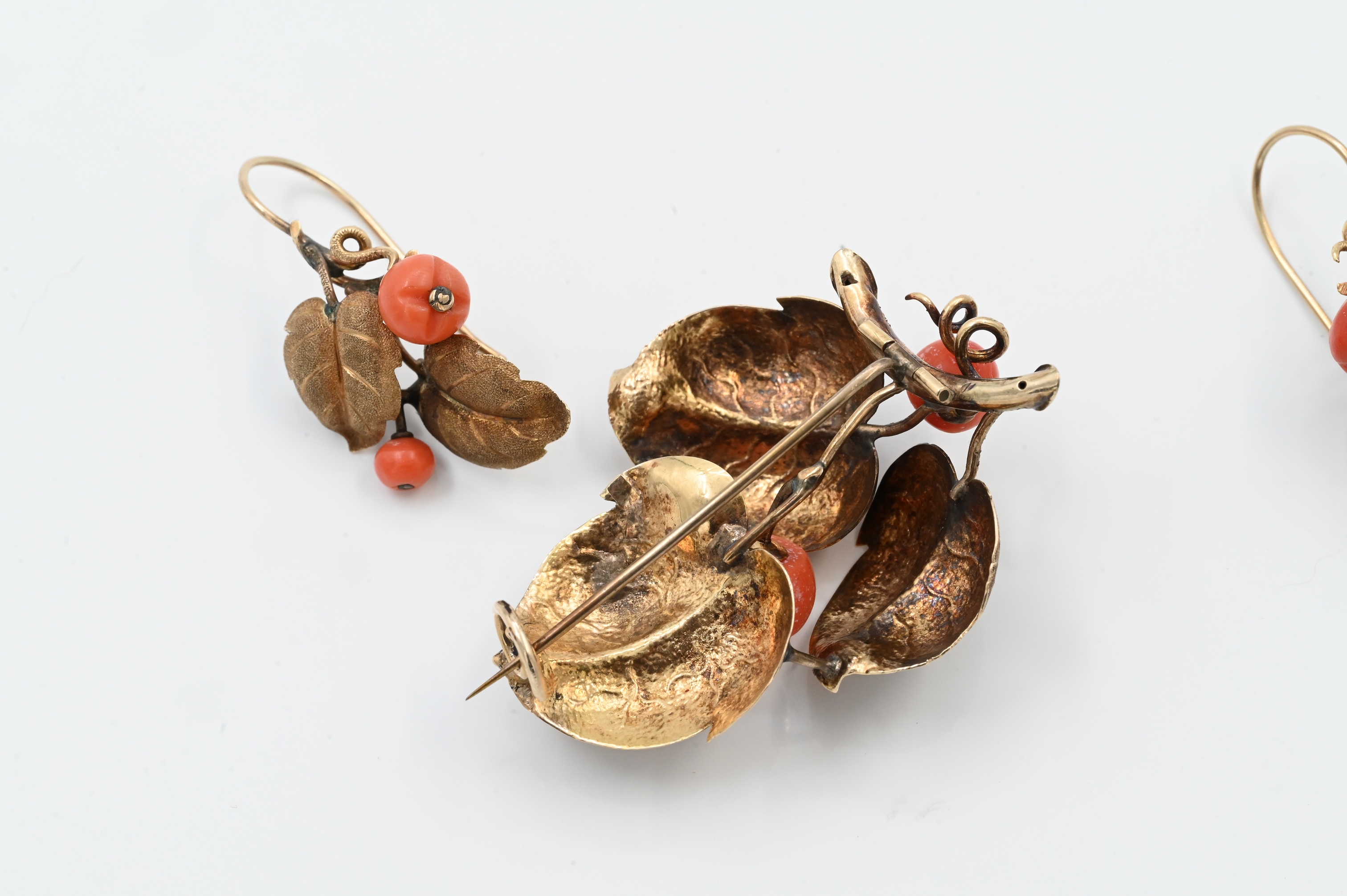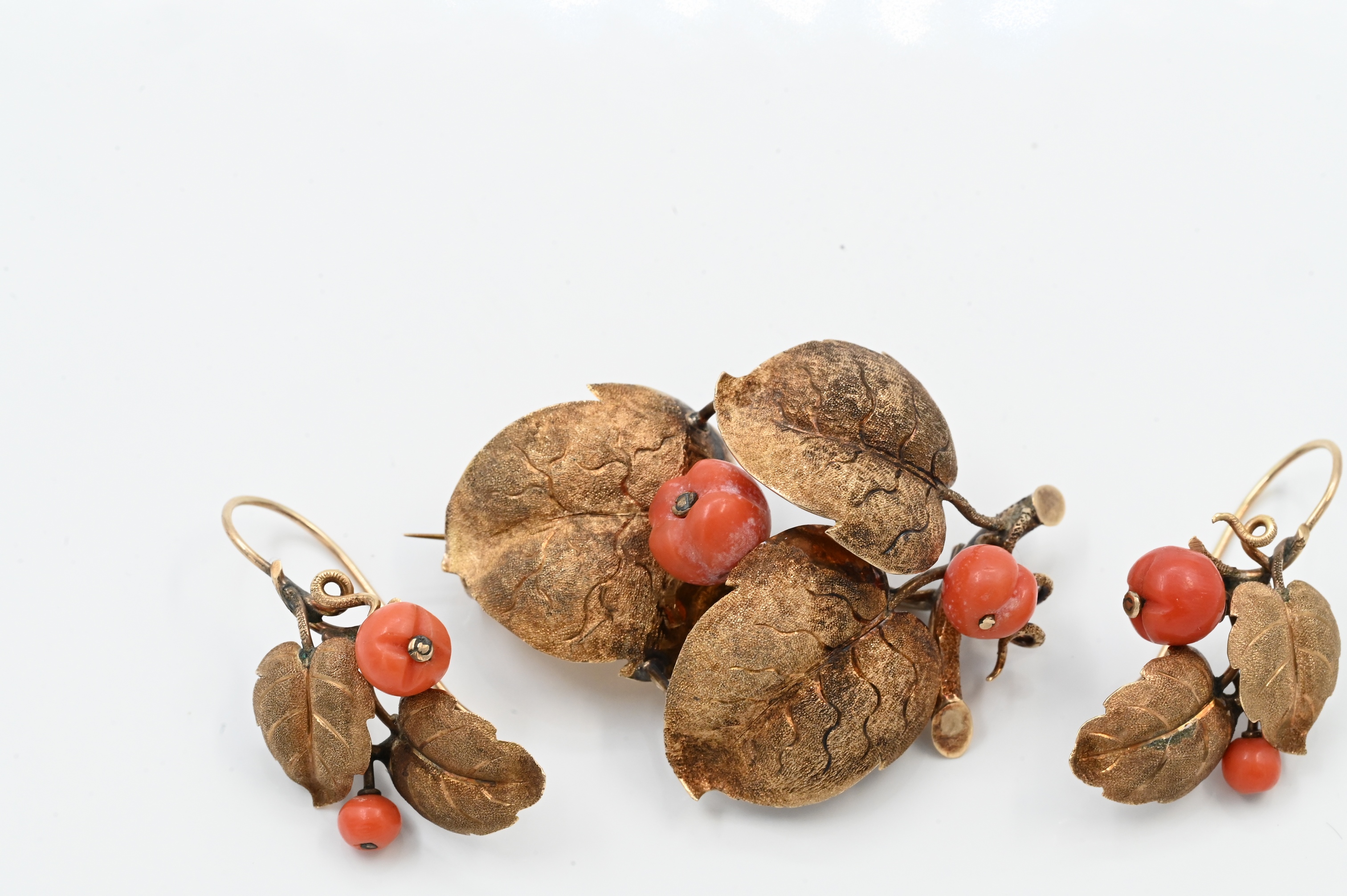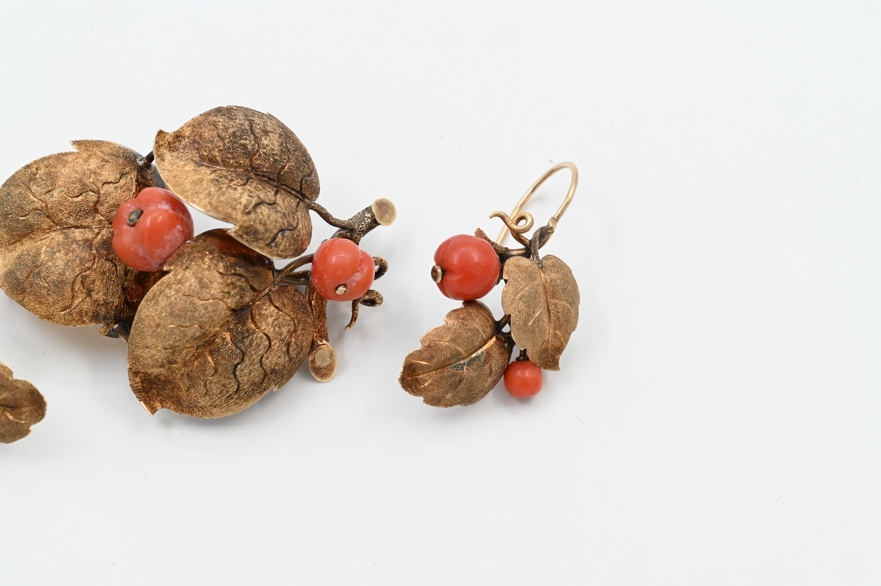 to include pair of earrings and brooch each in the form of a cluster of leaves having coral beads in the shape of peaches