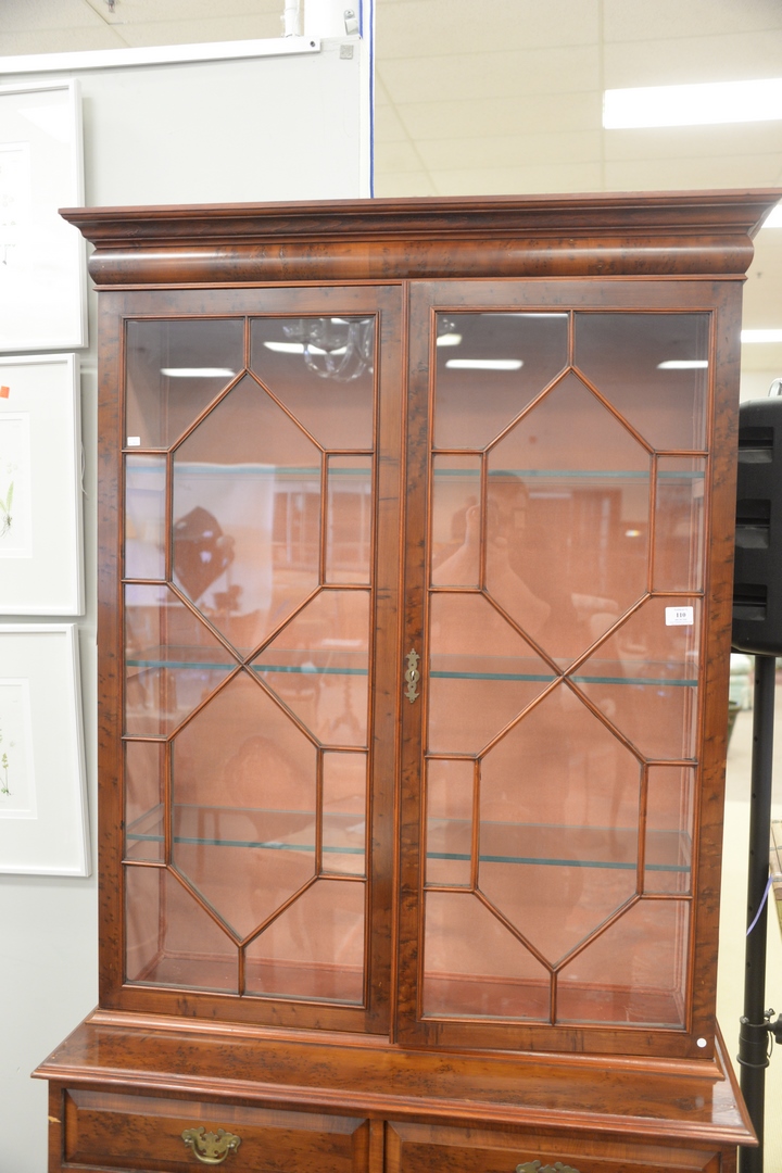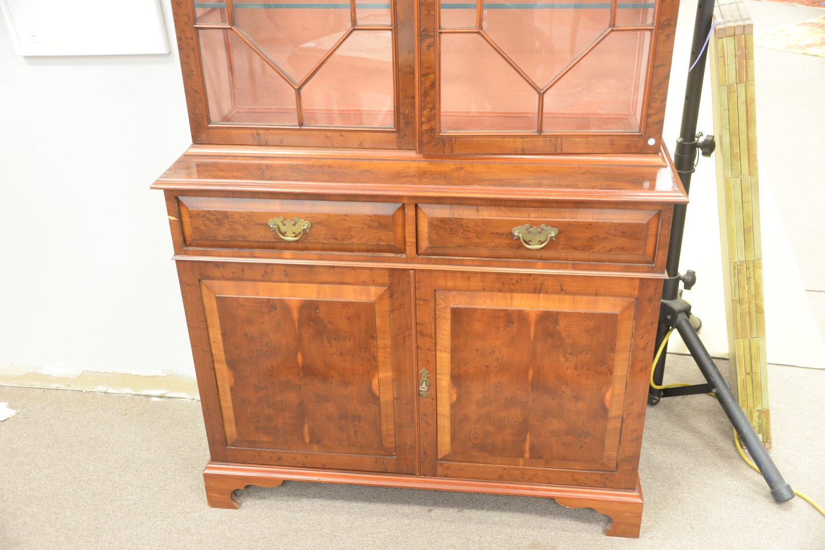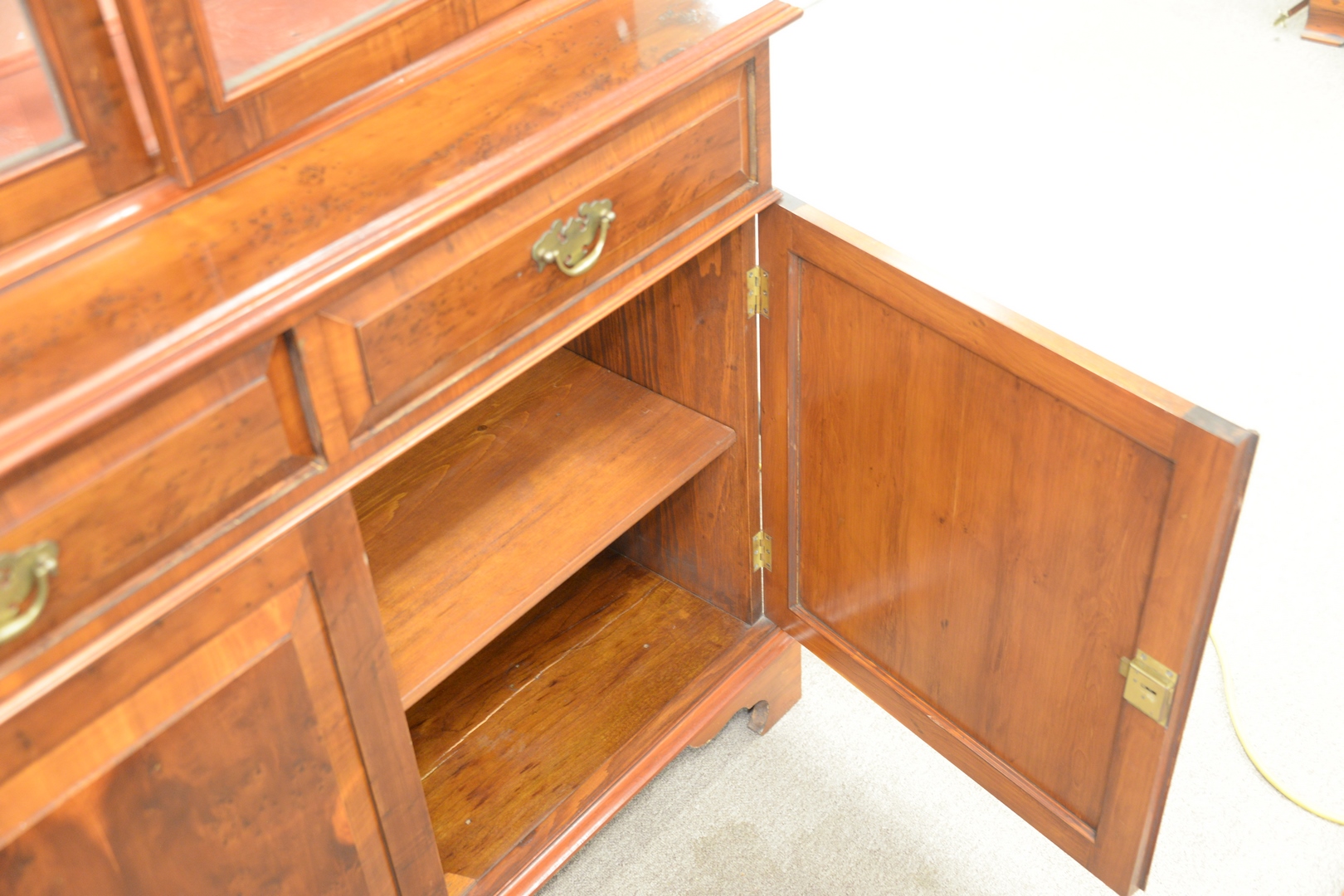 Two-Part Cabinet, with glass shelves, burlwood, height 82 inches, width 39 inches.