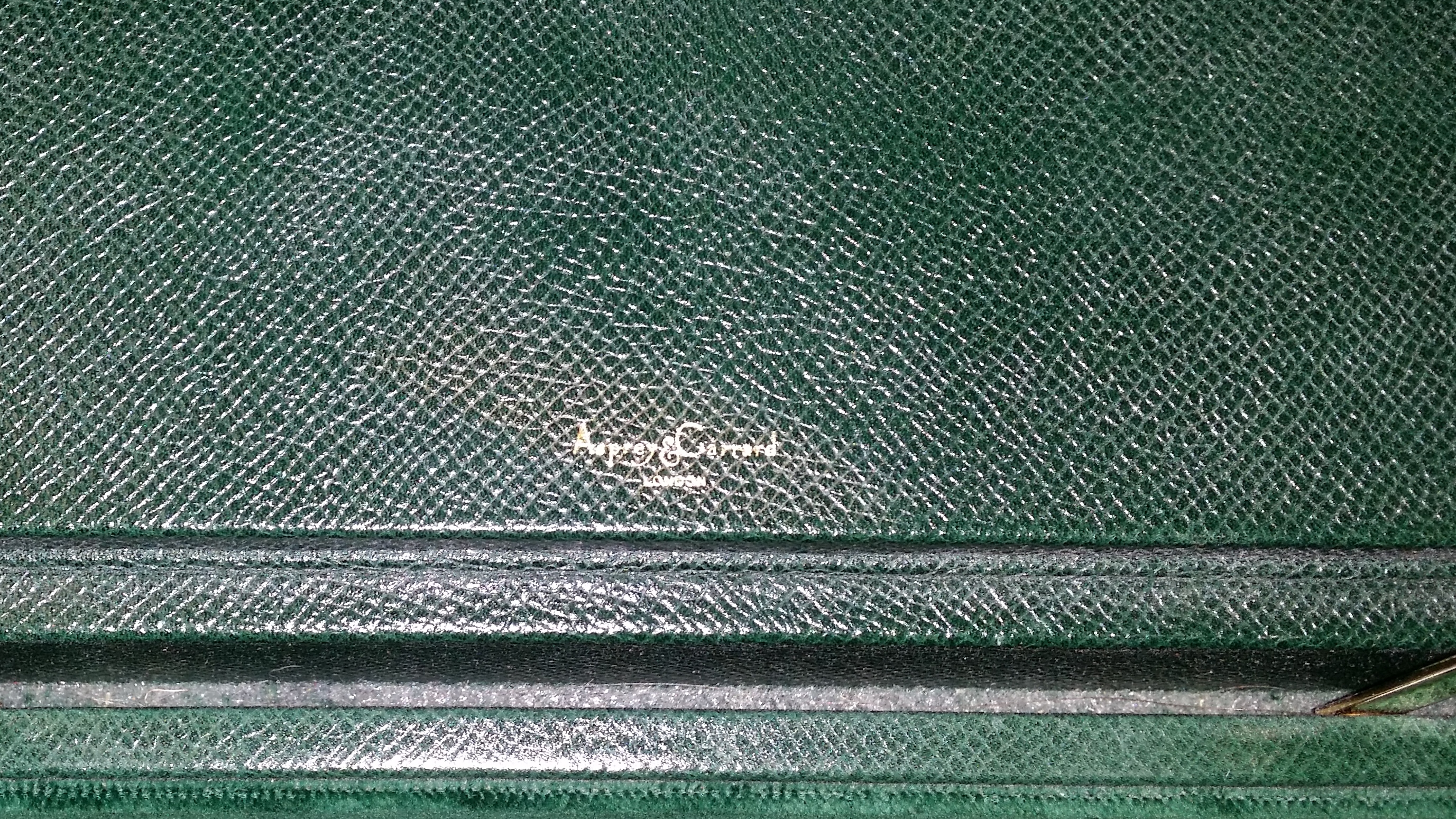 Vintage Asprey green jewelry box having fold-out compartments with removable velour pads, gold double lock, and accents, marked Asprey & Garrard light scuff marks and one minor tear. ht. 7 1/2in. lg. 12 1/2in. dp. 9 3/4in.