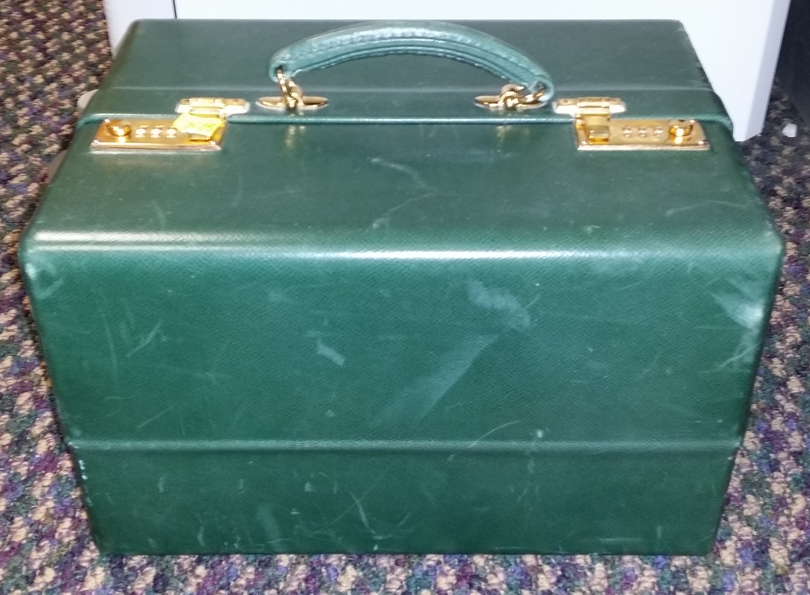 Lot 110: Vintage Asprey green jewelry box having fold-out compartments with removable velour pads, gold double lock, and accents, marked Asprey & Garrard light scuff marks and one minor tear. ht. 7 1/2in. lg. 12 1/2in. dp. 9 3/4in.