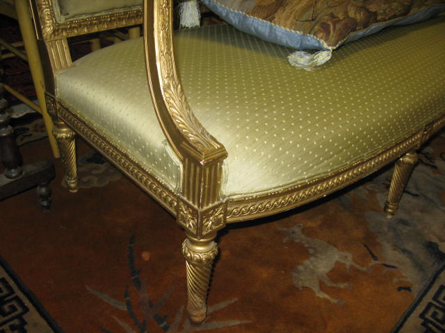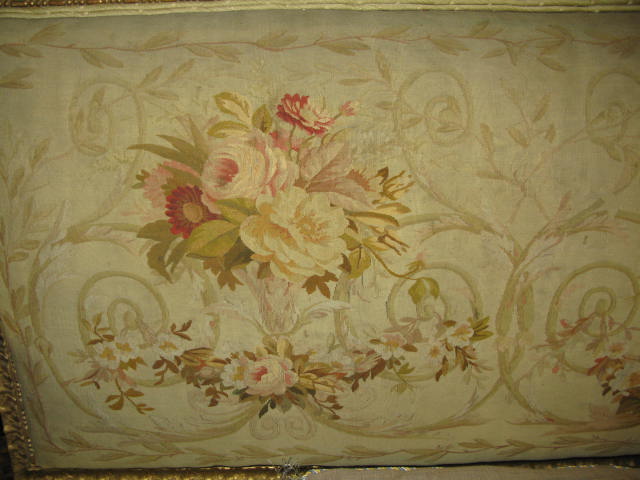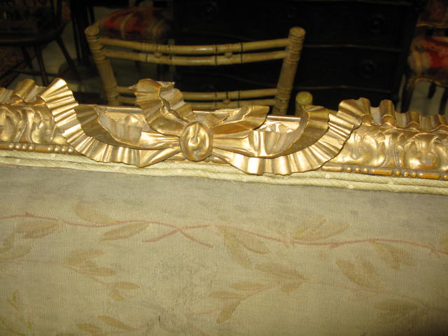 French gilt sofa having early 19th century oboson tapestry upholstered back with reupholstered seat, center carved bow is missing