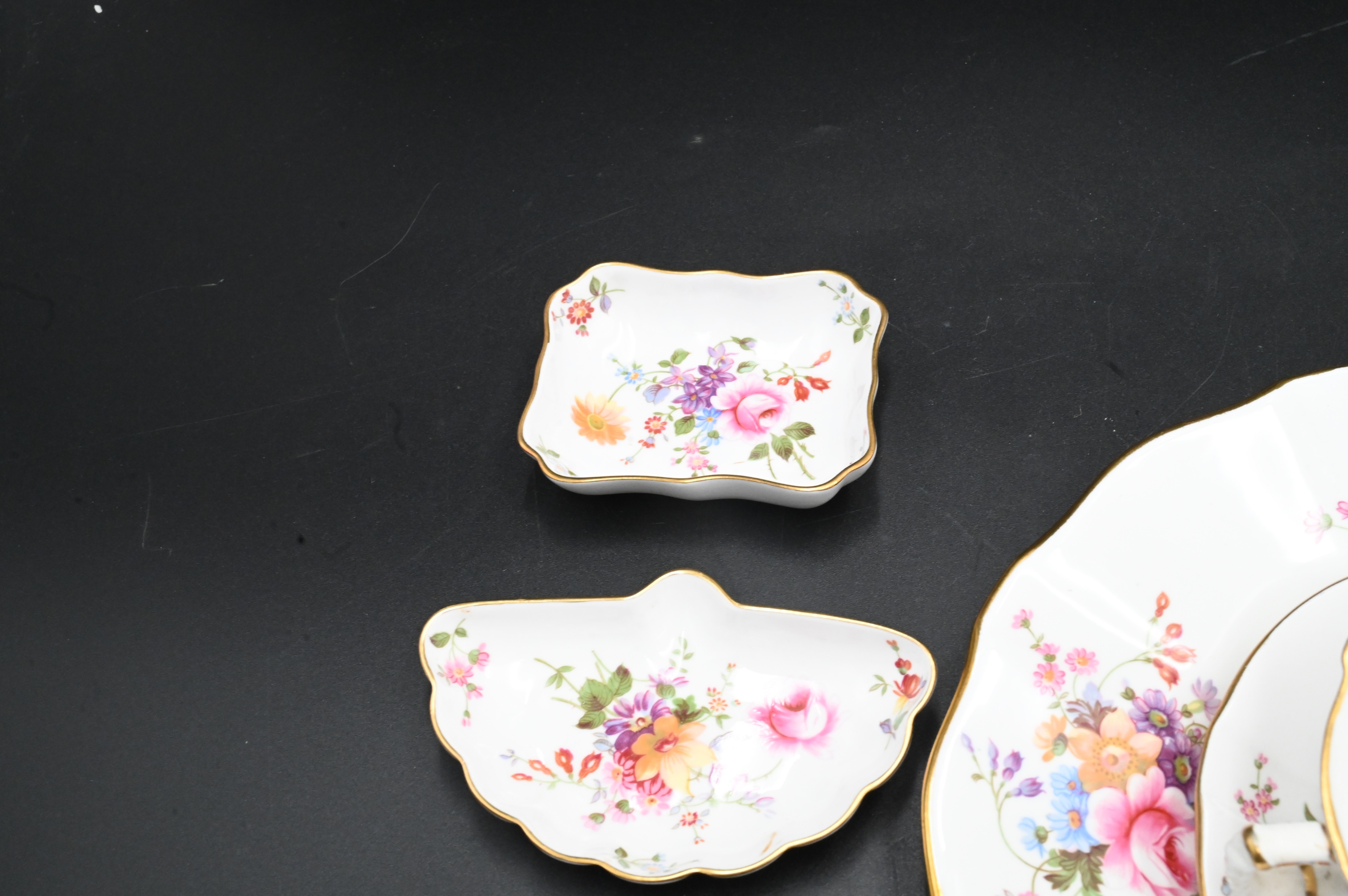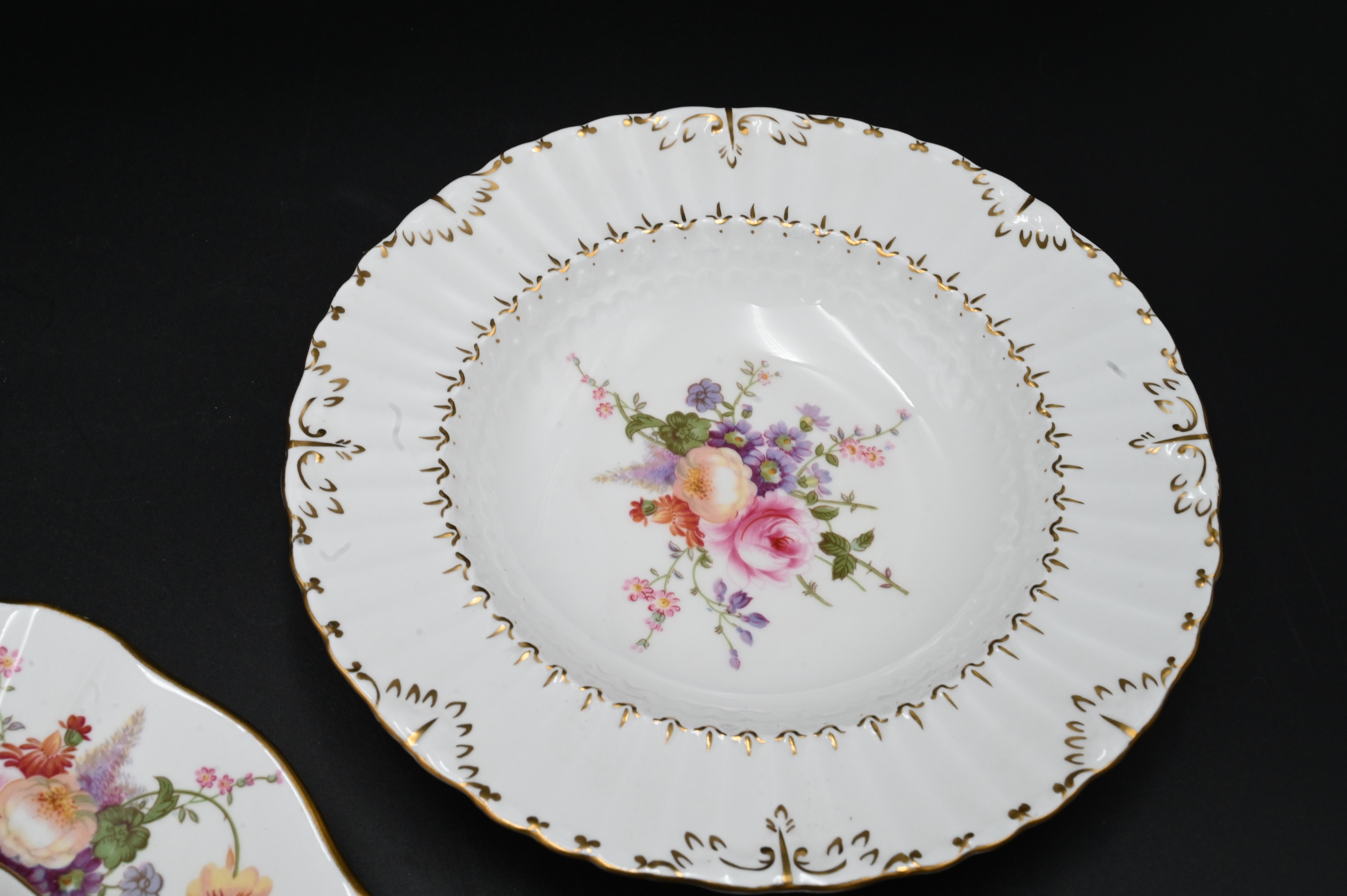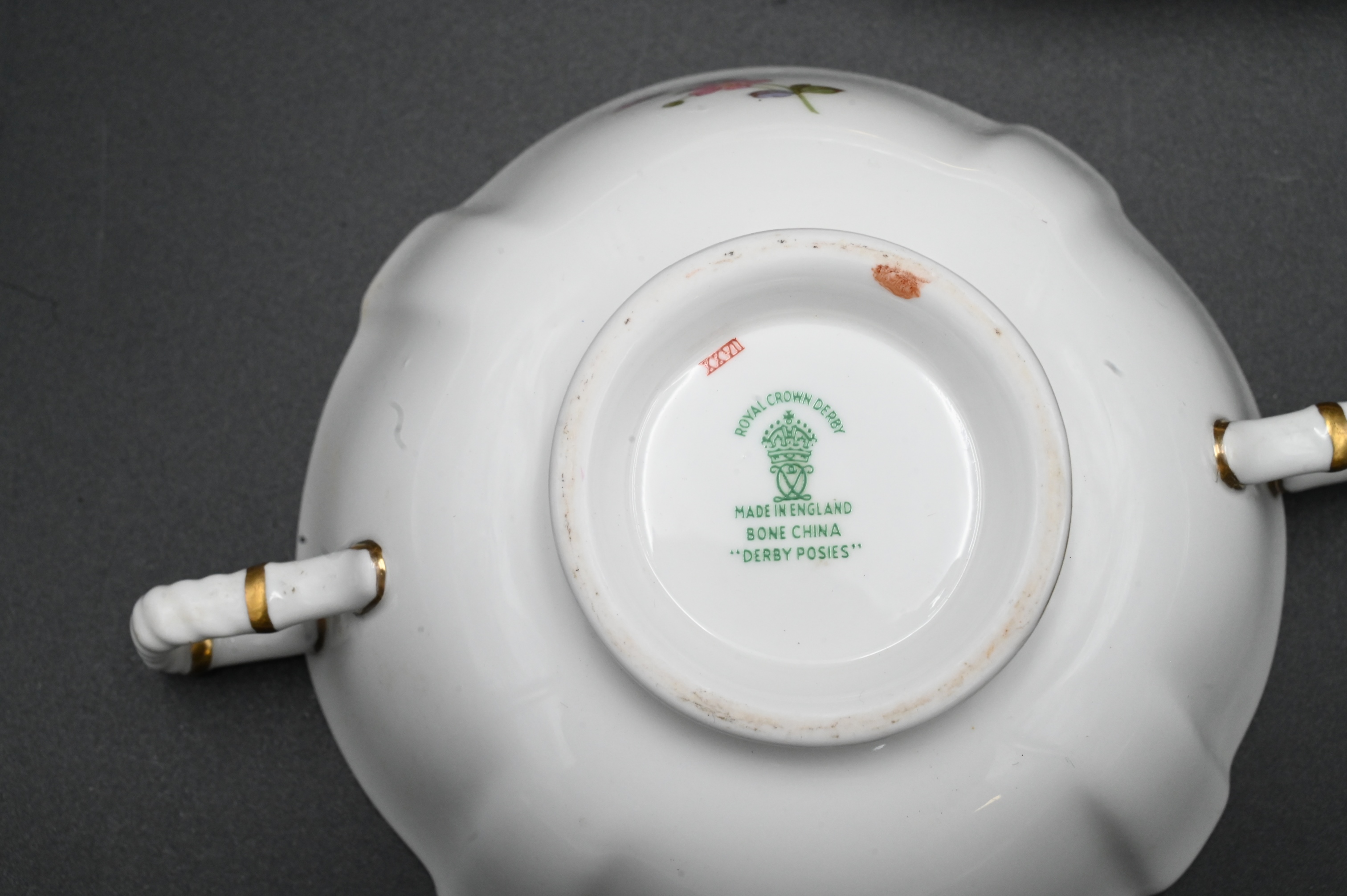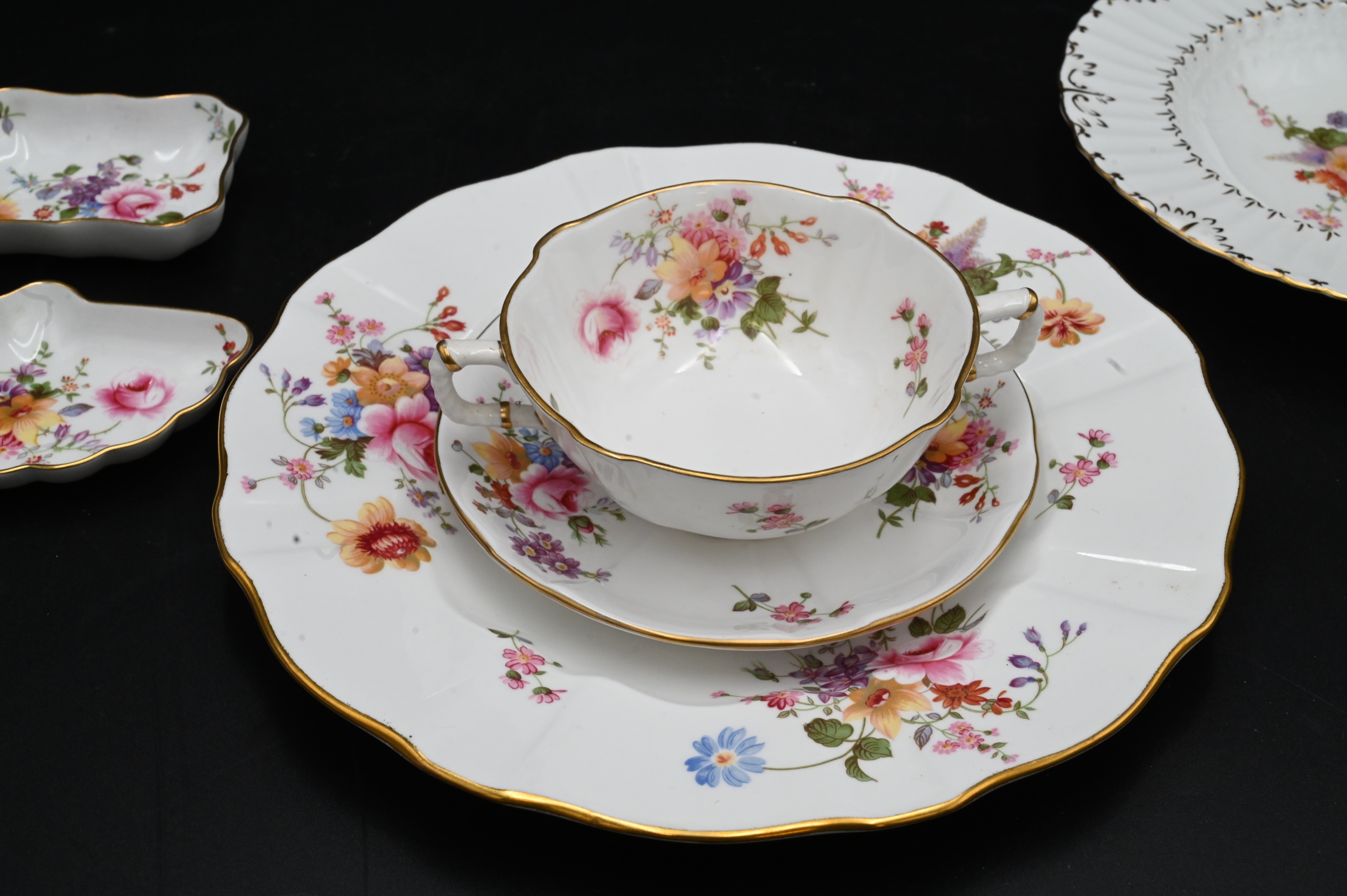 94 Piece Royal Crown Derby “Derby Posies” Dinner Service, to include 4 dinner plates, 5 flat soup, 11 cups, 9 saucers, 5 cream soups, 5 bread and butter plates, 6 cream soup underplates, 1 luncheon plate, 3 demitasse cups, 3 demitasse saucers, along with 42 miscellaneous pieces.