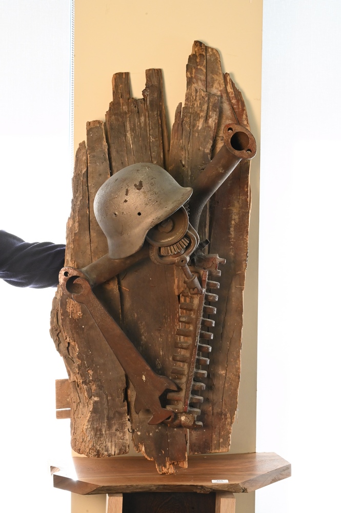 Lot 111: Albert Ceen, A Damnation of War, 1967, centerpiece at Nuremberg Museum, height 50 inches, width 44 inches.