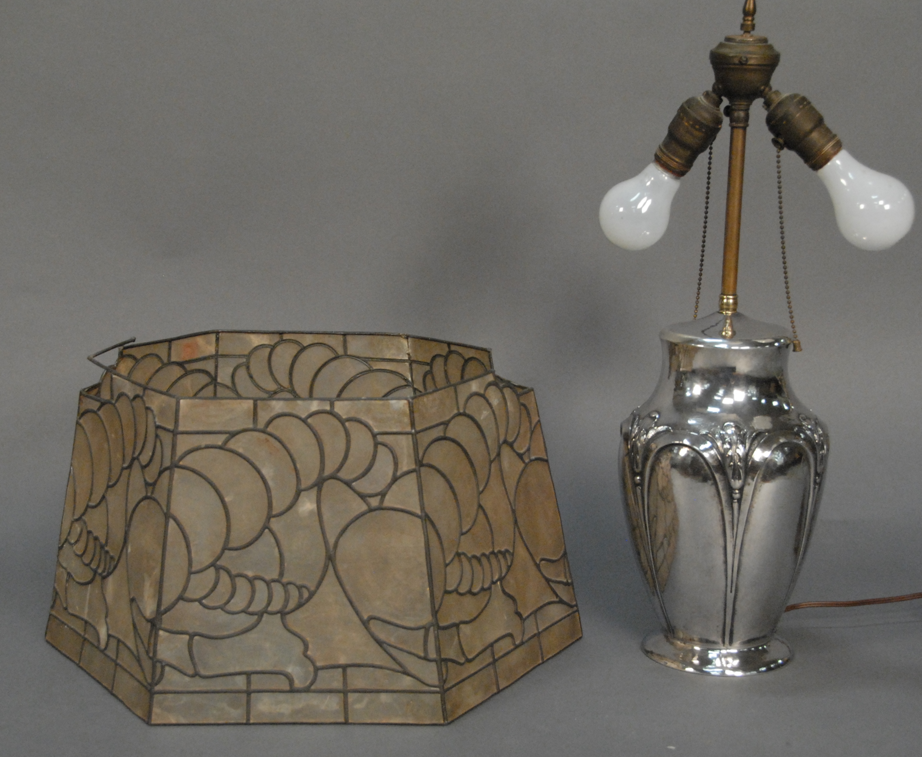 Clemens Friedell 1872-1973 sterling silver hand hammered table lamp in arts & crafts style, signed on base Friedell Pasadena Sterling with original leaded shade top of shade with two missing parts. ht. of vase 11 1/2in.