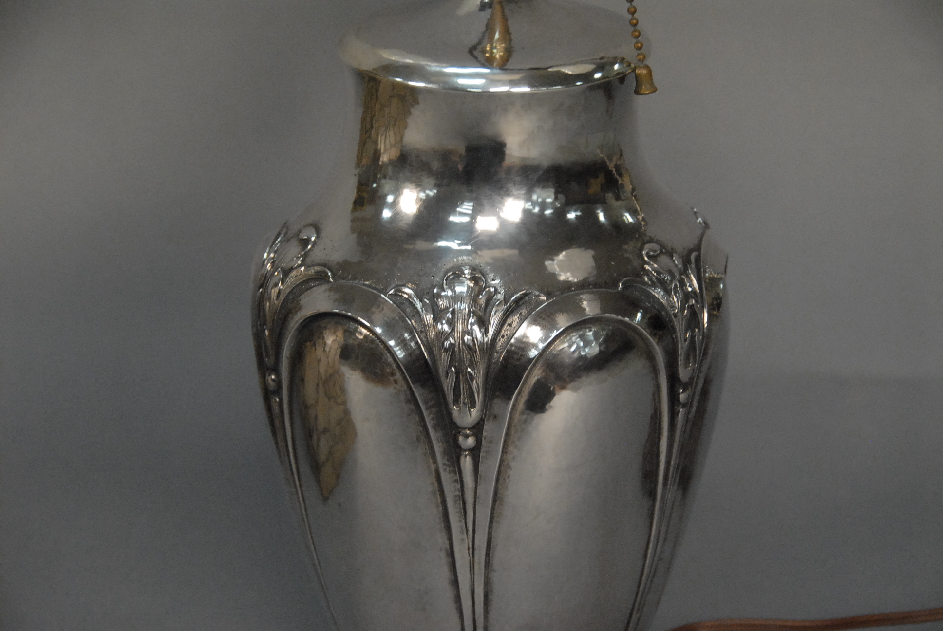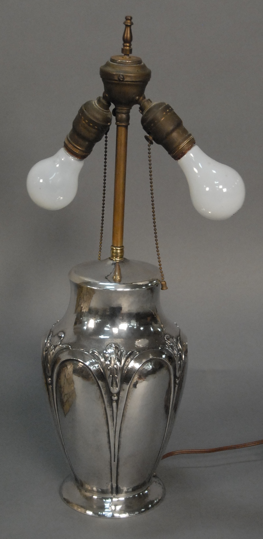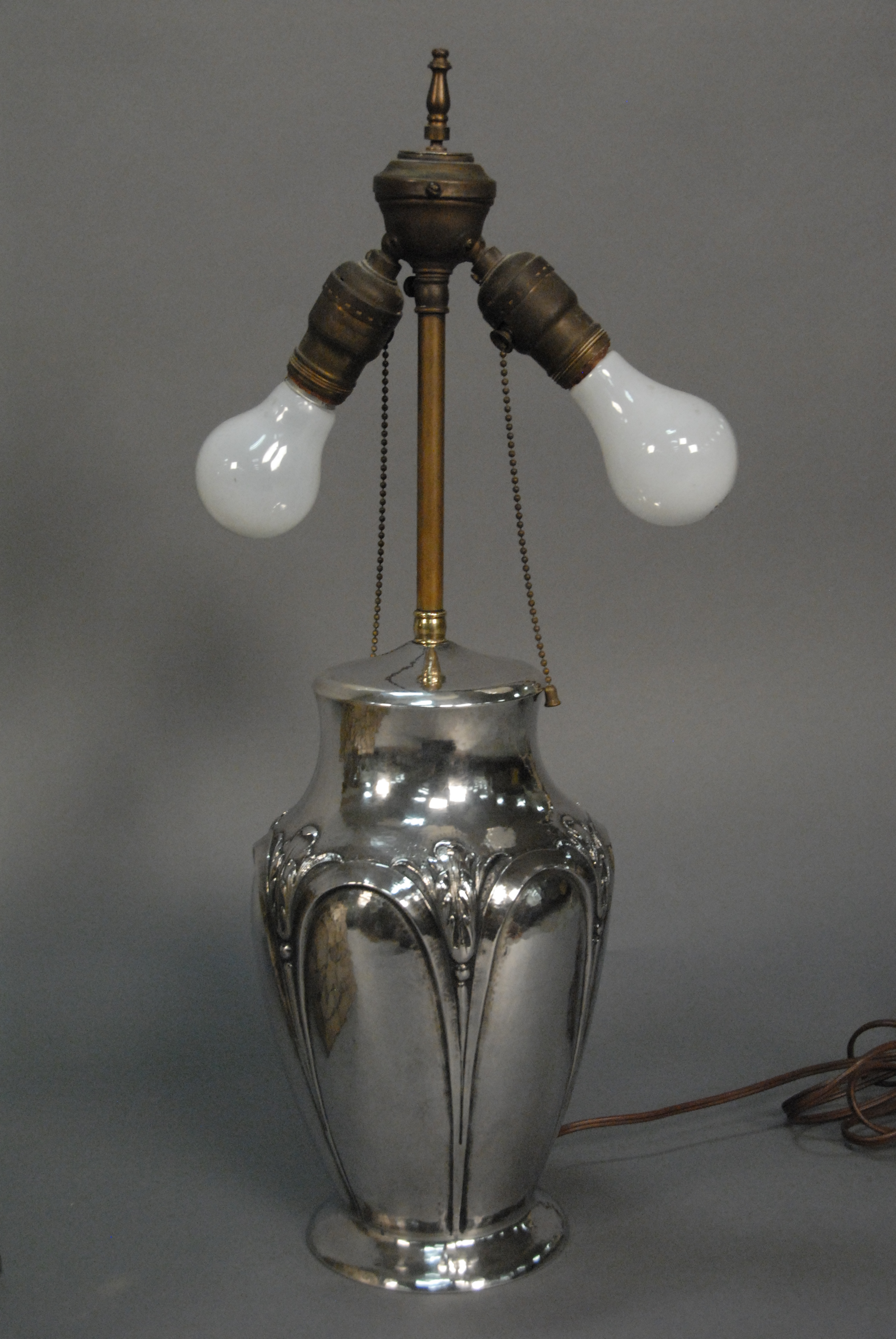 Lot 111: Clemens Friedell 1872-1973 sterling silver hand hammered table lamp in arts & crafts style, signed on base Friedell Pasadena Sterling with original leaded shade top of shade with two missing parts. ht. of vase 11 1/2in.