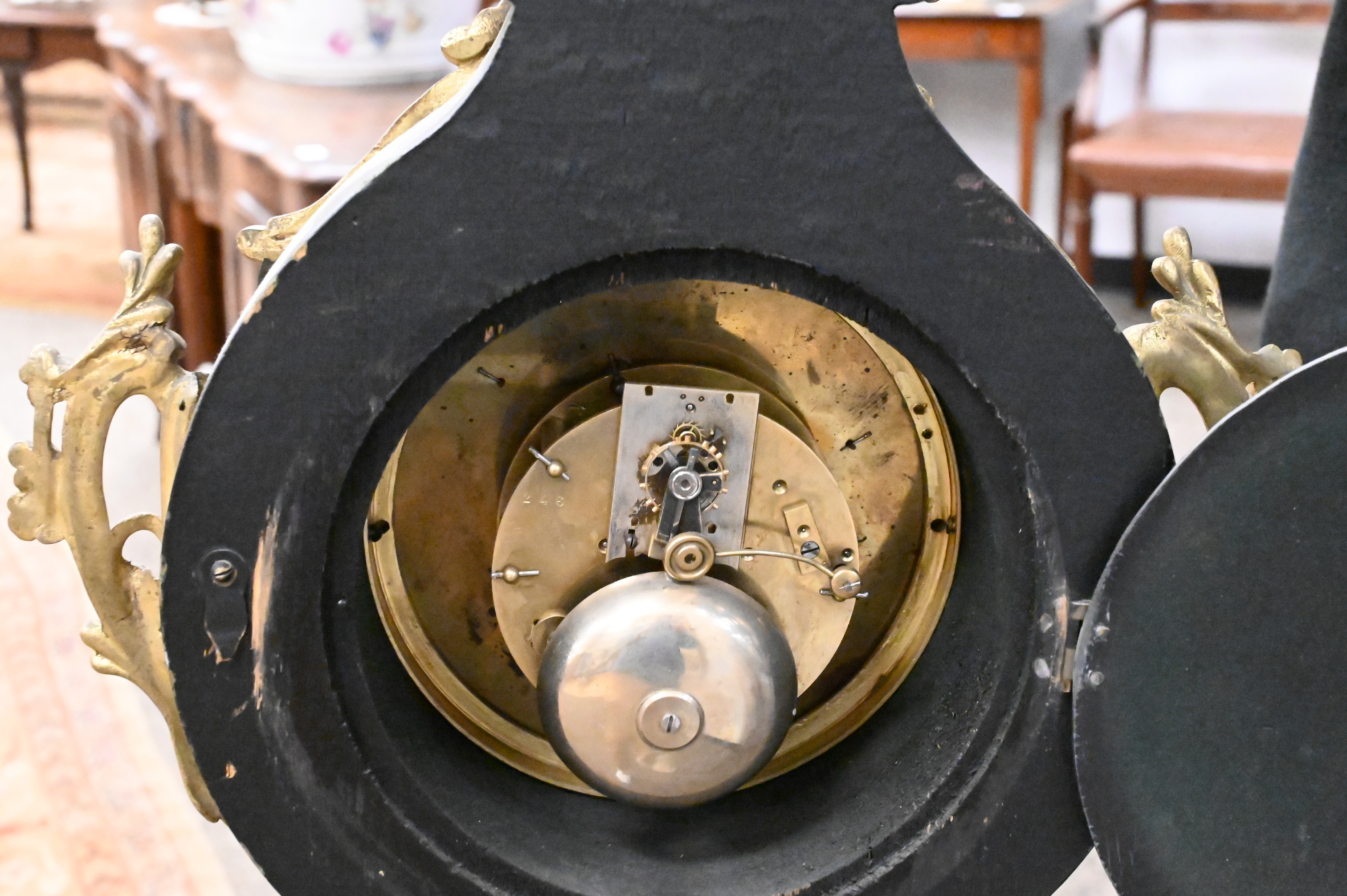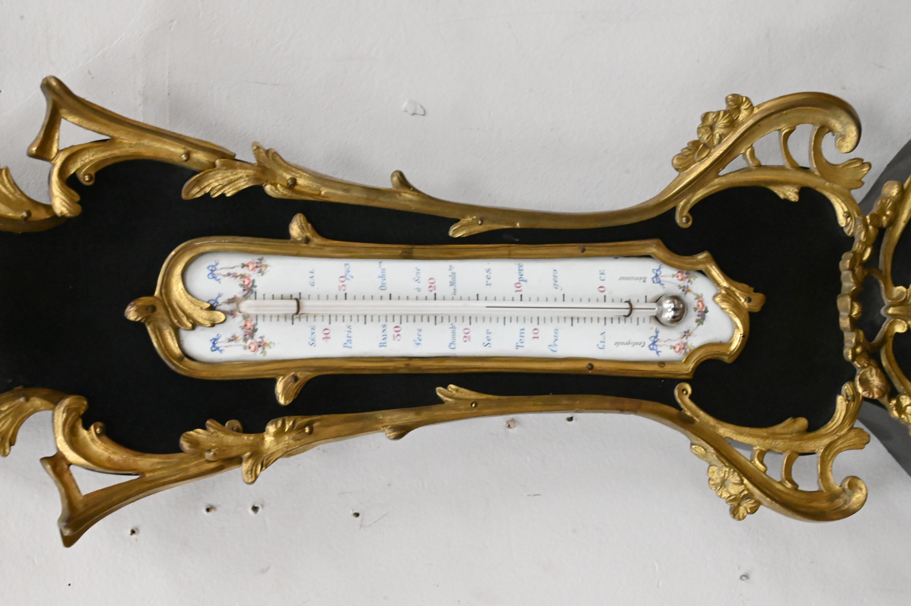 clock and thermometer mounted in an elongated shaped case, finished in matte black with elaborate gilt-bronze rococo mounts of scrolling foliage and cresting, the upper section features an enameled thermometer plate painted with floral sprays and dual temperature scales, the lower section houses a circular enamel dial with Roman numerals and pierced hands within a gilt-bronze surround, 19th Century