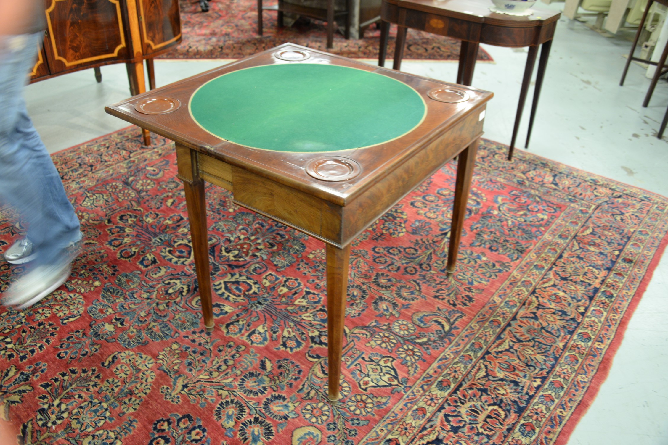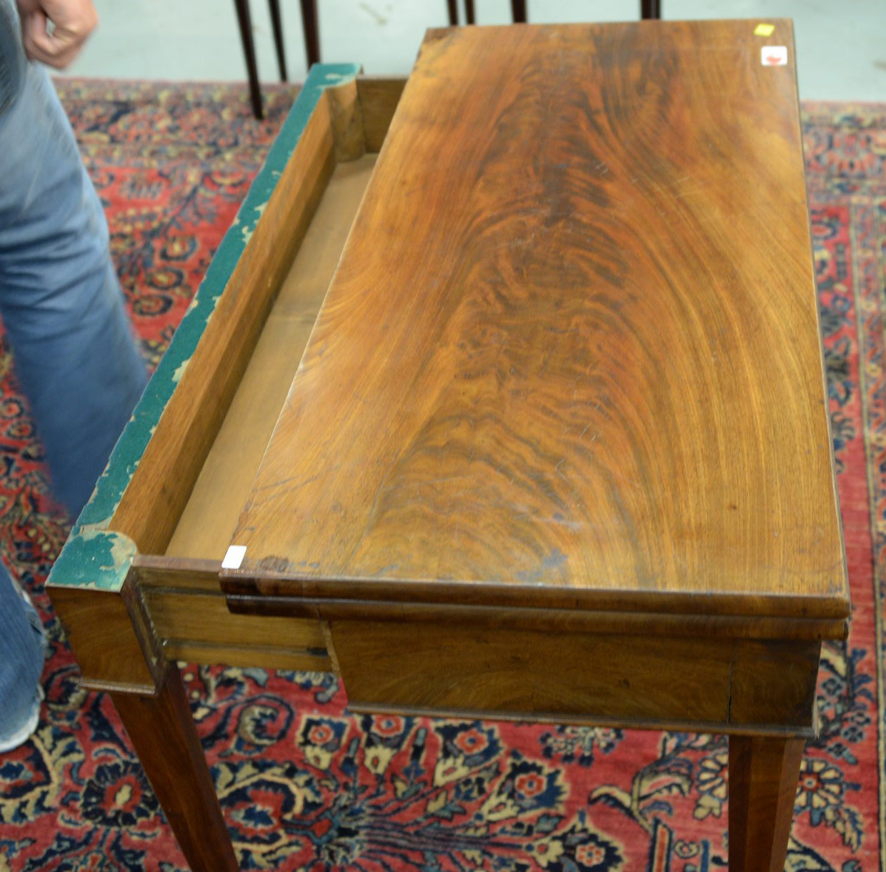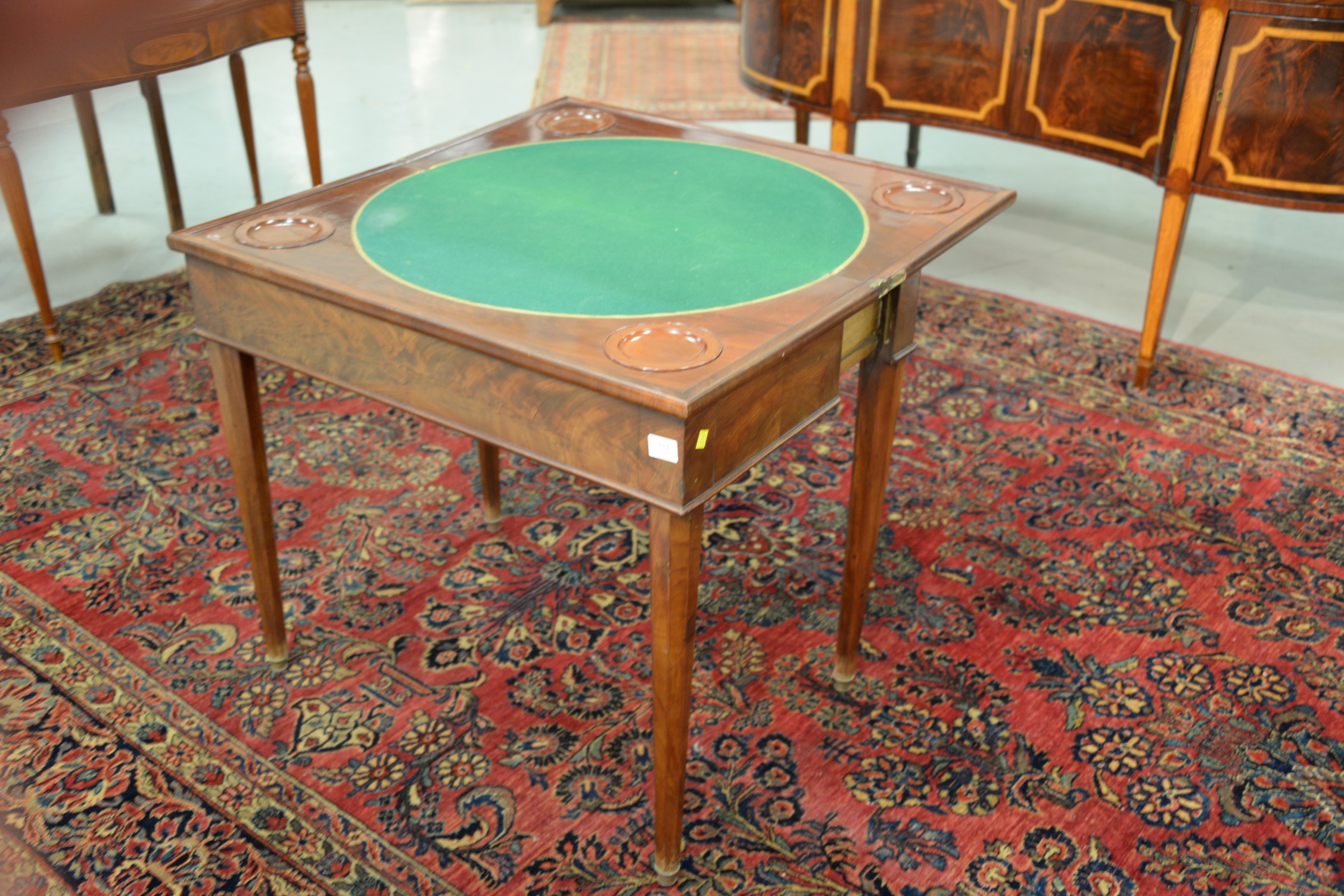 Lot 111: George III mahogany game table, interior with felt top and scooped chip holders, circa 1810-1820. ht. 30 in. dp. 17 in. wd. 34 in.