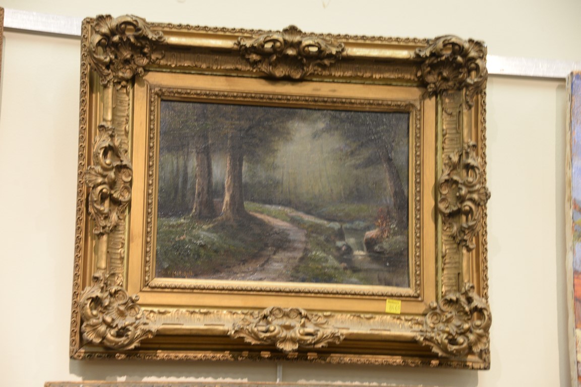 Lot 111: Group of eight 19th and 20th century paintings including Maggie Mills, oil on canvas, pond with swans two small landscapes signed P…