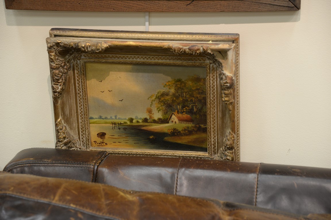 Group of eight 19th and 20th century paintings including Maggie Mills, oil on canvas, pond with swans two small landscapes signed Pinto an oil on canvas country farm landscape C.T. Mitchell, oil on canvas, Country Road Through Woods oil on board sailing at dusk and two primitive fall landscapes. 8 x 10 to 12 1/2 x 22 1/2 Provenance: Estate of Arthur C. Pinto, MD
