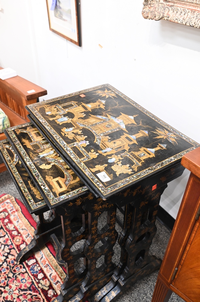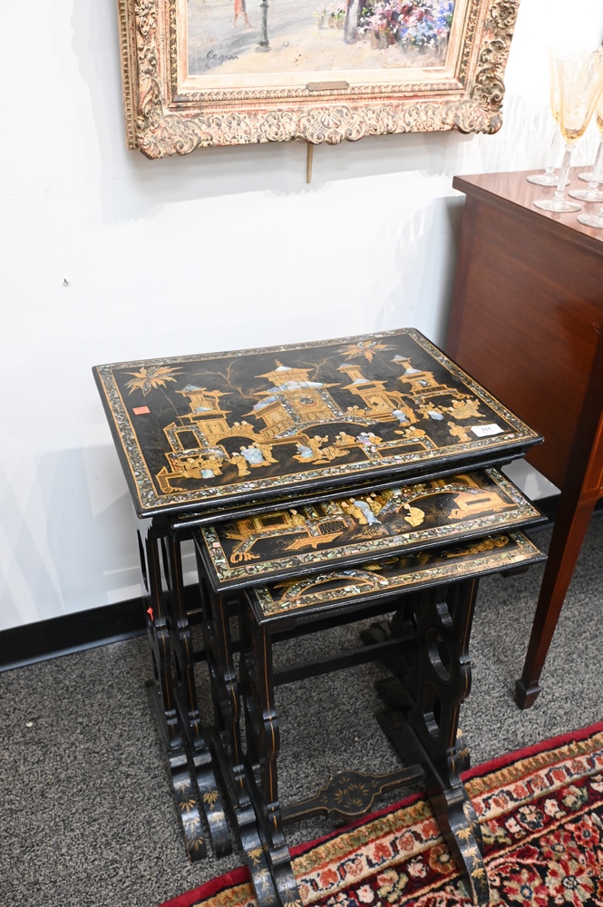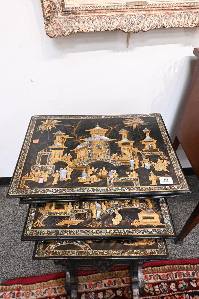 Lot 111: Group of Four Chinese Nesting Tables, all having mother of pearl accents, height 29 inches, top 15 1/2″ x 22″.