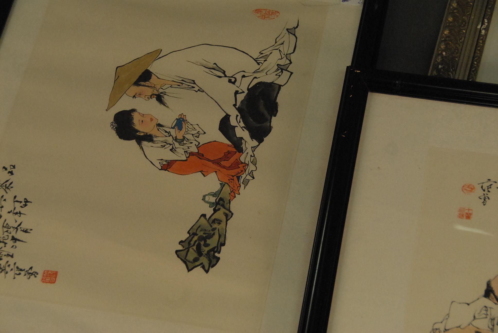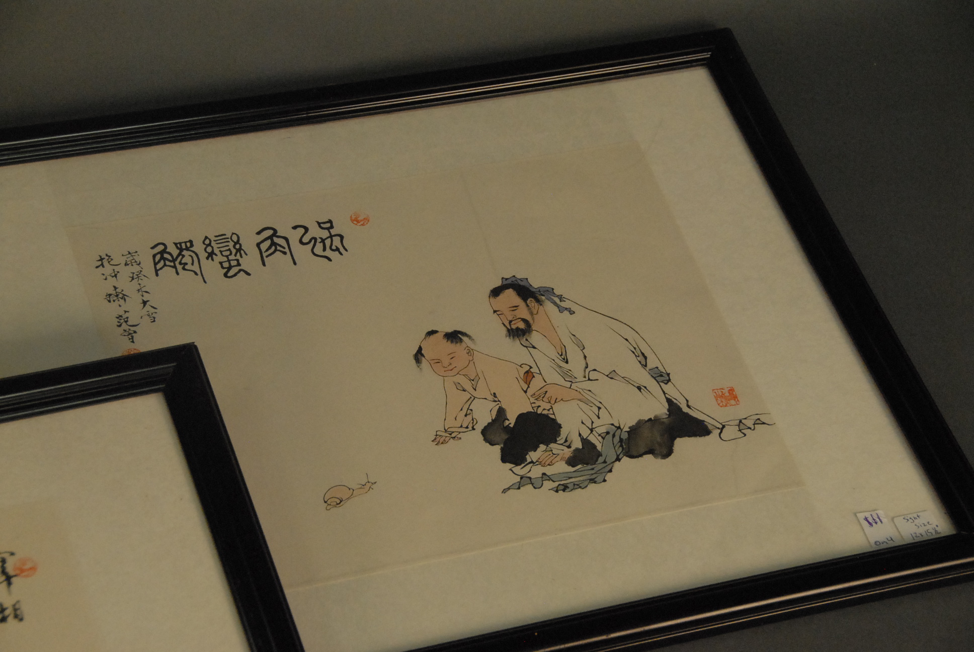 Lot 111: Group of four framed Oriental paintings, one of six character mark 4 x 4, two of a man with boy sight size 12: x 16, and one of a…