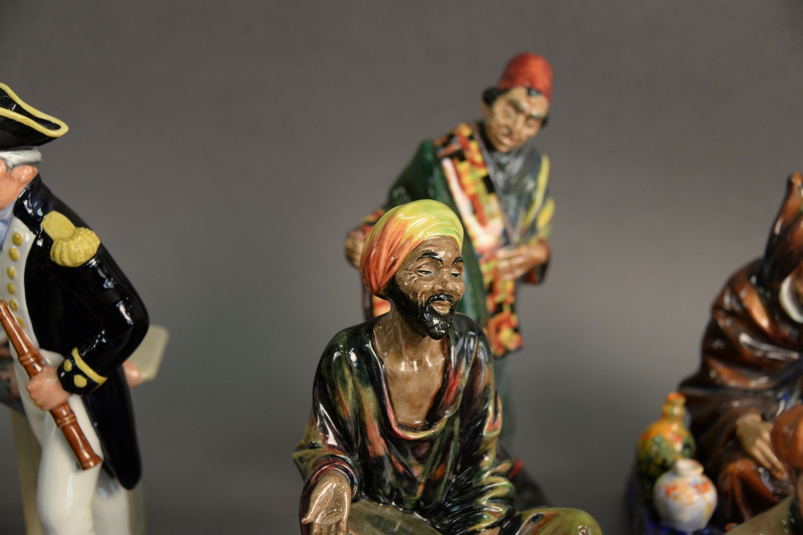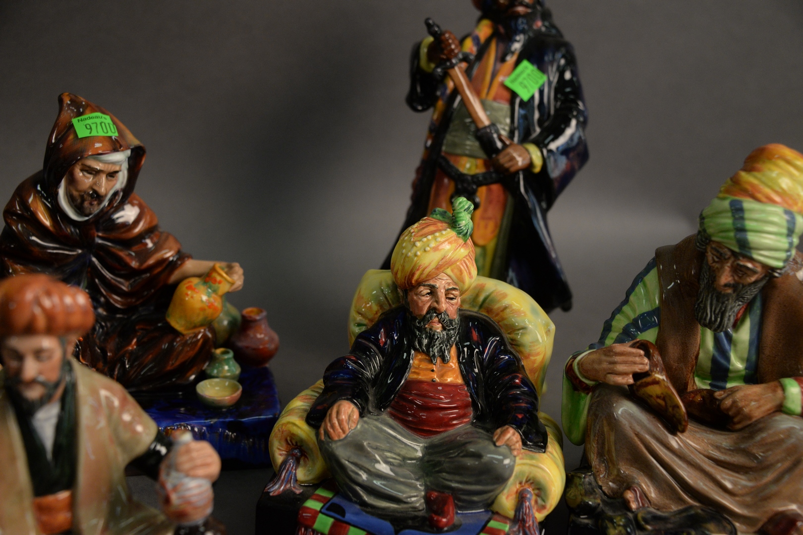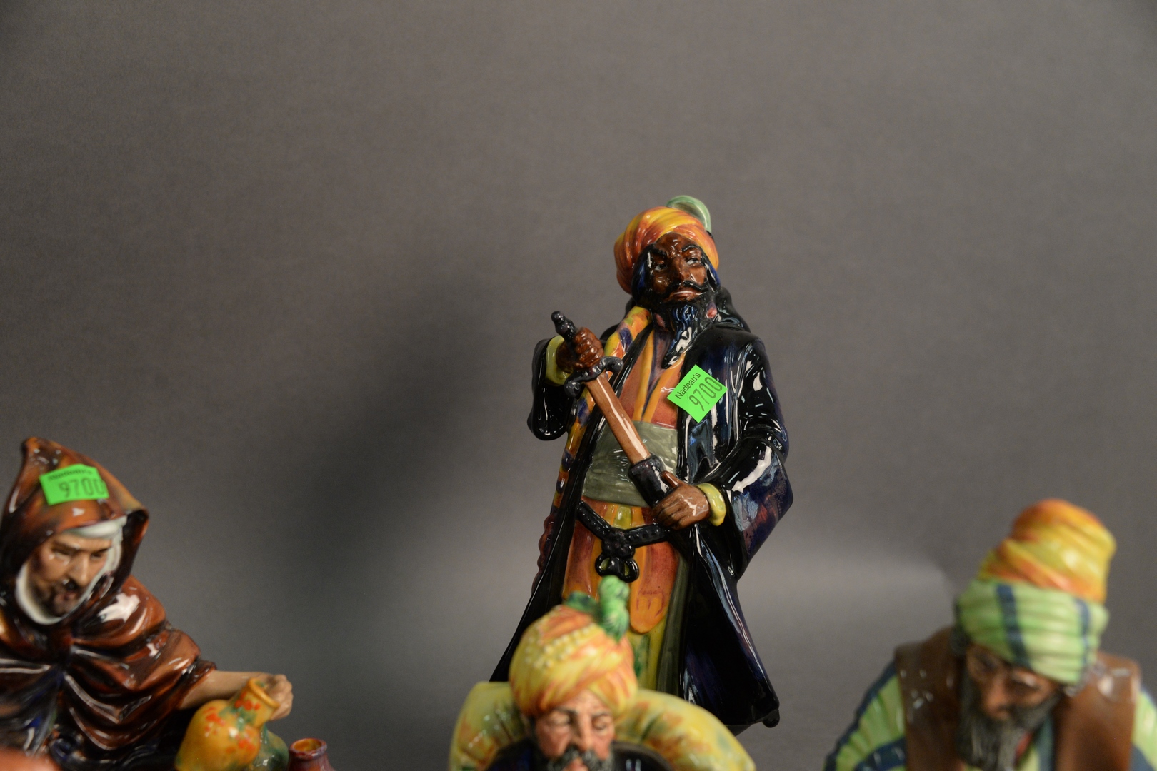 Lot 111: Group of Seven Royal Doulton Porcelain Arabian Figures, to include “Bluebeard”, “Carpet Seller”, “The Potter”, “Abdullah”, “Omar Khayyam”, “Cobbler”, along with “Mendicant”, each marked to the underside, height of tallest 10 1/2 inches. Provenance: Estate of James Wadhams.