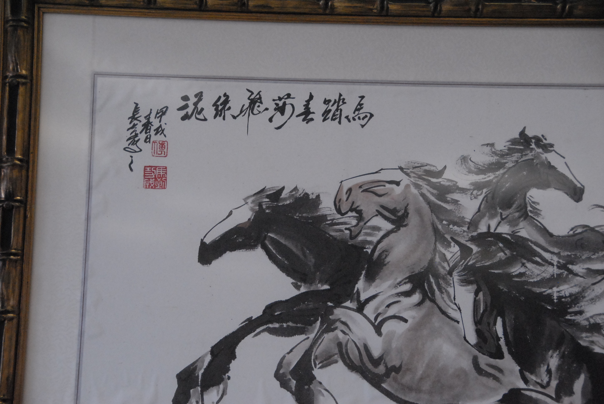 Oriental watercolor of horses running, signed top left and stamped lower right.