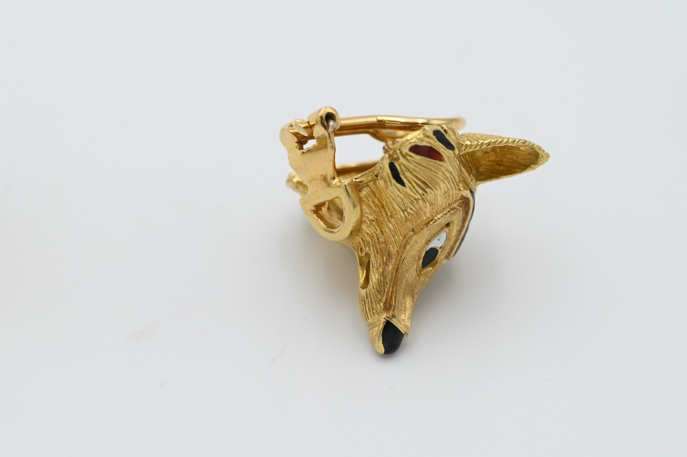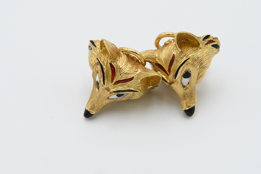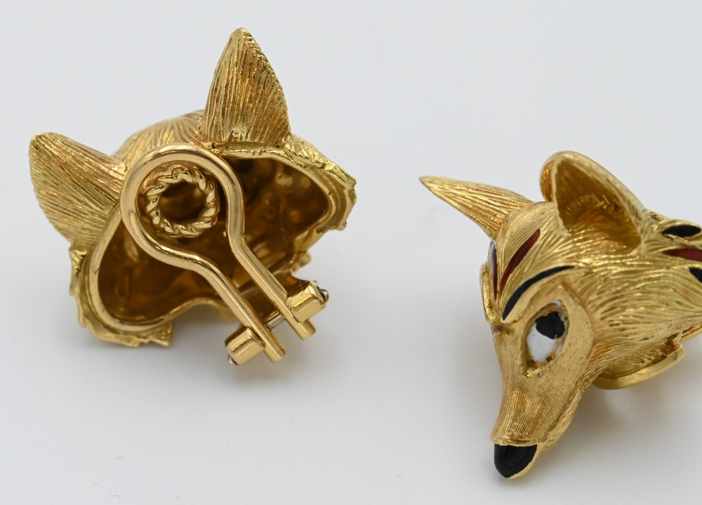 Lot 111: Pair of 18 Karat Gold Fox Earrings, having enameled face highlights, 22.2 grams.