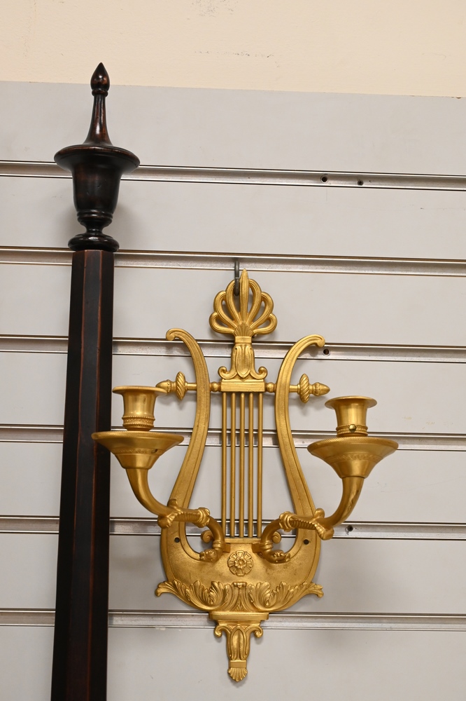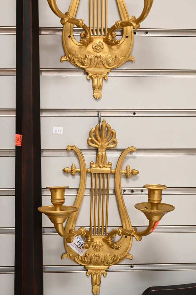 Lot 111: Pair of French Gilt Bronze Lyre Sconces, having two arms, electrified at one time, signed illegibly on back, height 13 1/2 inches.