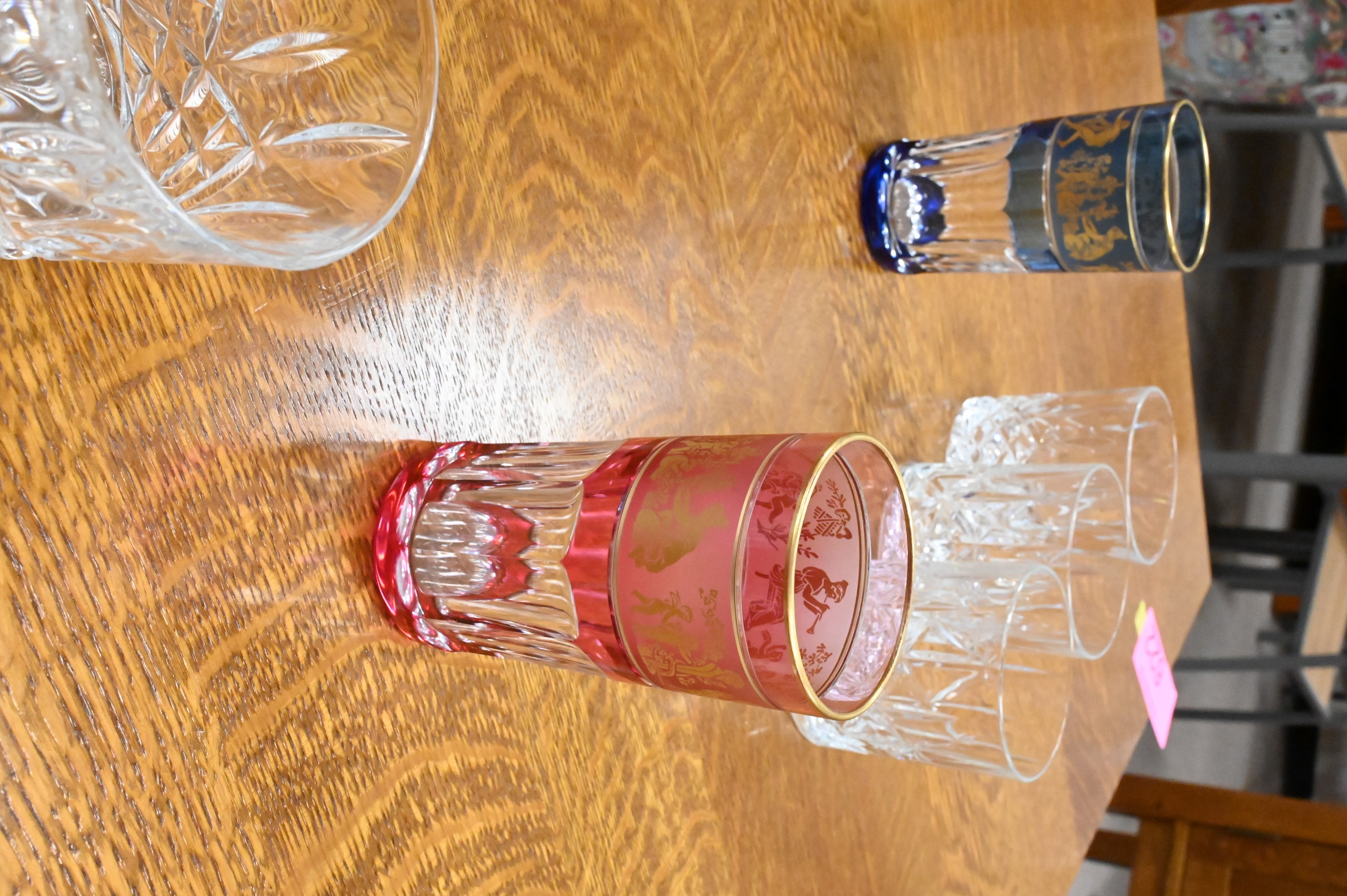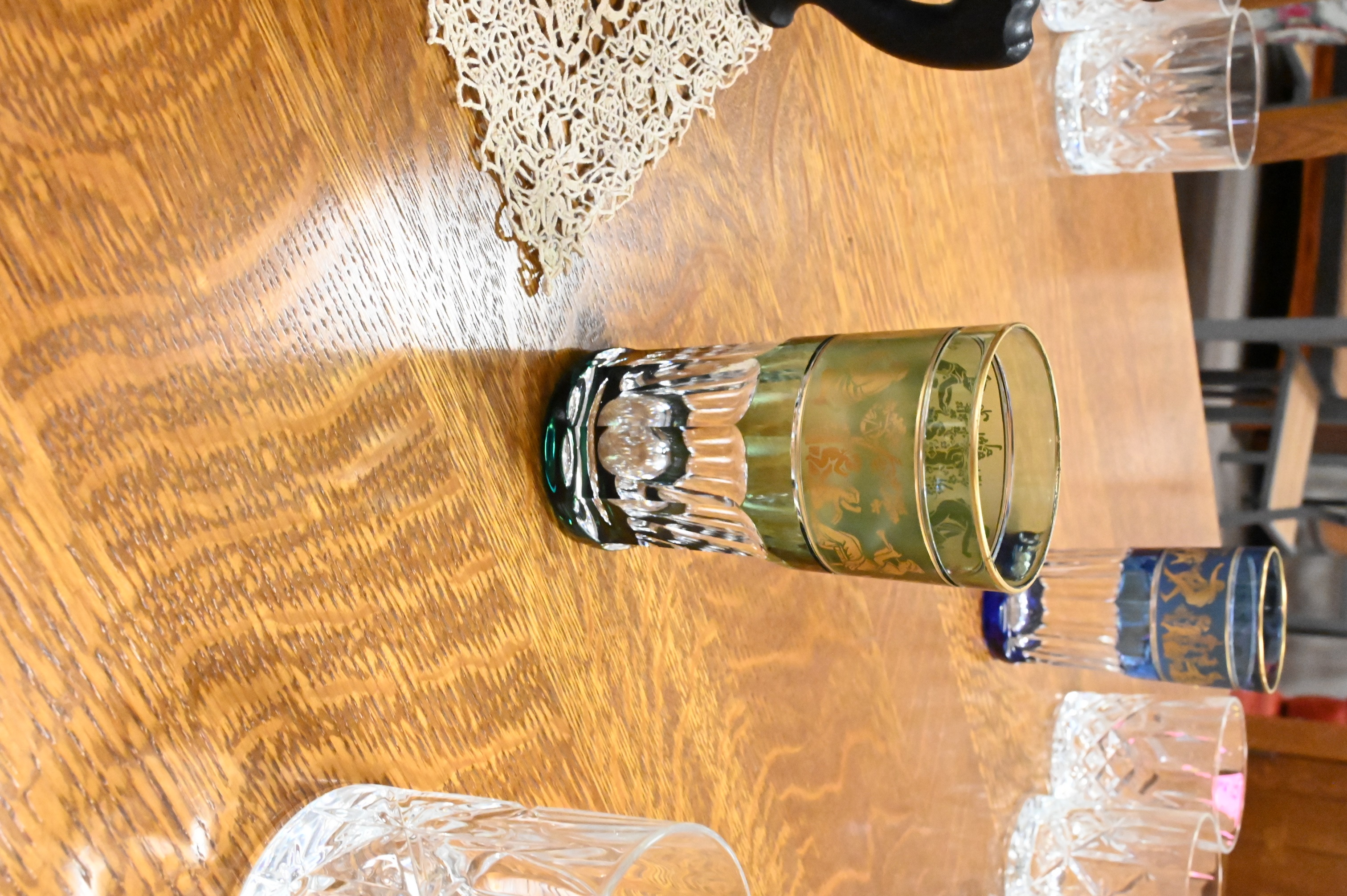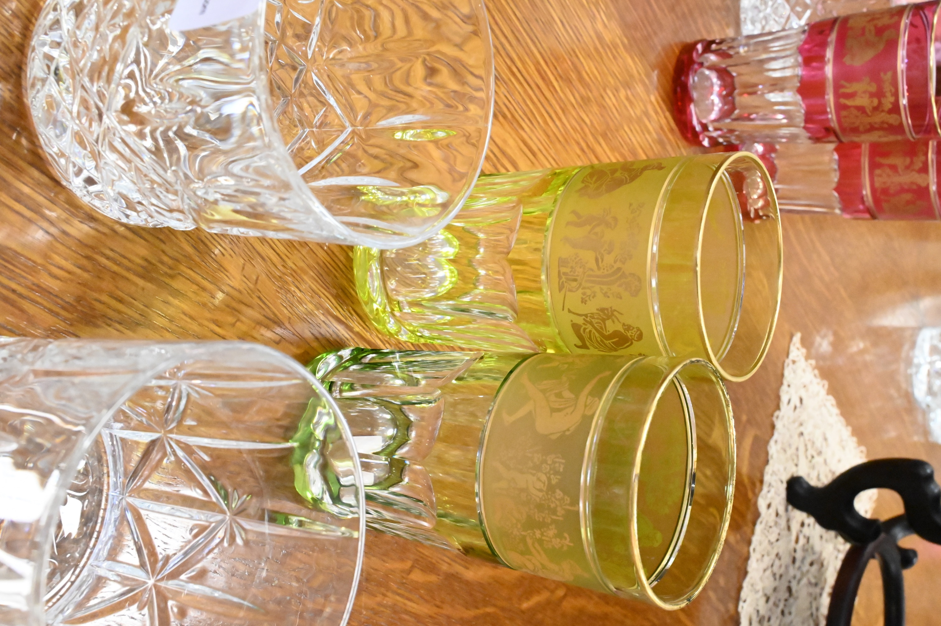 Set of 13 Various Color Crystal Glasses Having Classical Decorated Panels
