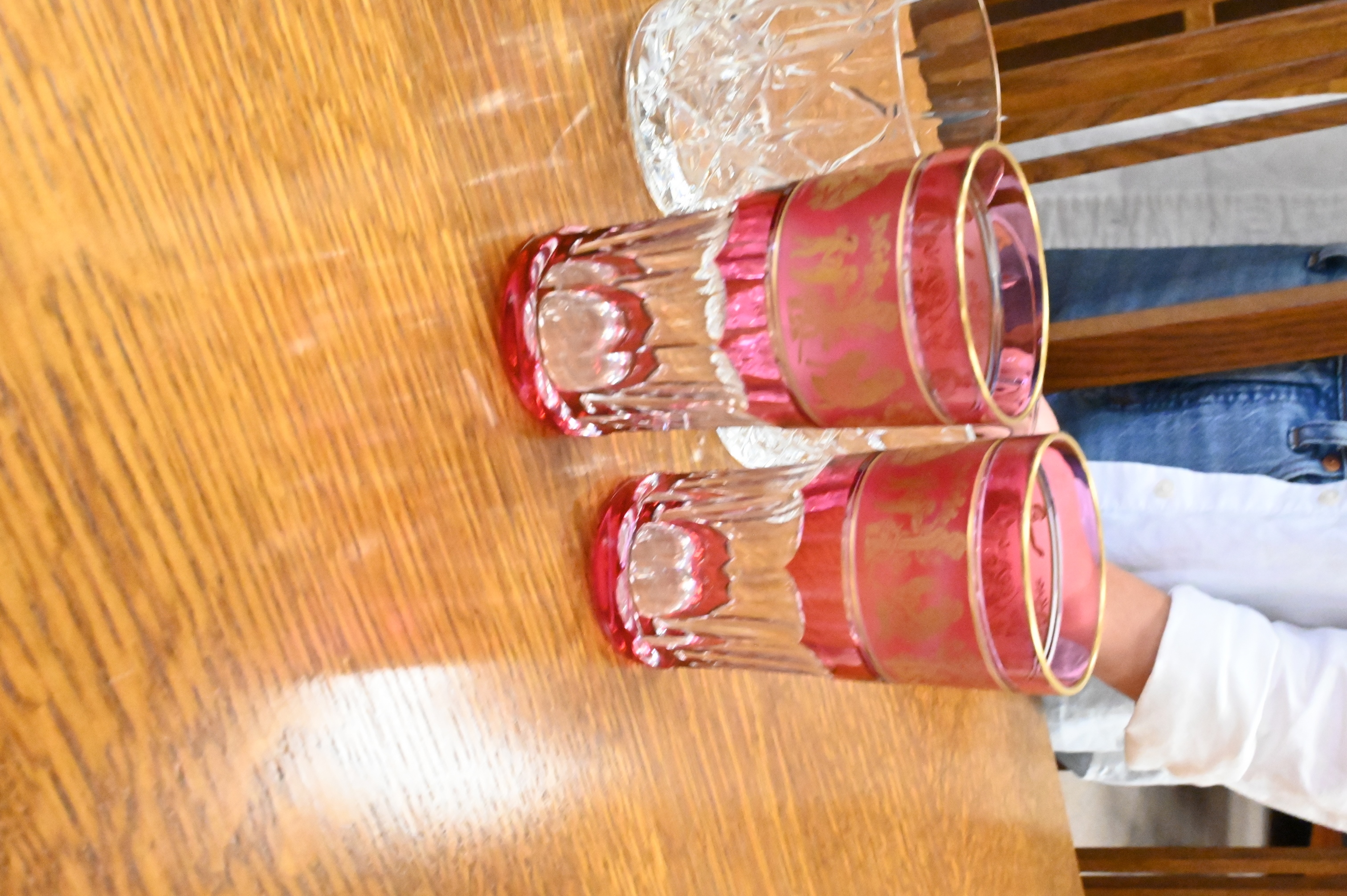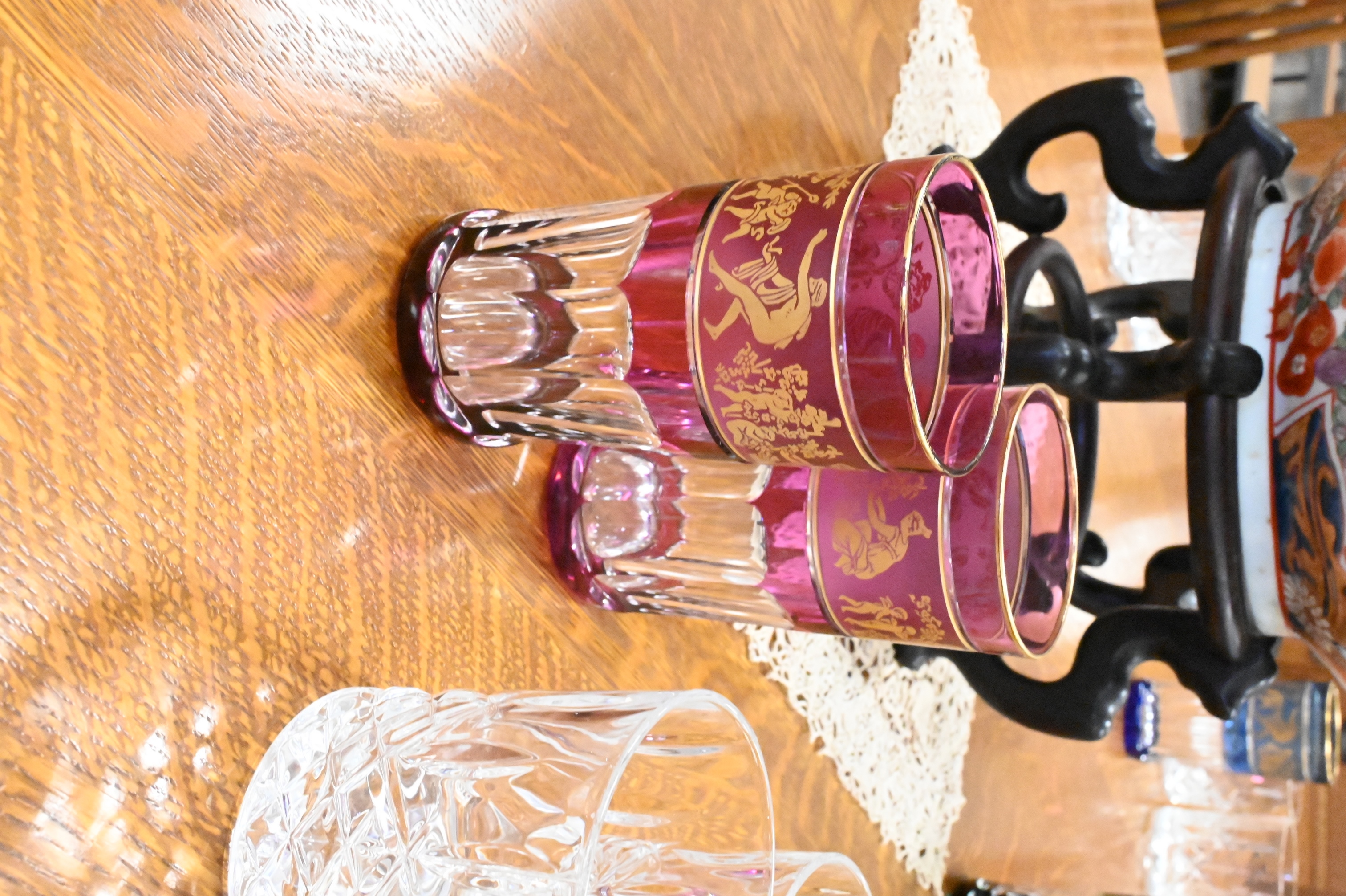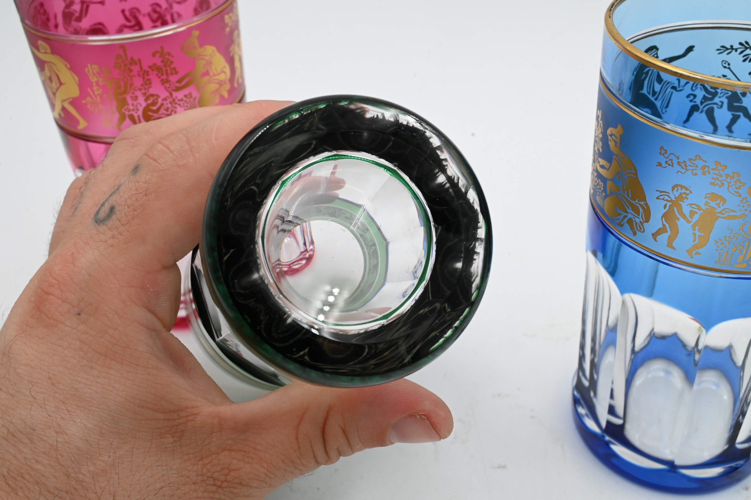 Set of 13 Various Color Crystal Glasses Having Classical Decorated Panels