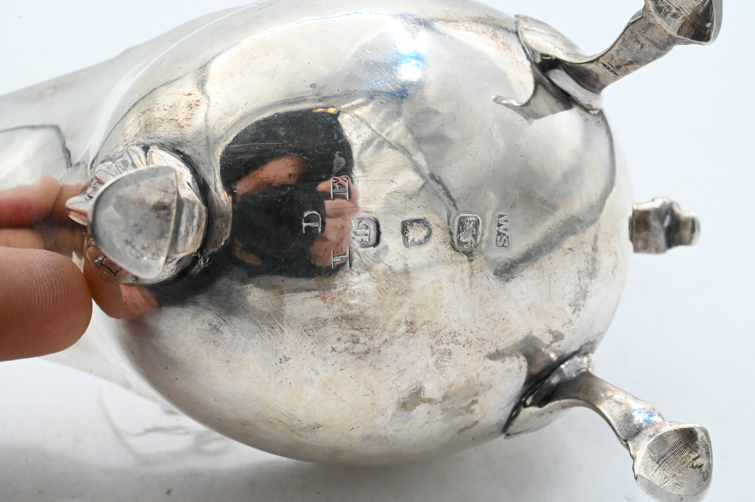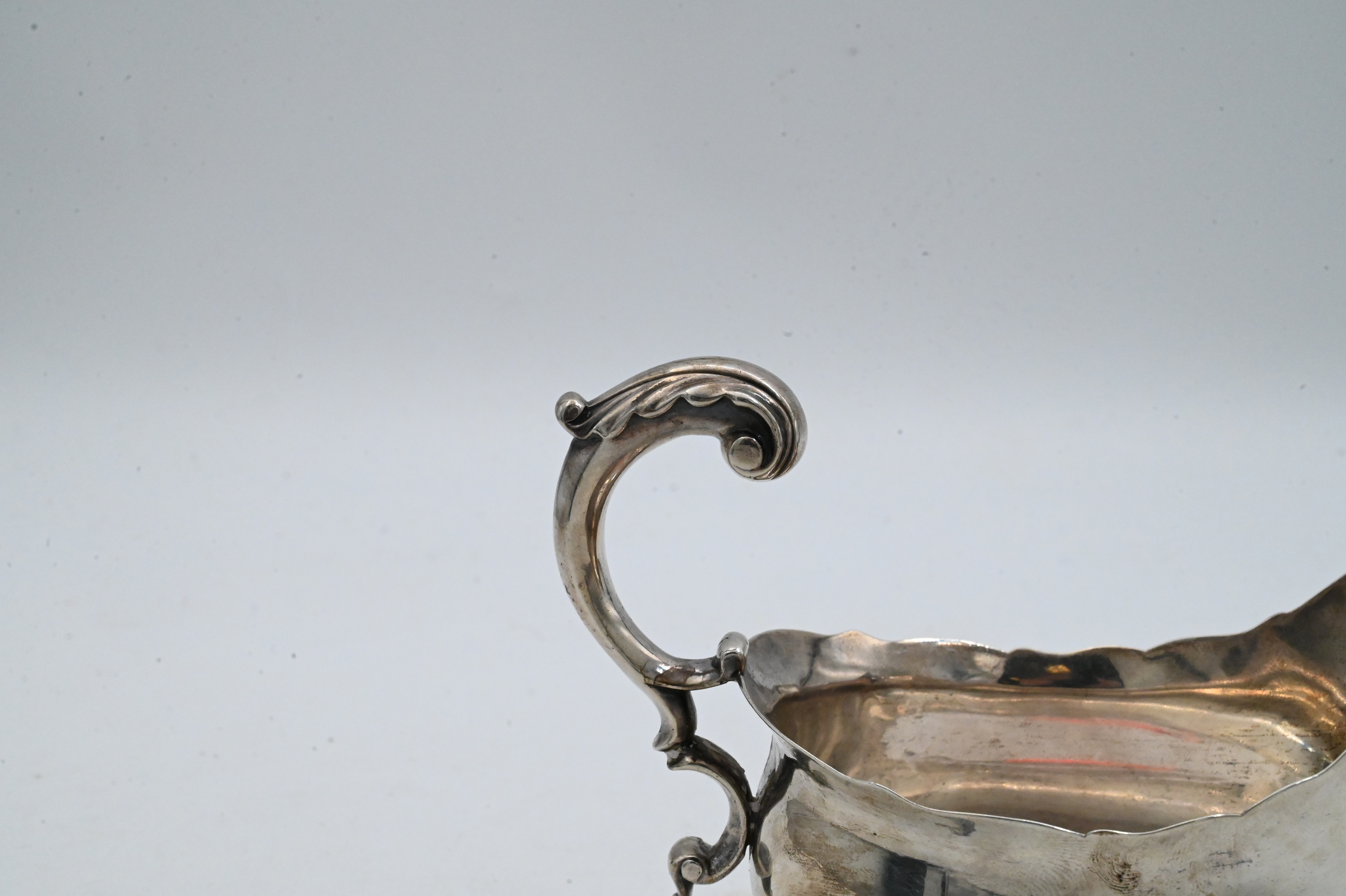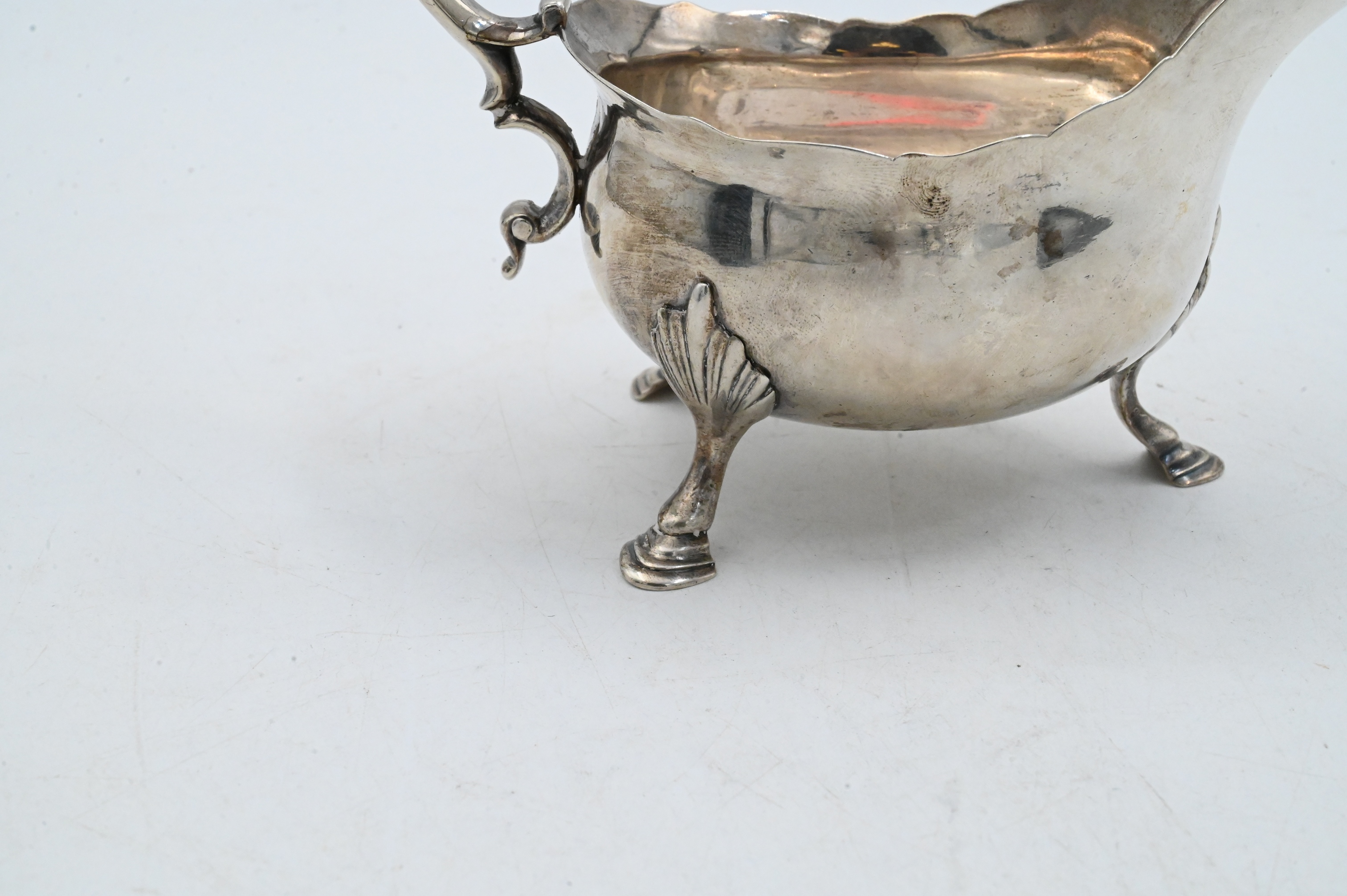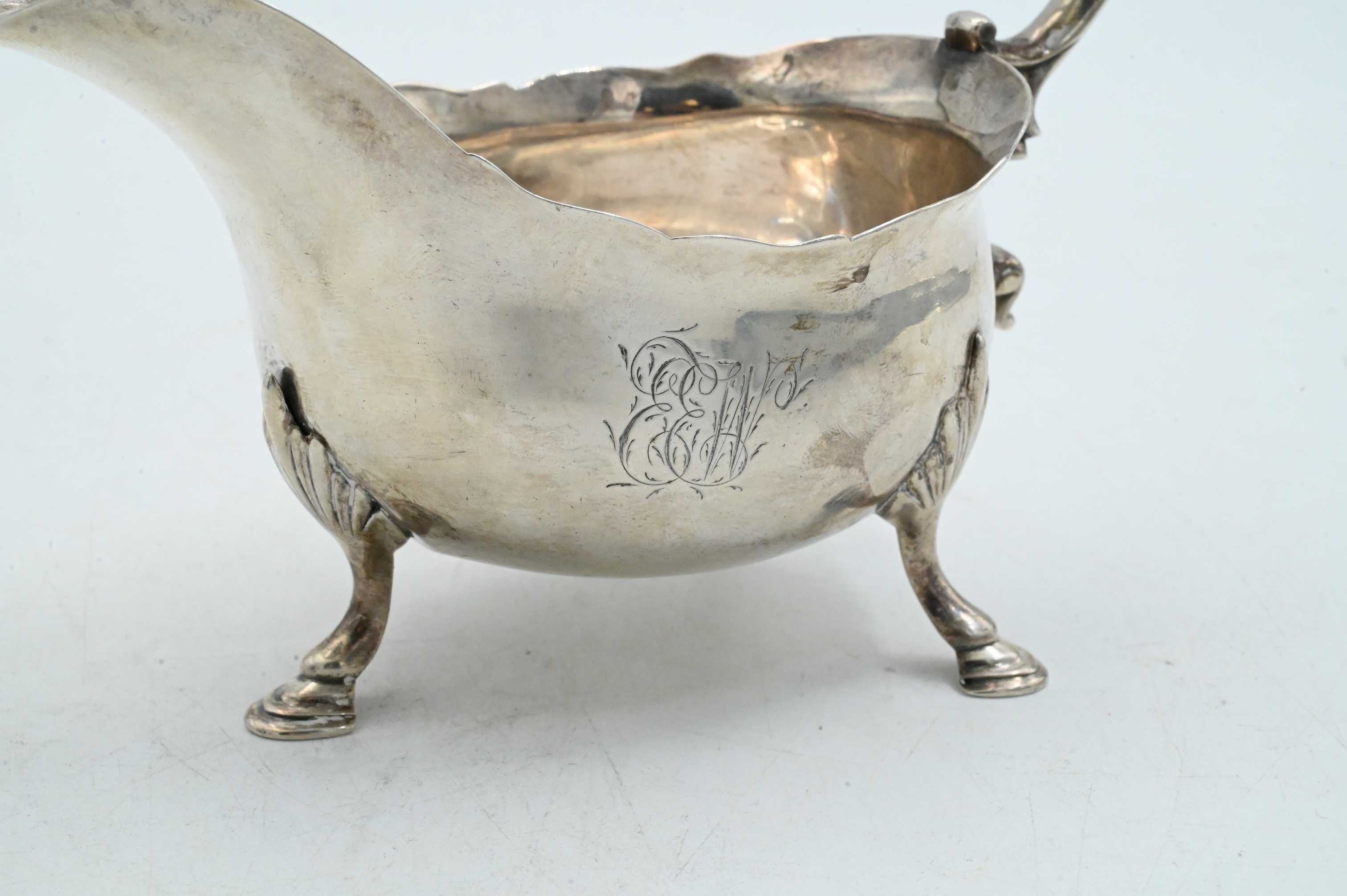 George III sterling silver sauce boat of oval form with scalloped rim, scroll handle, and three stepped feet with shell terminals. Fully hallmarked on base for William Shaw, London, circa 1760.