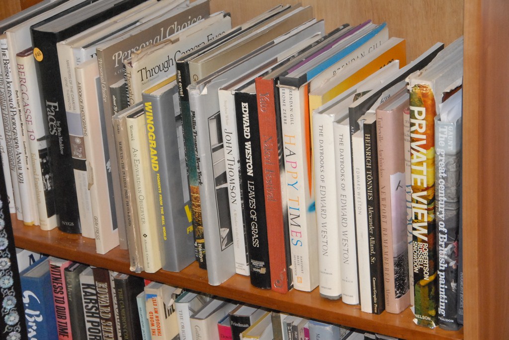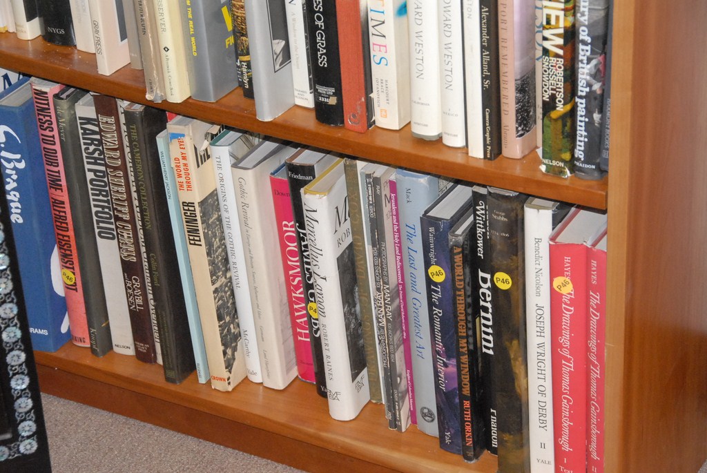 Three shelves of coffee table books.