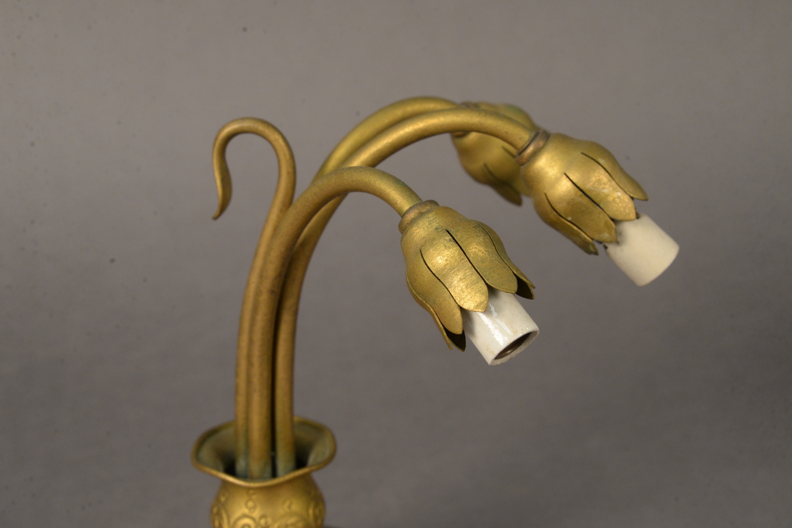 Tiffany Studios Three-Light-Lily Gilt Bronze Desk/Piano Lamp, without shades, marked: Tiffany Studios, New York, 320, to the underside, height 9 inches.
