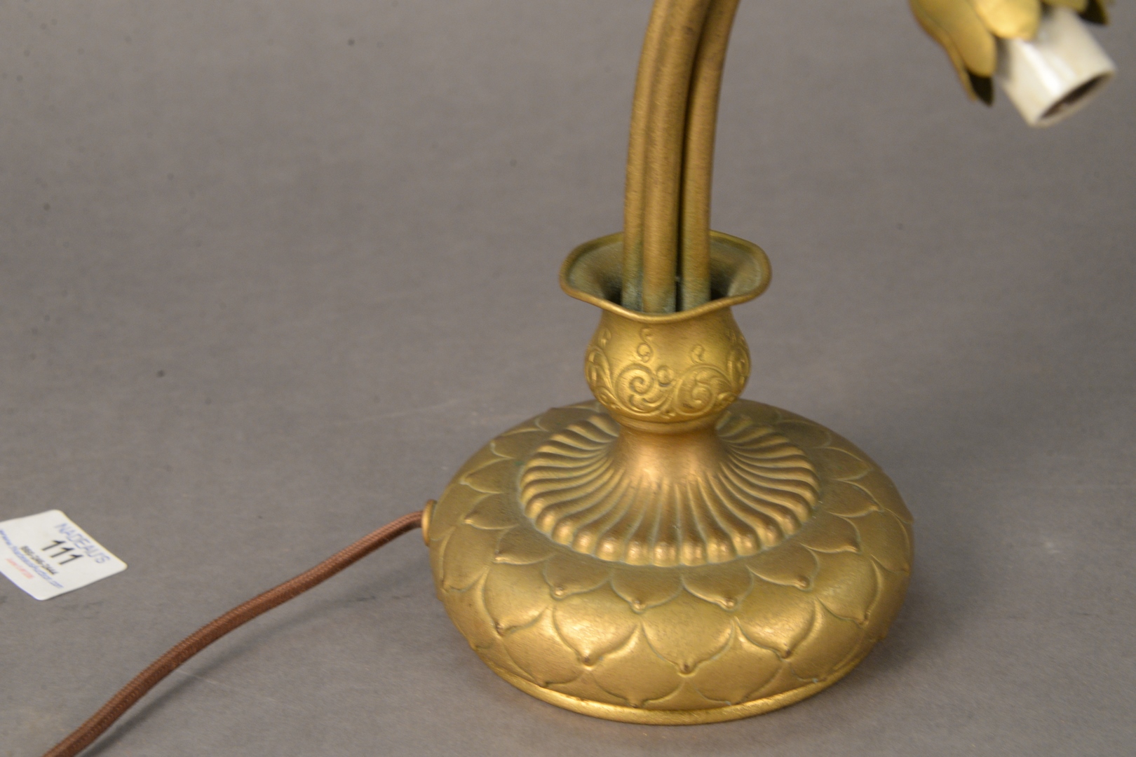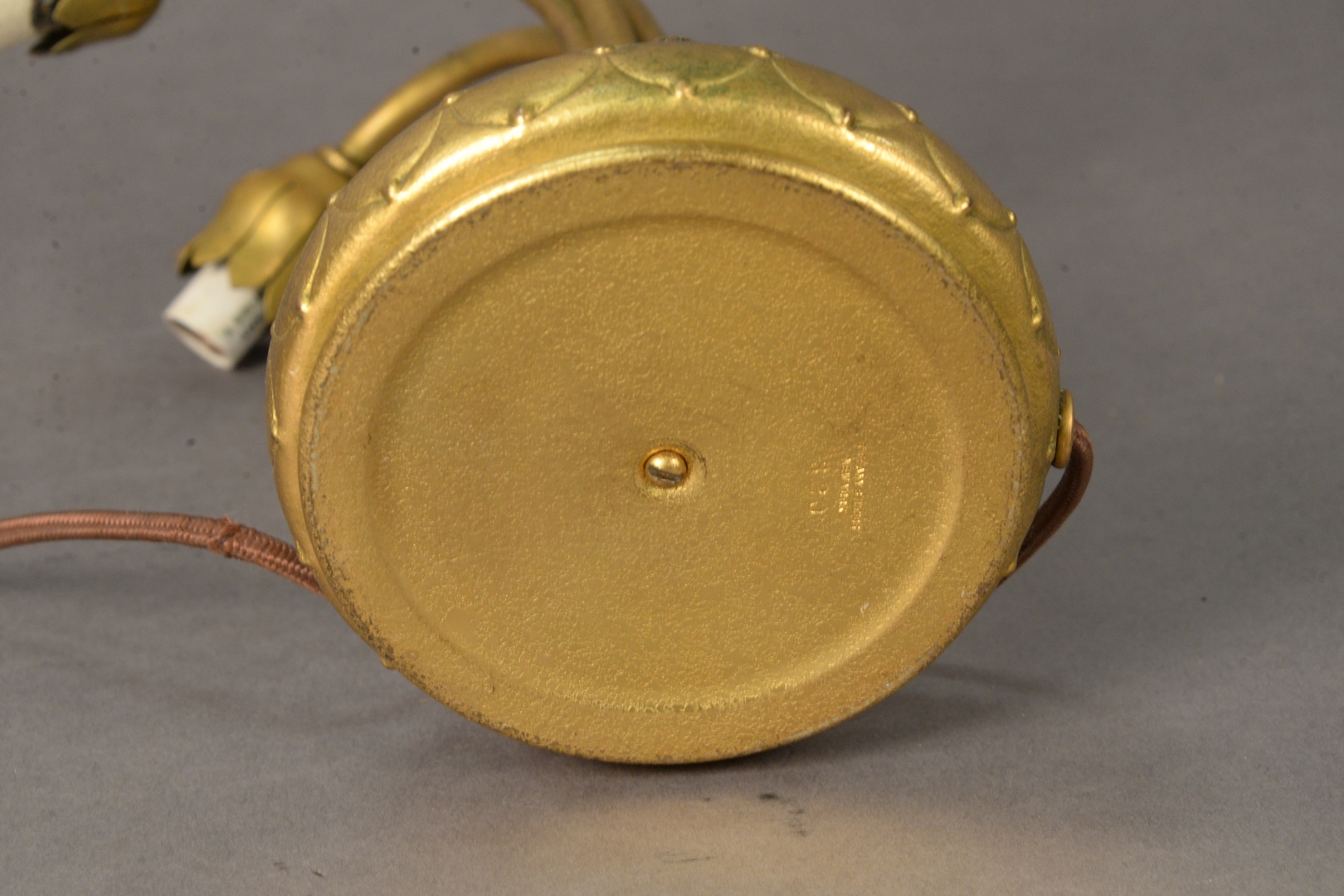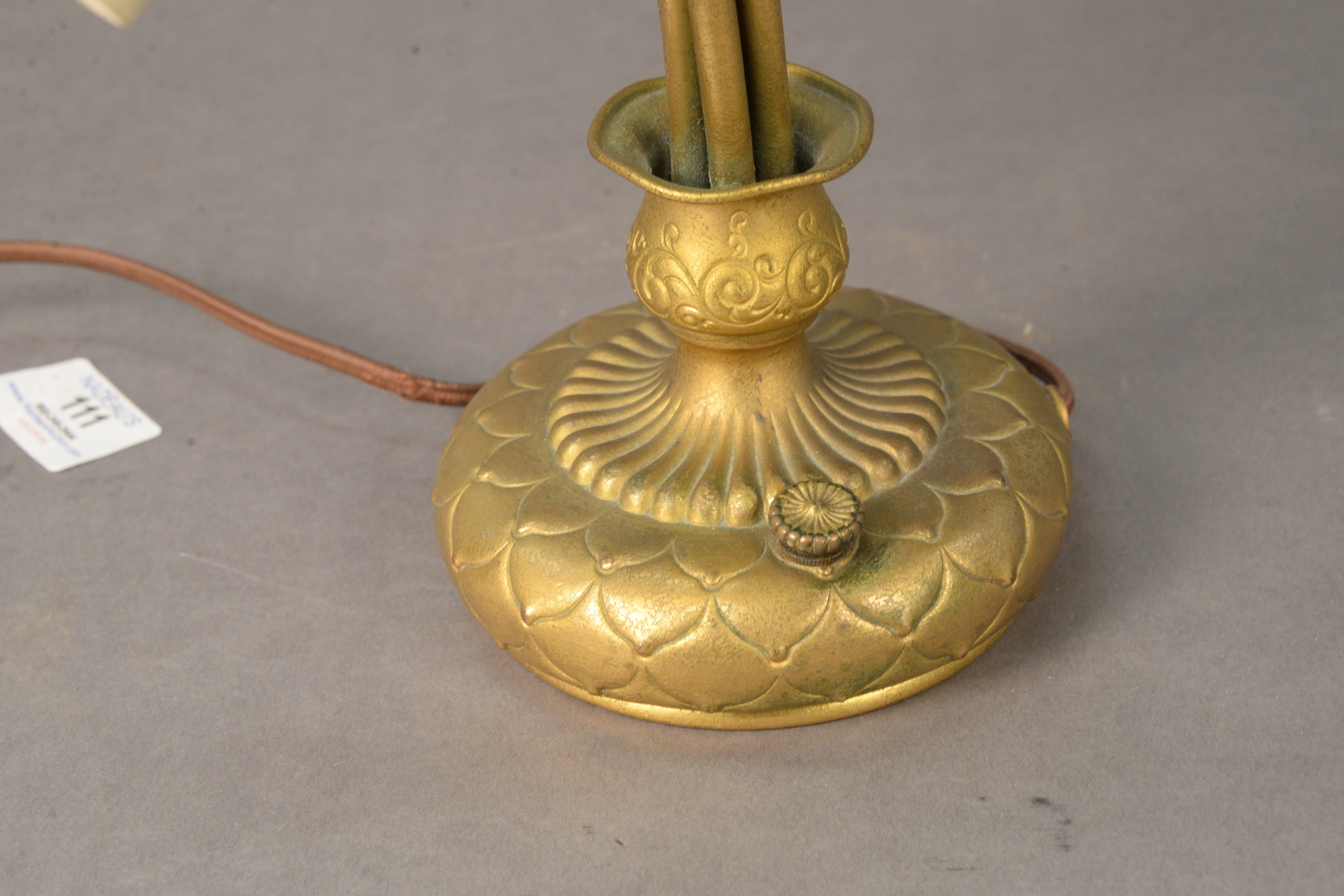 Lot 111: Tiffany Studios Three-Light-Lily Gilt Bronze Desk/Piano Lamp, without shades, marked: Tiffany Studios, New York, 320, to the underside, height 9 inches.