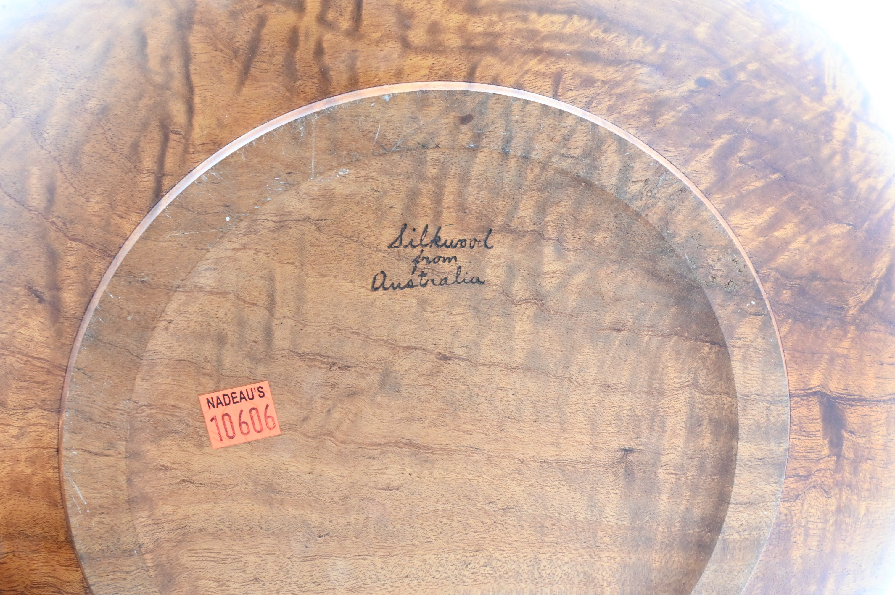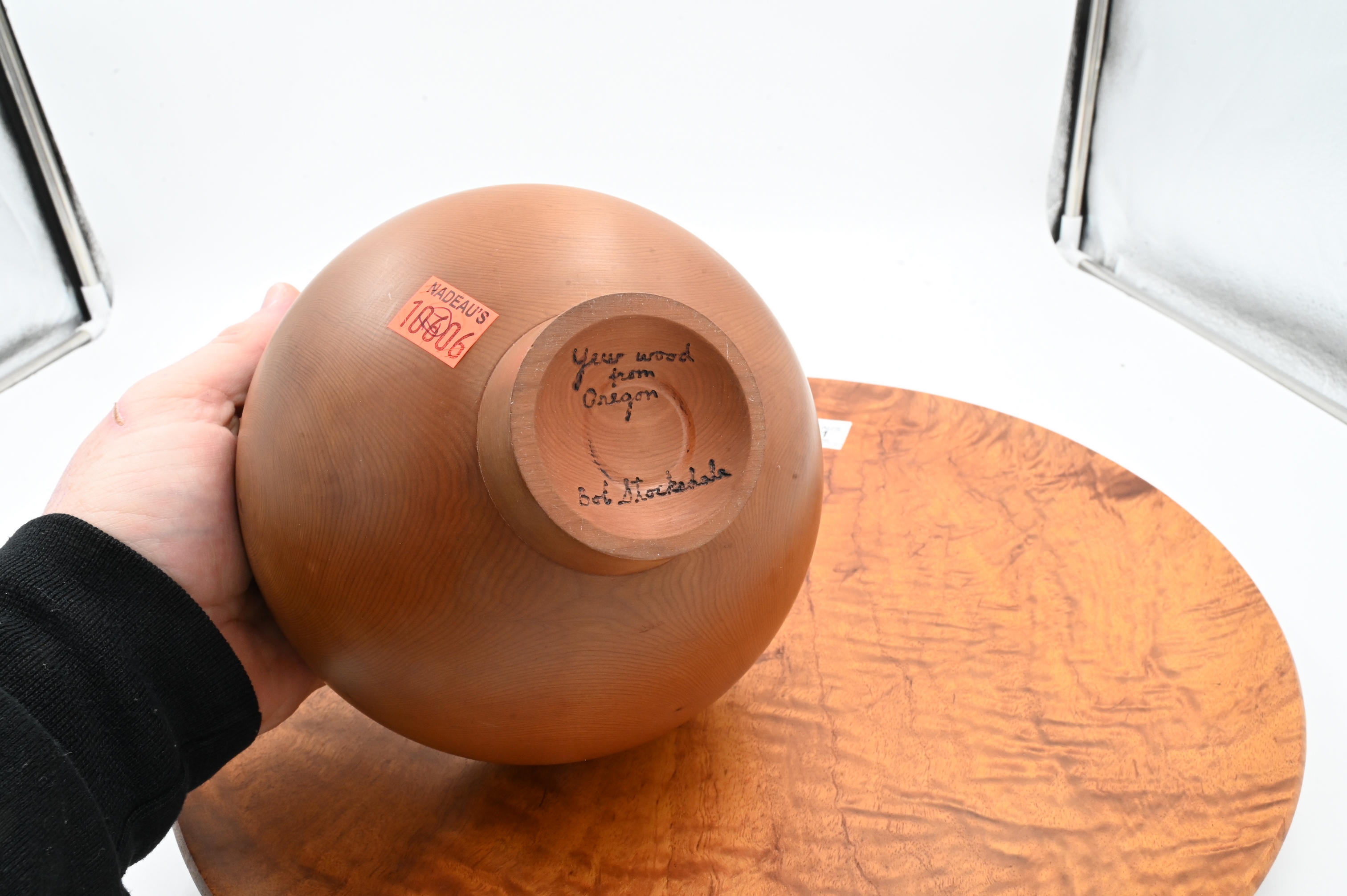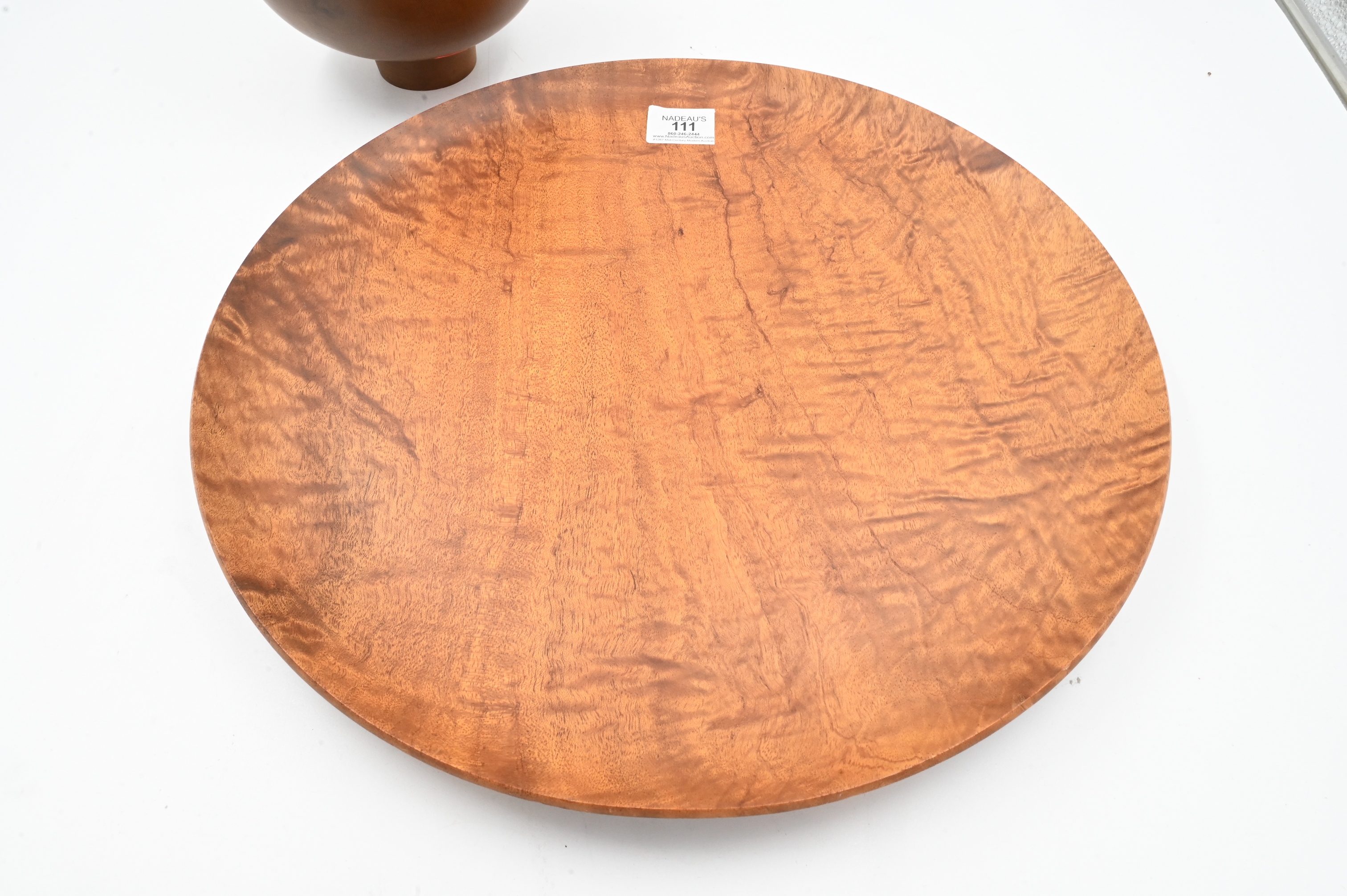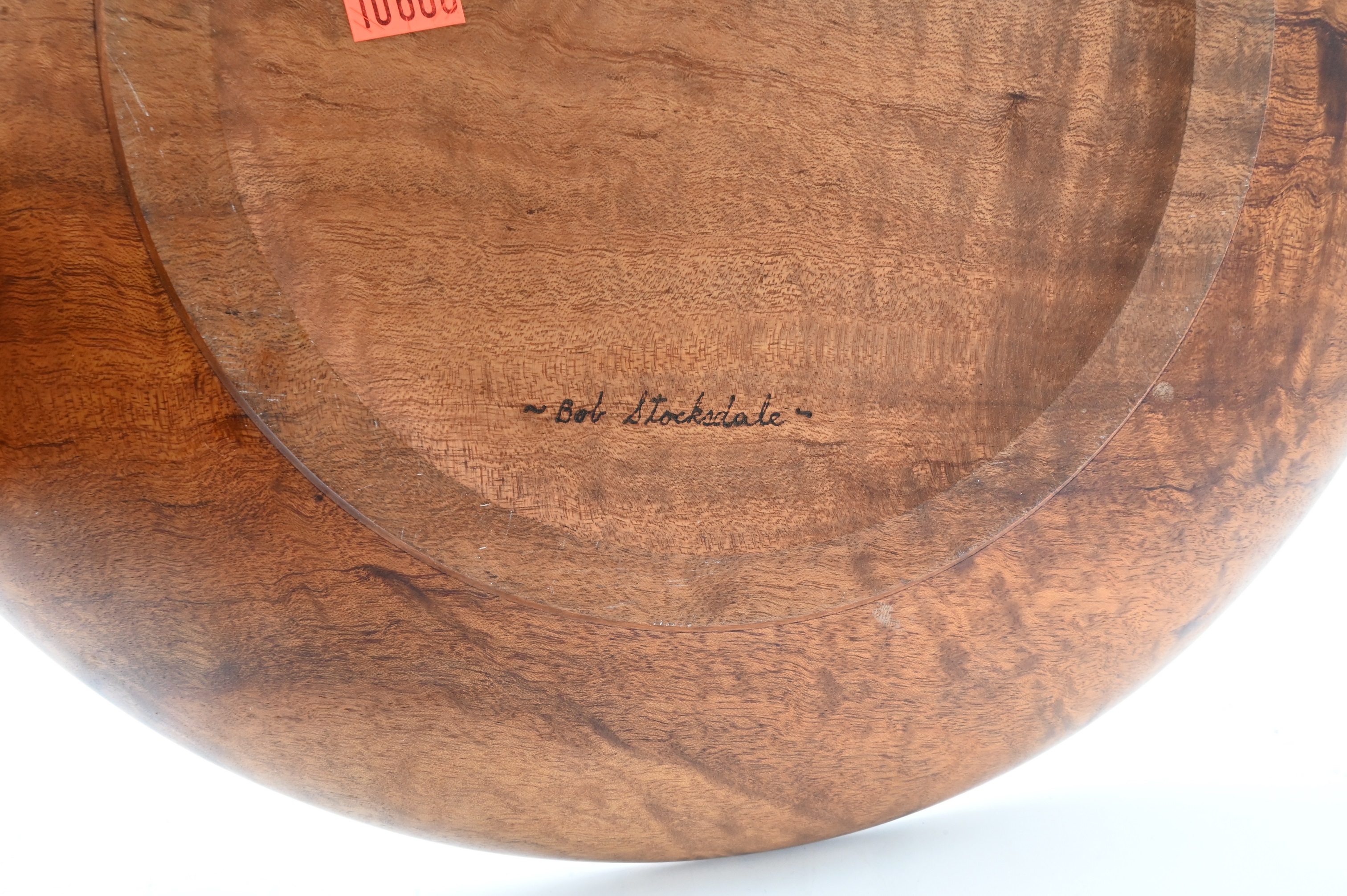 to include Oregon yew wood turned bowl rising on footed based, Australian silkwood platter on slightly raised base, each inscribed with wood variety and signed Bob Stocksdale