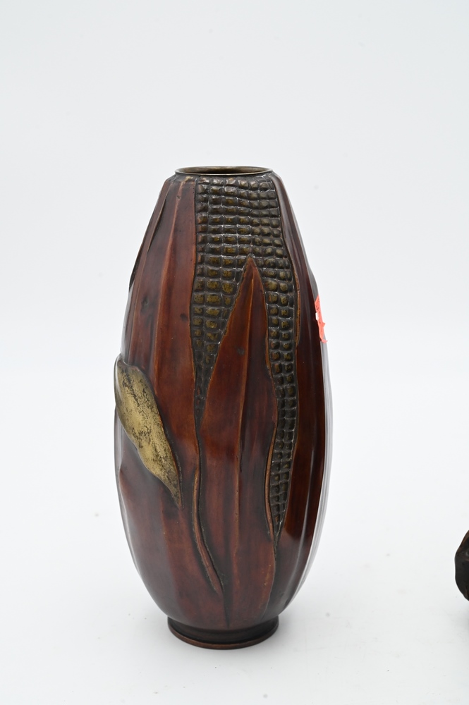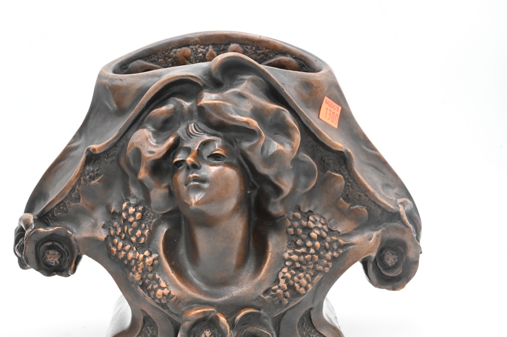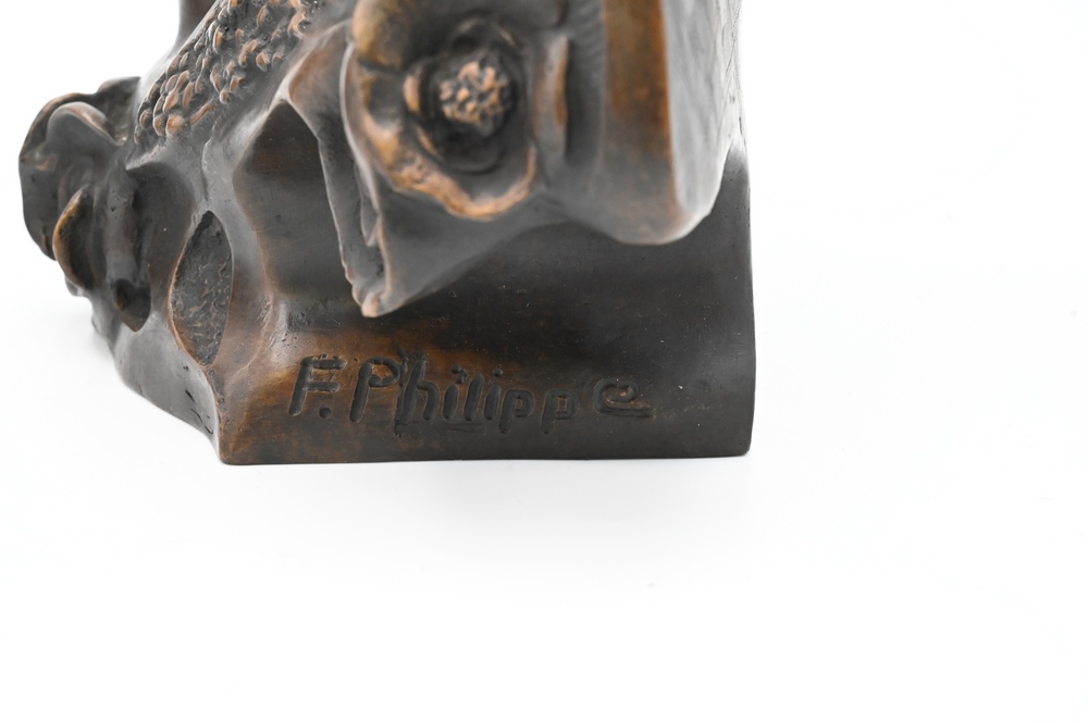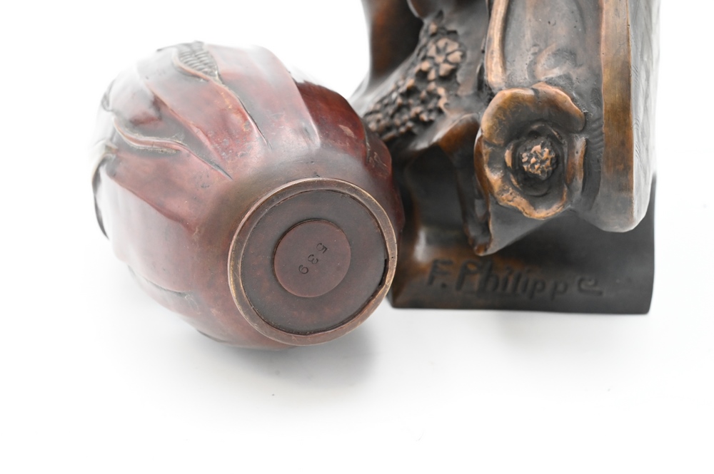 Two F. Philippe Bronzes, to include a Art Nouveau bust of a woman, height 9 inches; along with a bronze vase in the form of a corn, height 8 3/4 inches.