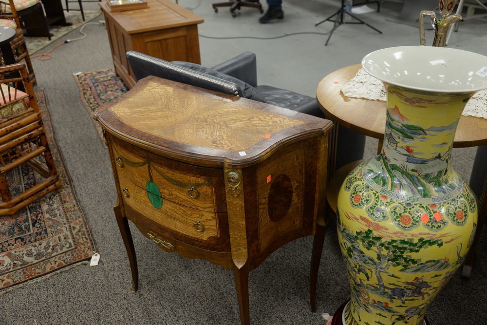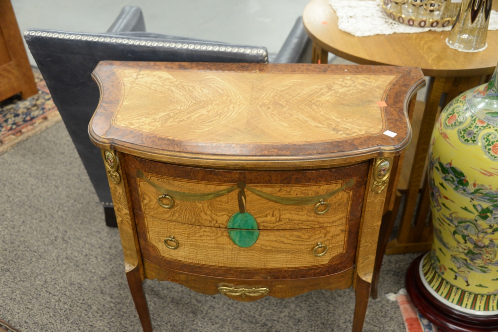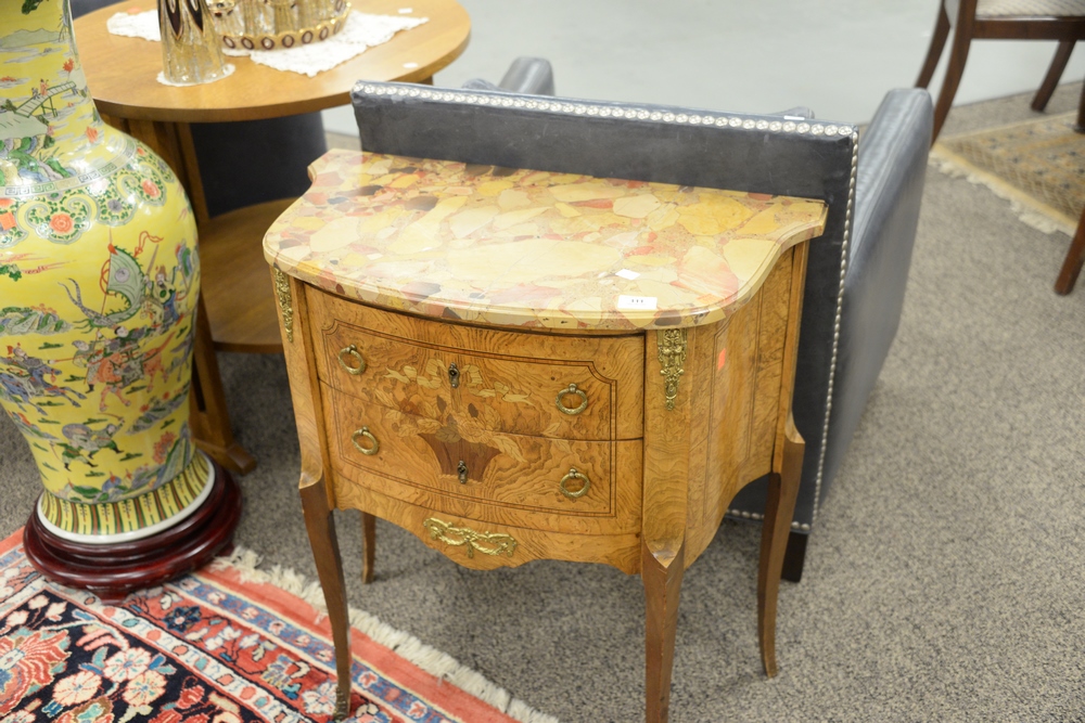 Lot 111: Two Louis XV Style Commodes, one having marble top, height 32 and 30 inches, top 15″ x 26″ and 16″ x 31″.