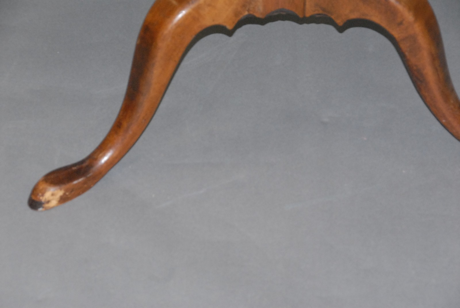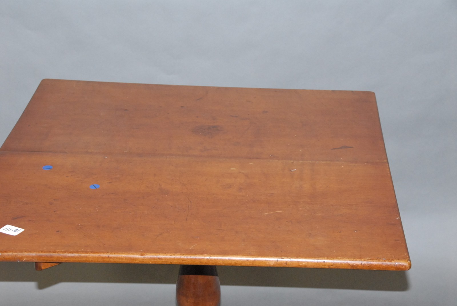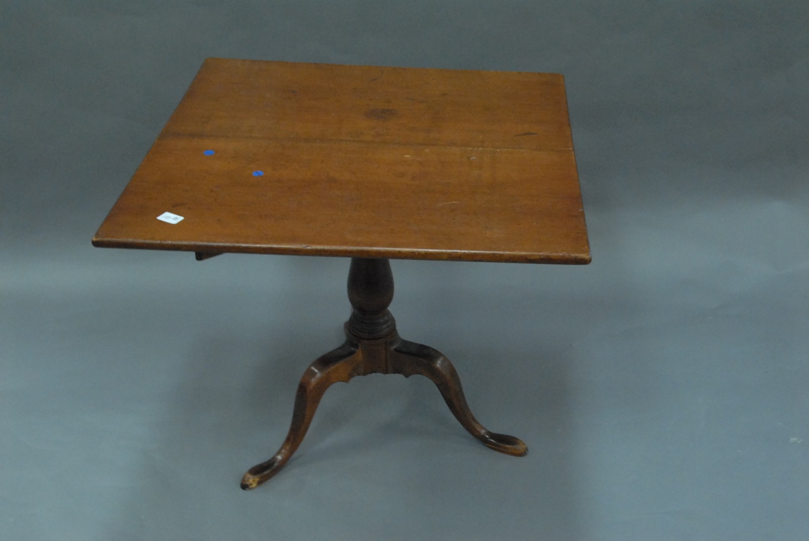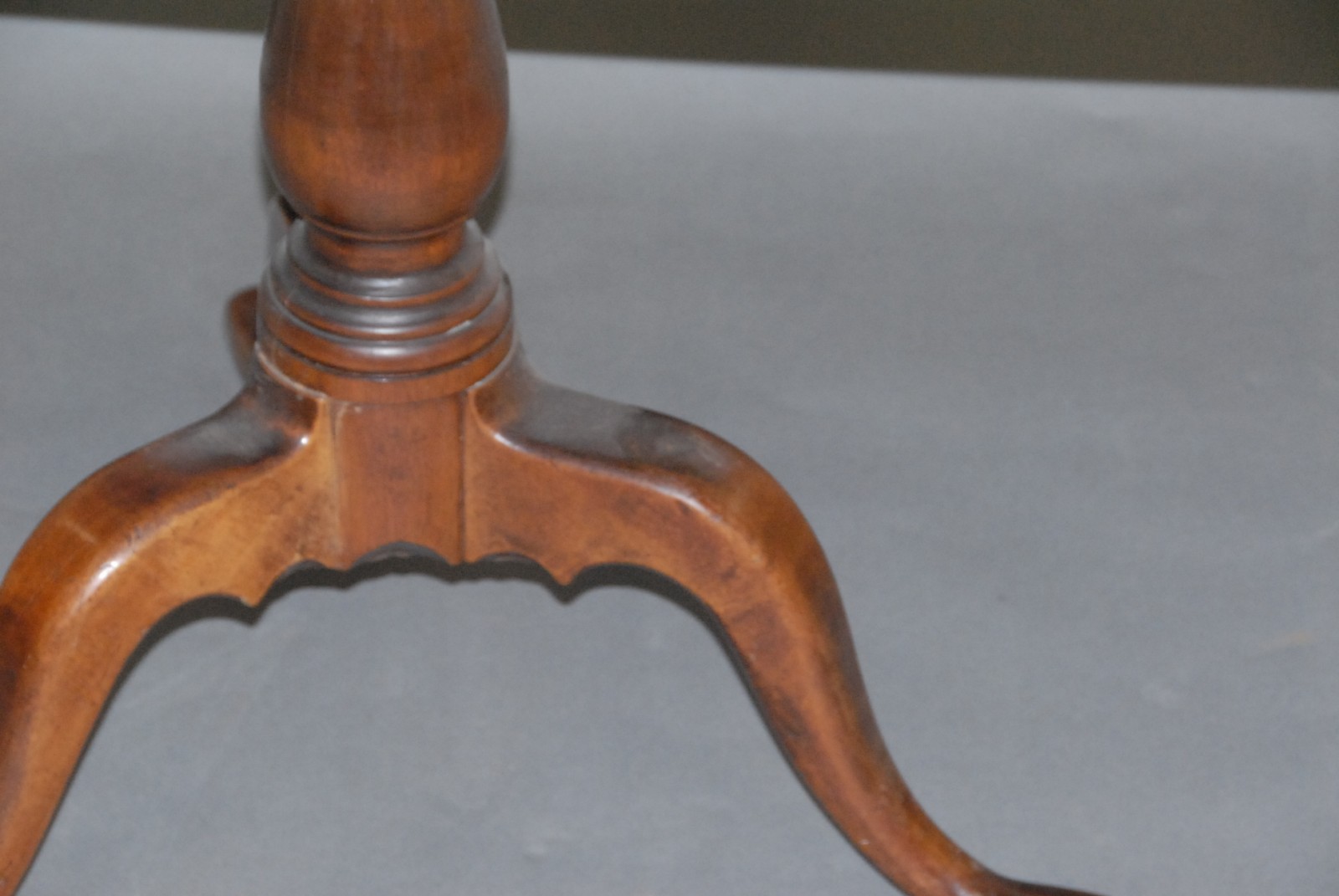 Federal square tip tea table on turned shaft with tripod base ending in snake feet.