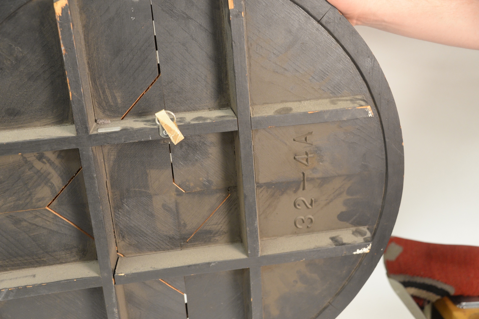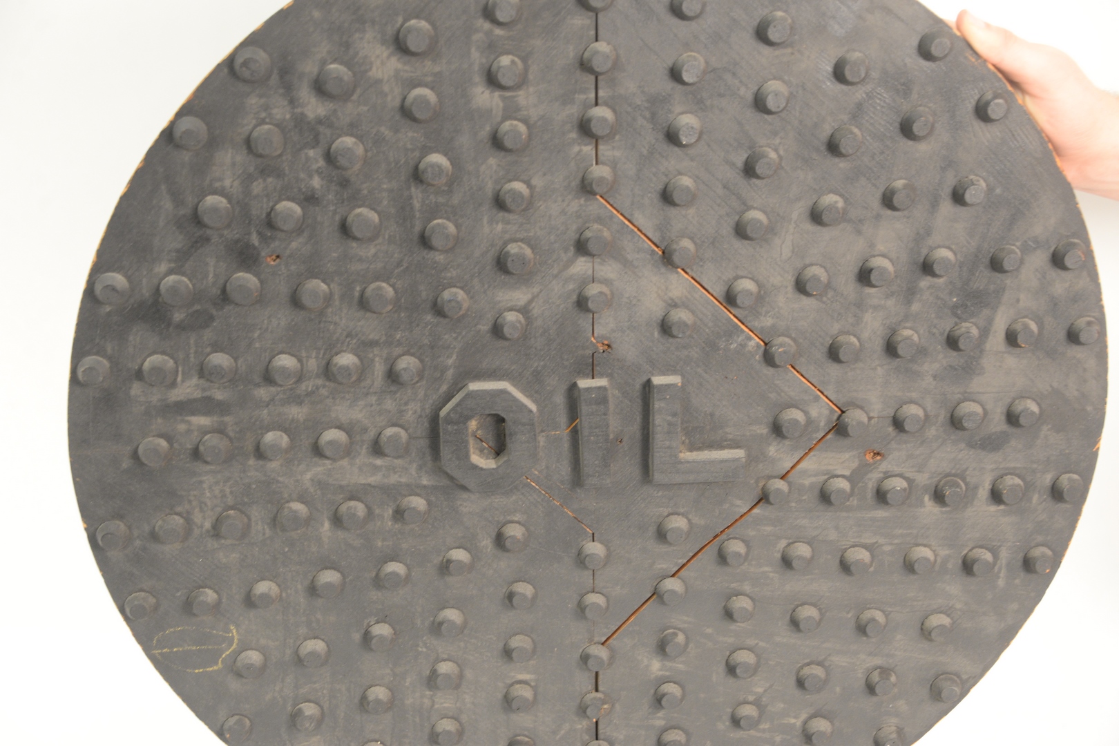 Lot 112: American Painted Pine Foundry Mold for manhole cover from Taylor Iron works, Macon, Georgia, diameter 26 3/4 inches.