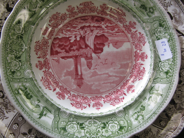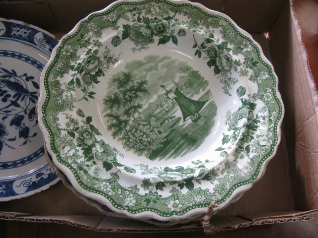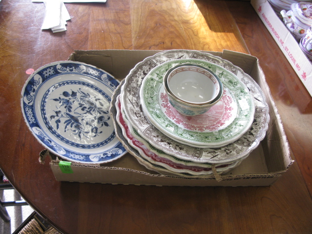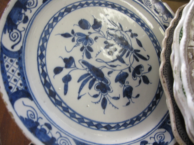 Box lot of eleven pieces, eight Staffordshire plates, one Staffordshire cup, delft plate, and Export cup